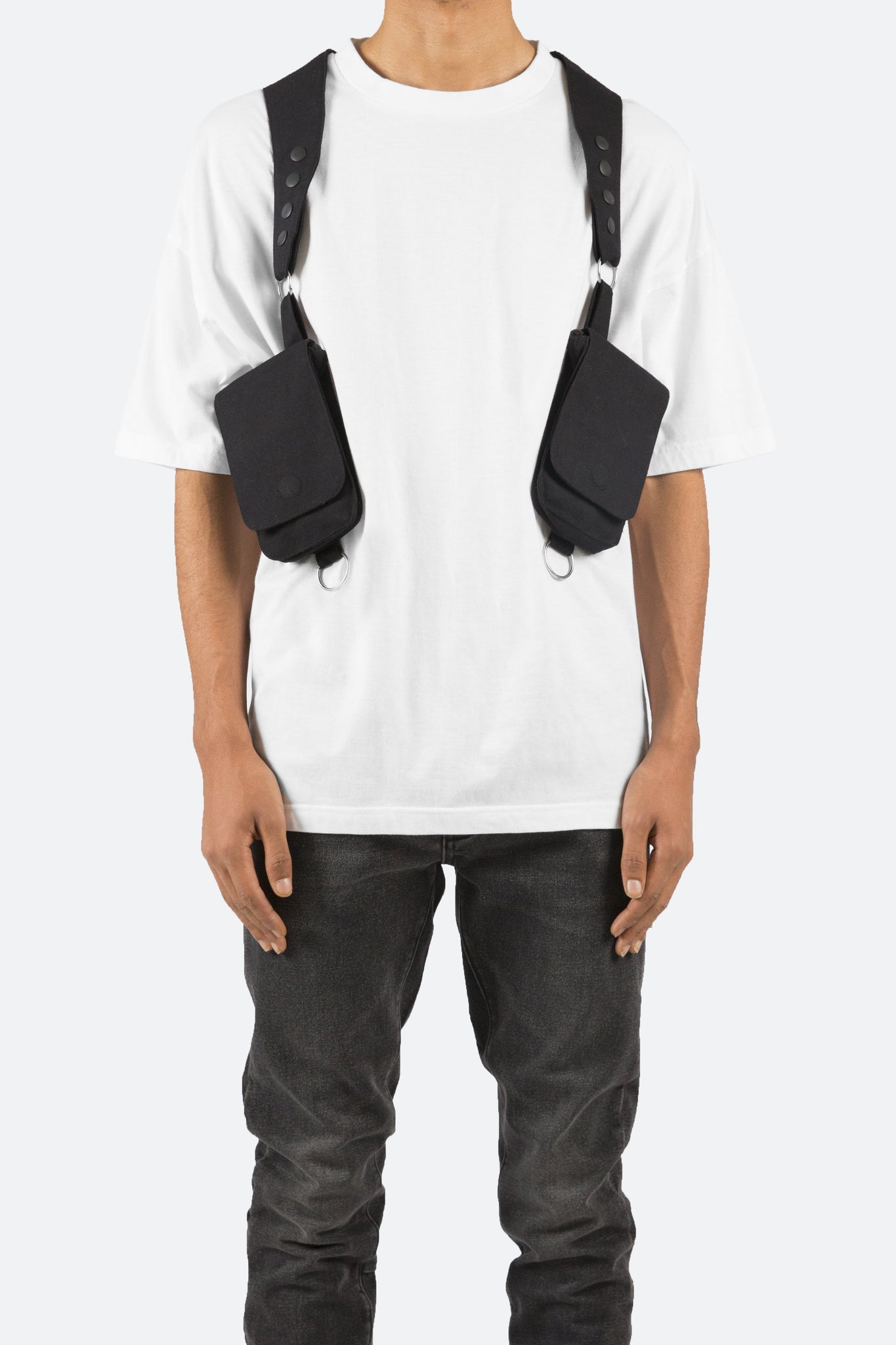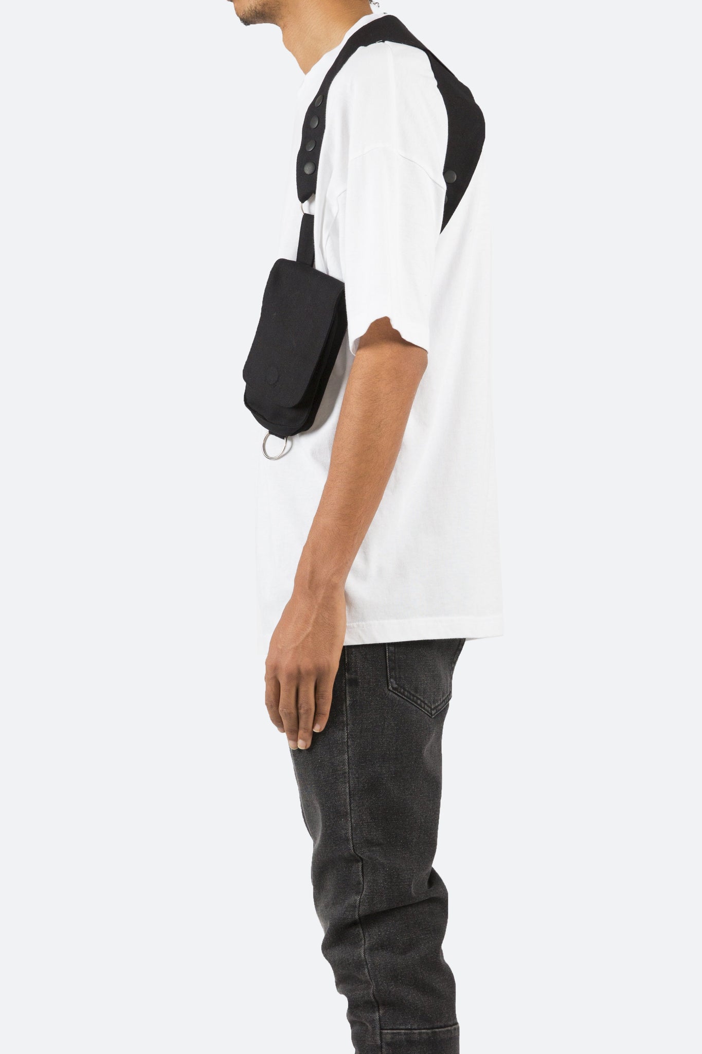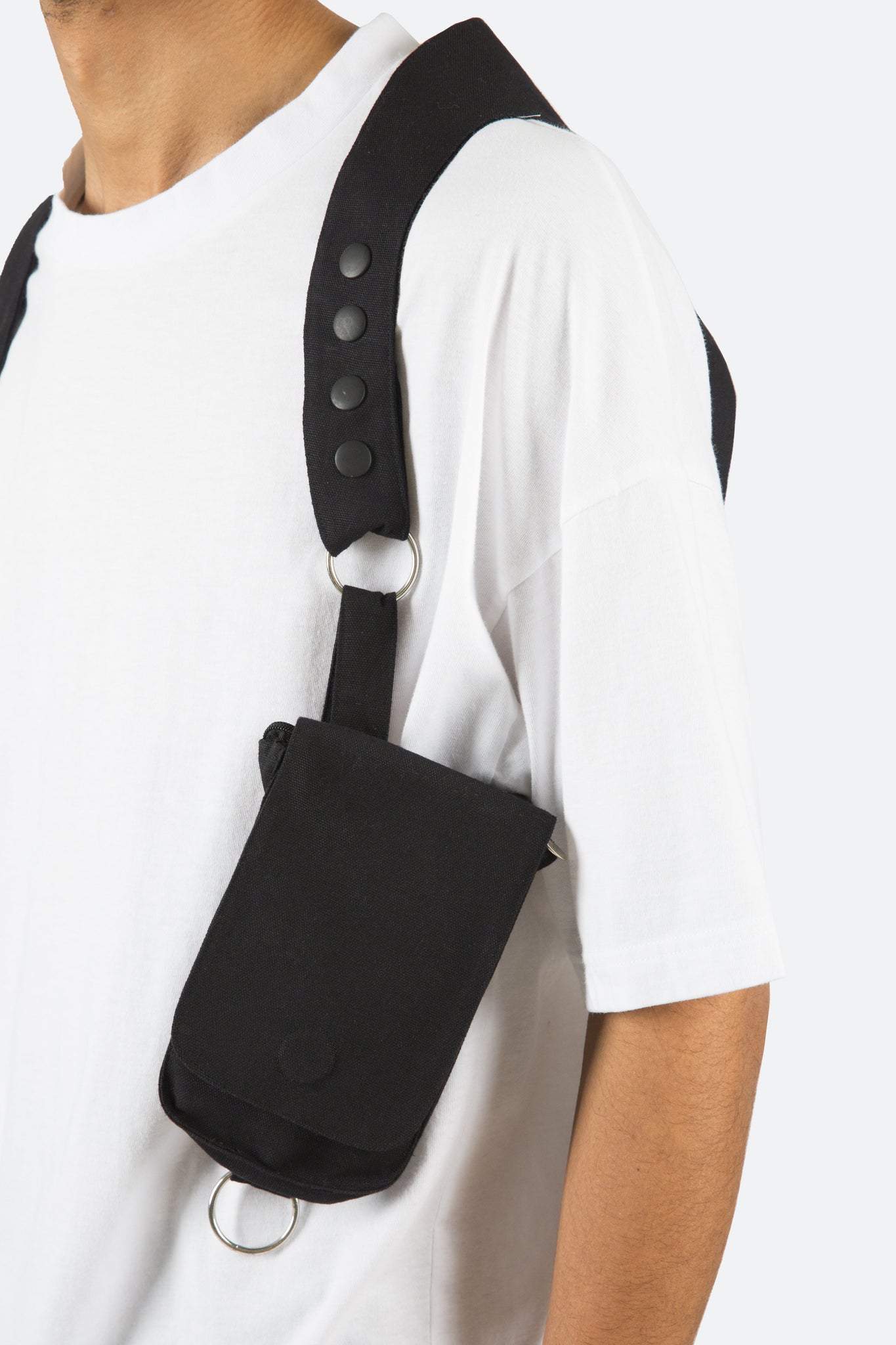 the Tactical Shoulder Bag is constructed from polyester twill and features two separate compartments that are connected around the arm and across the back with an elastic band.