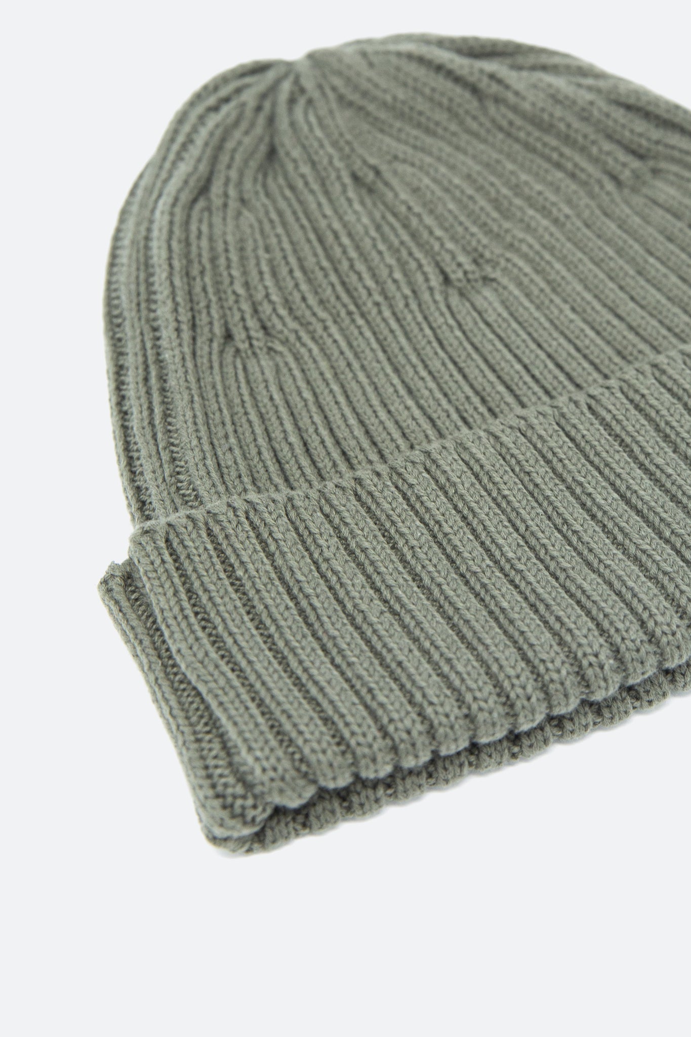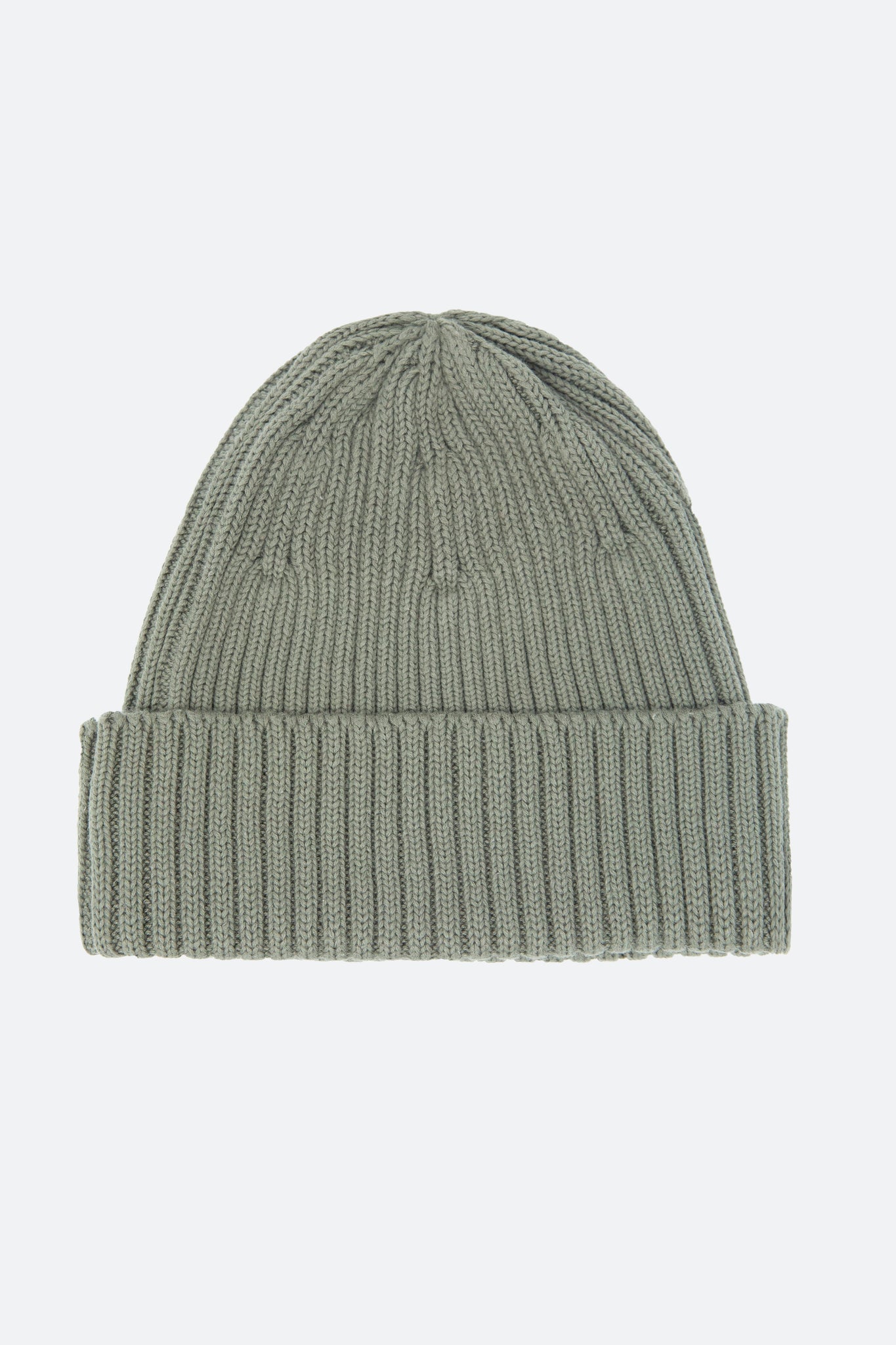 the Ribbed Beanie is constructed from cotton and features a ribbed knit.