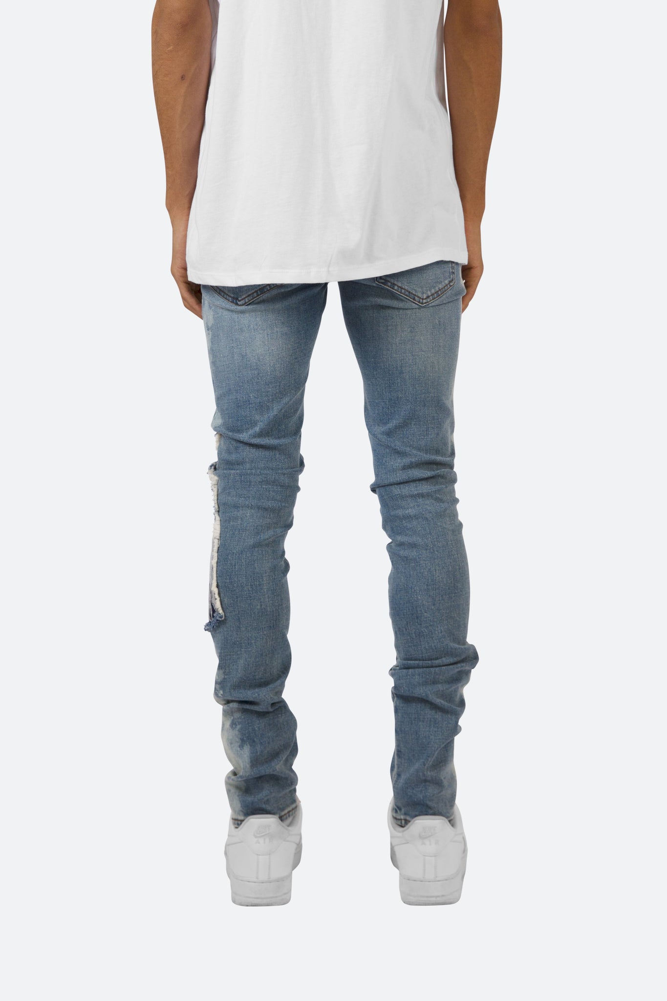 the X161 Stretch Denim is designed with our new X fit which is skinny throughout with an extended inseam for stacking, and featuring a medium wash, bleach splatter, bandana repaired distressing, and finished with grim reaper embroidery.