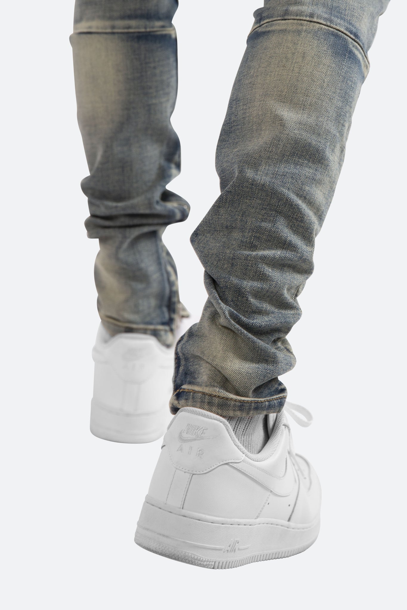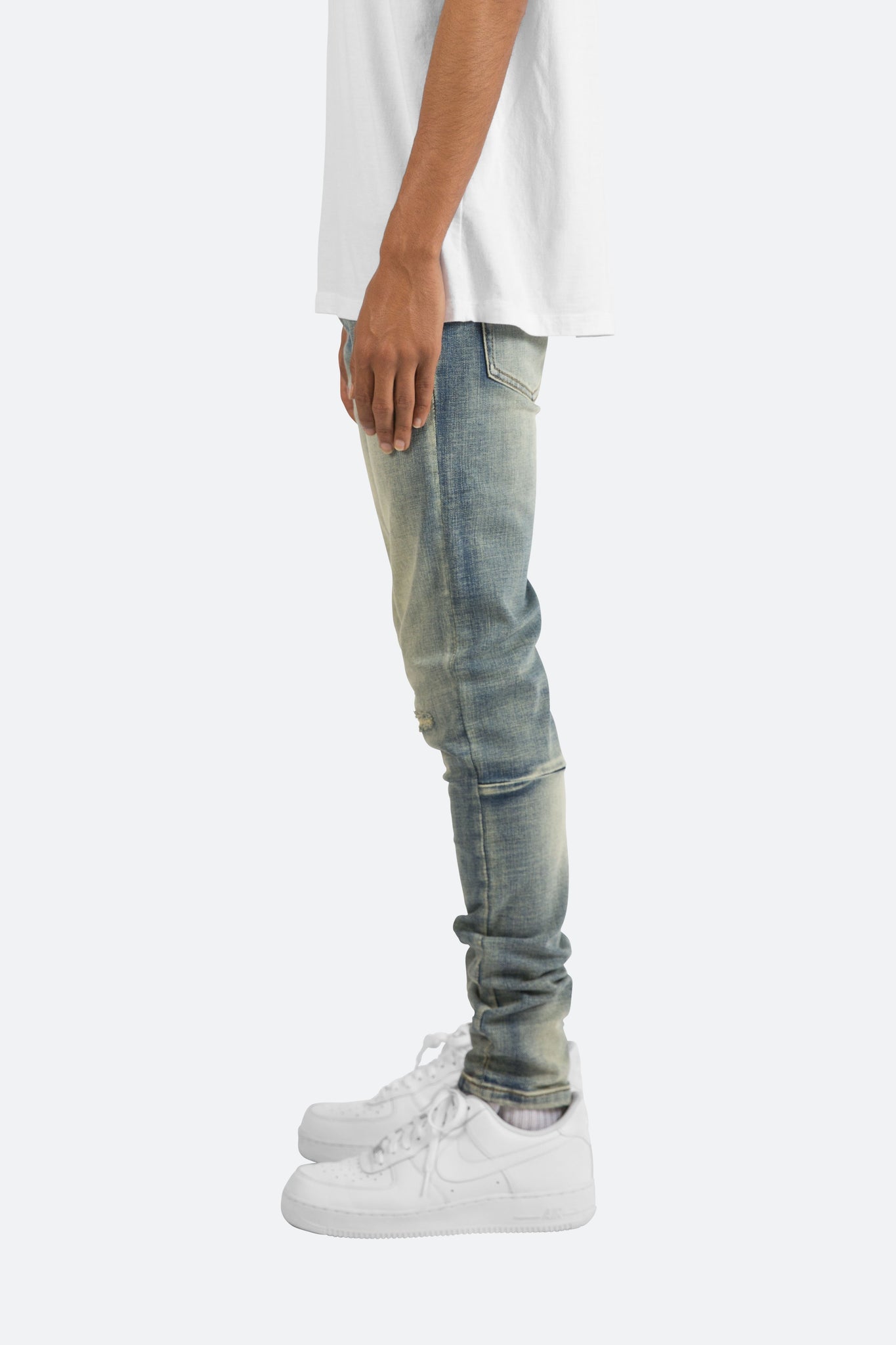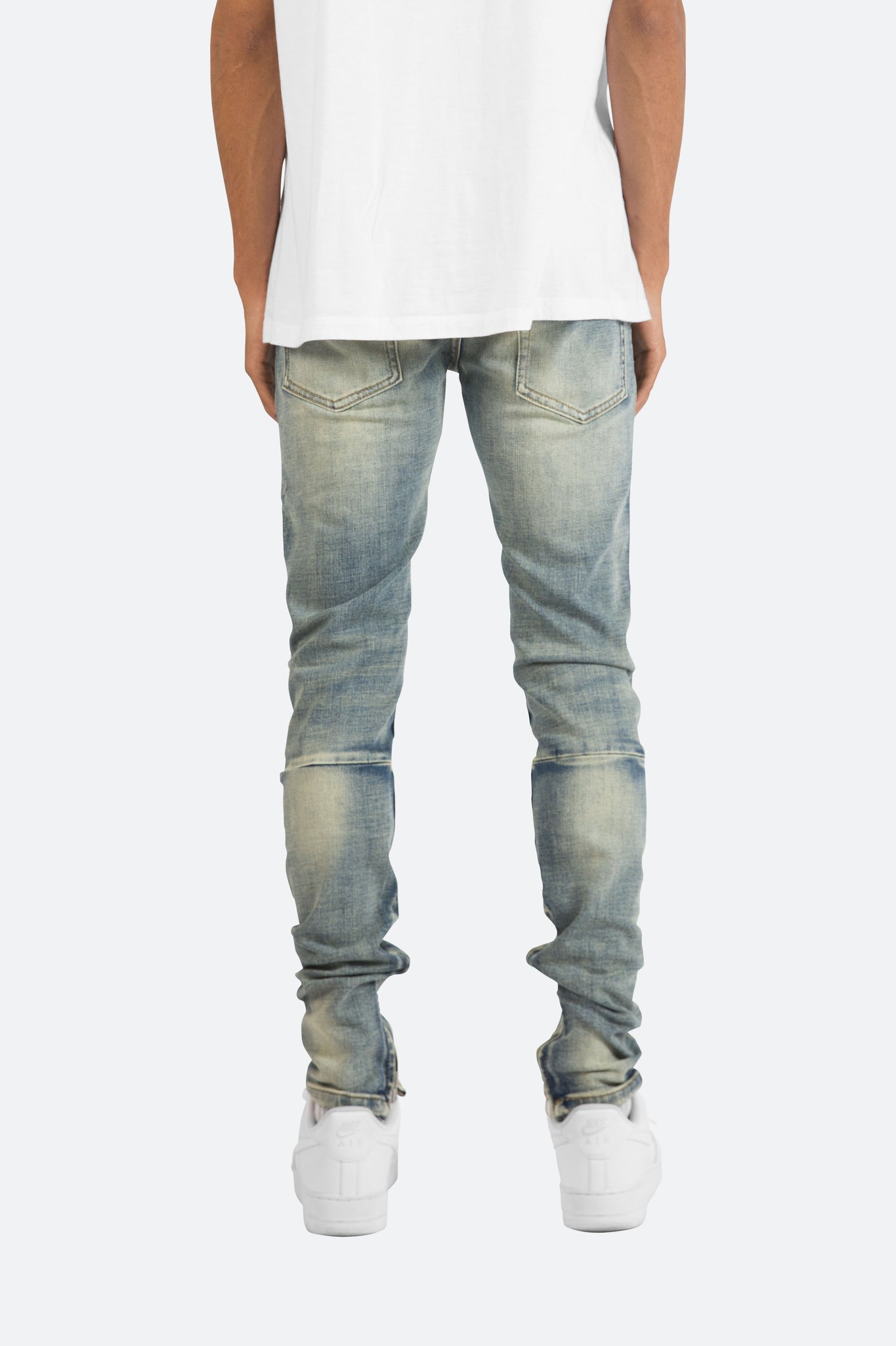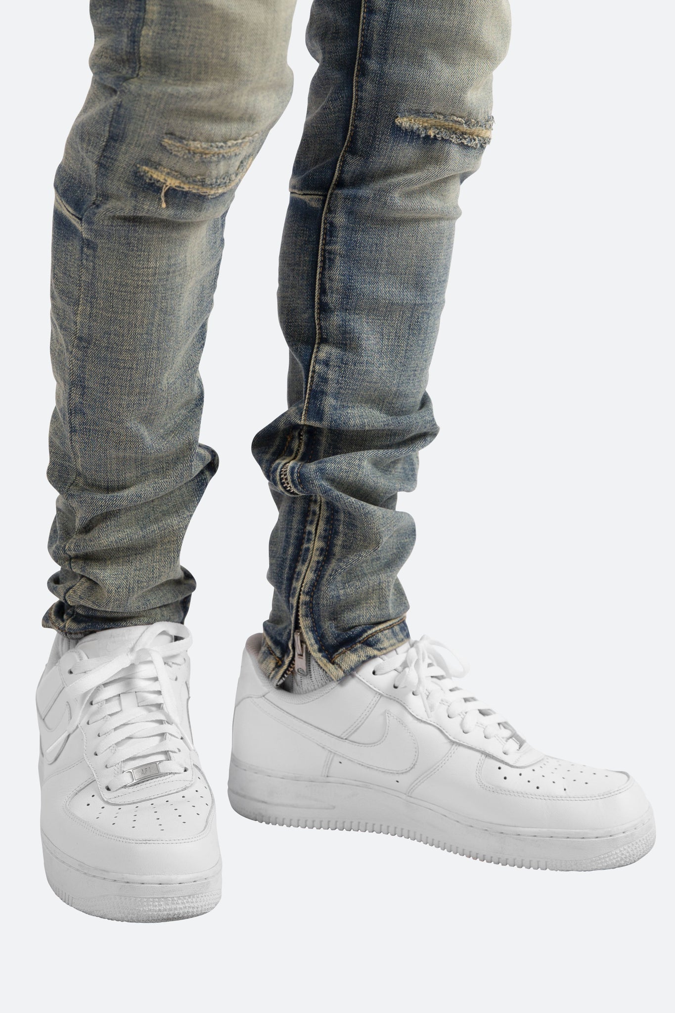 developed in los angeles, the blue m34 denim is designed with a relaxed fit through the thigh that tapers from the knee to the ankle, with distressed-and-repaired details at the knees and a medium wash throughout, finishing off with a 10" concealed zipper on the inseam and a rear calf panel for a carefully optimized fit.