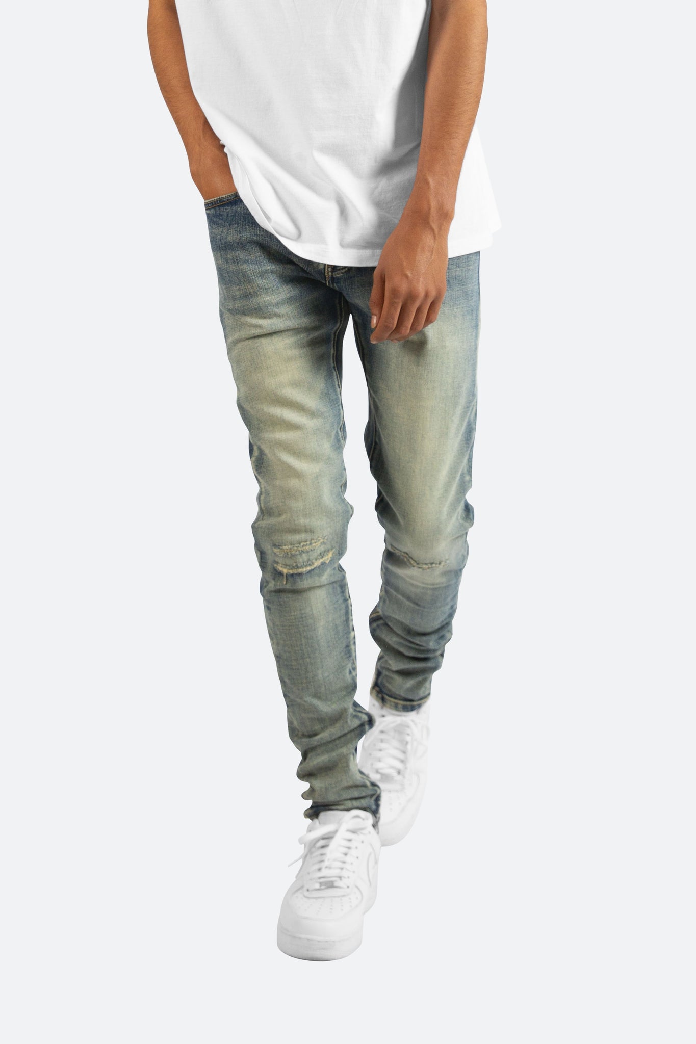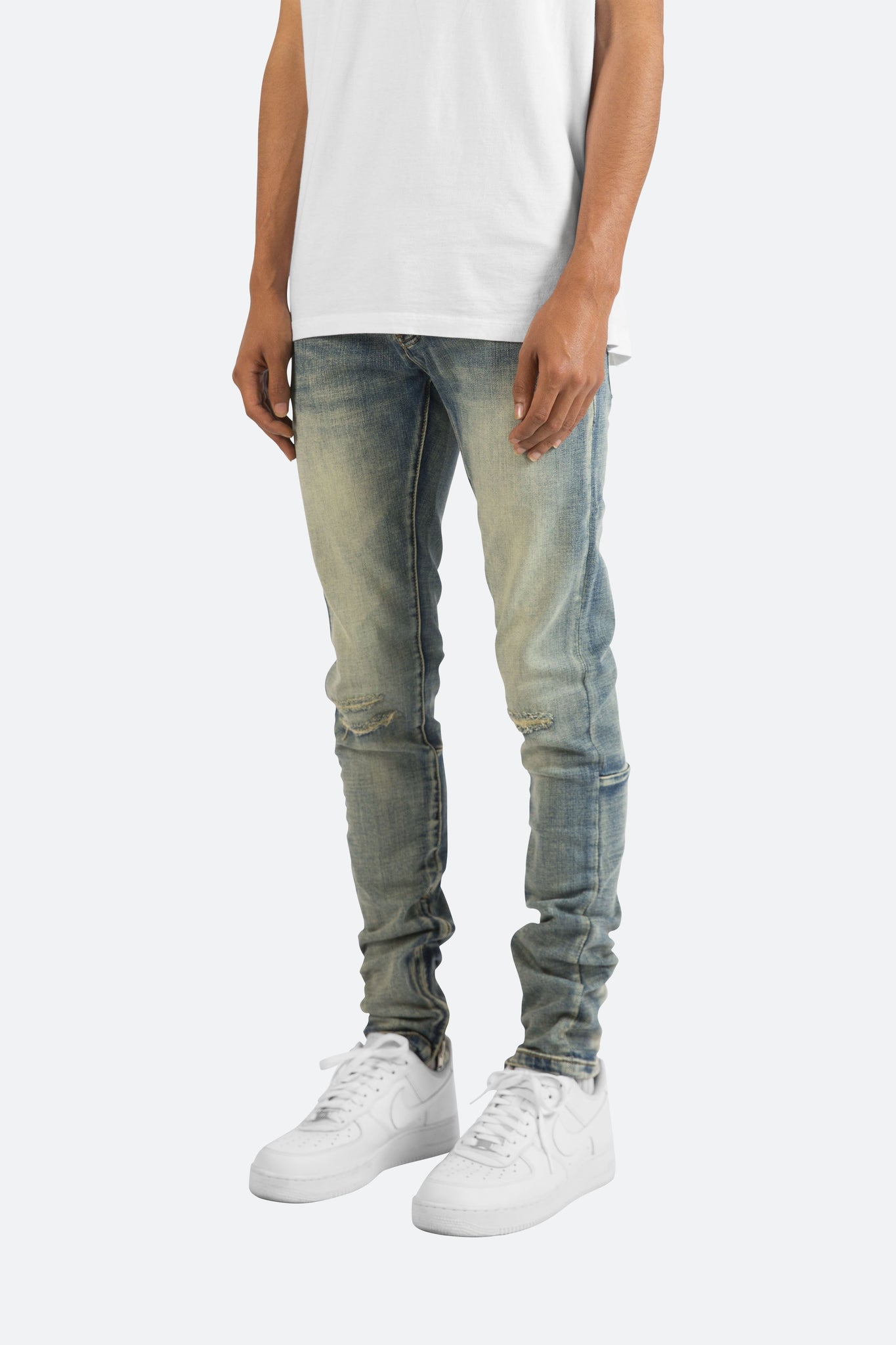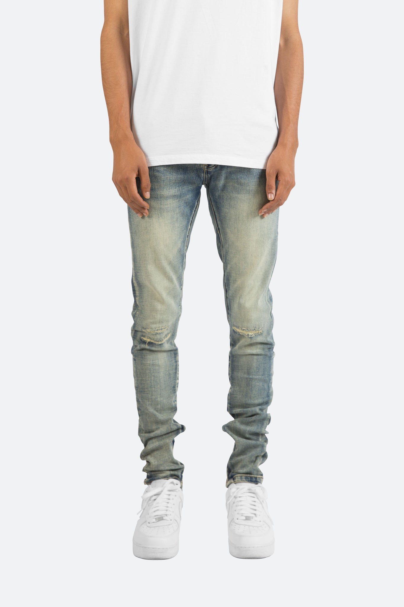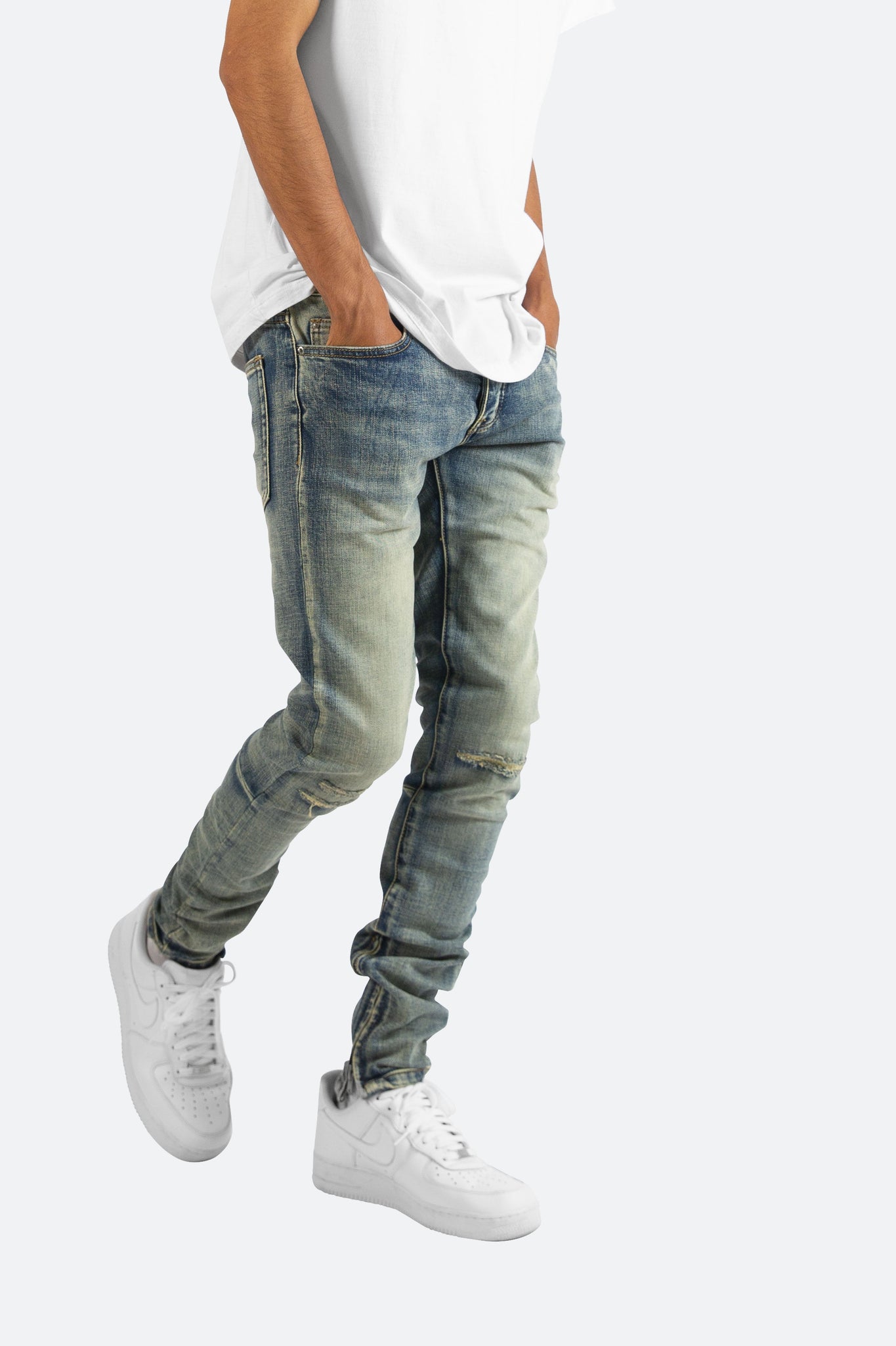 developed in los angeles, the blue m34 denim is designed with a relaxed fit through the thigh that tapers from the knee to the ankle, with distressed-and-repaired details at the knees and a medium wash throughout, finishing off with a 10" concealed zipper on the inseam and a rear calf panel for a carefully optimized fit.