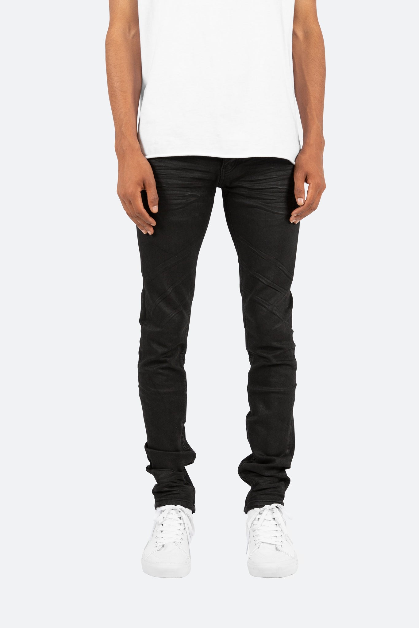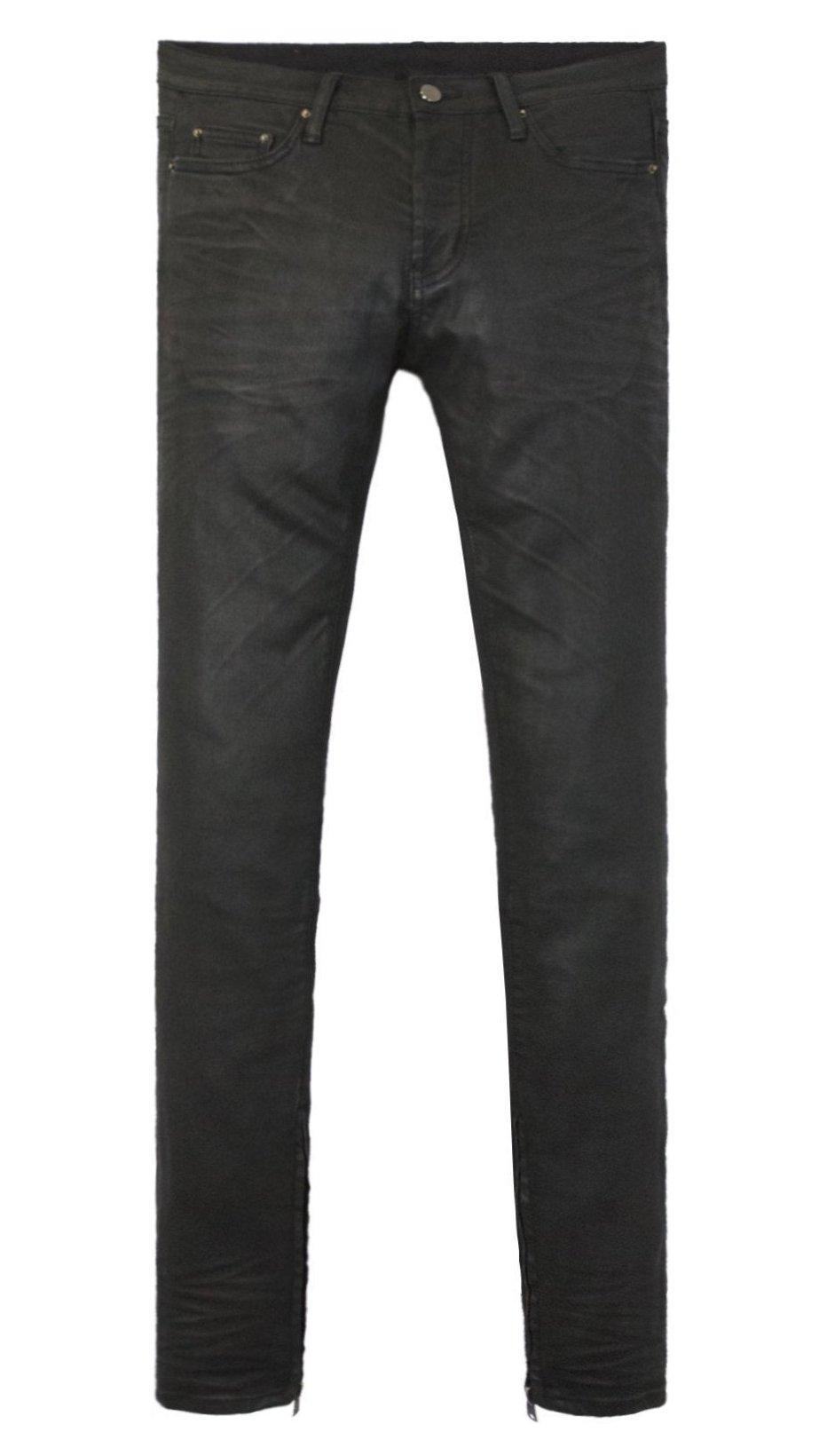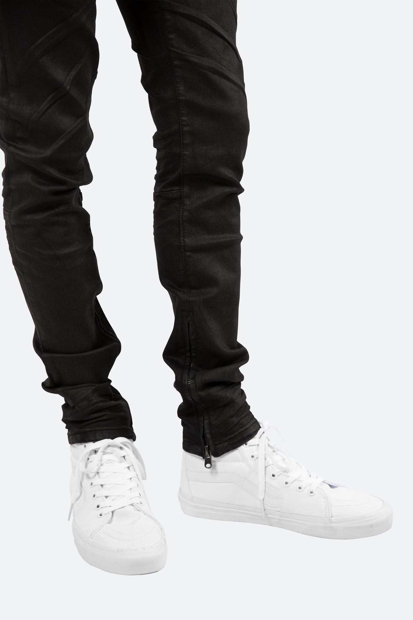 the black m44 stretch denim is designed with a relaxed fit through the thigh that tapers from the knee to the ankle with a wax coating throughout, finishing off with a 10" concealed zipper on the inseam and a rear calf panel for a carefully optimized fit.