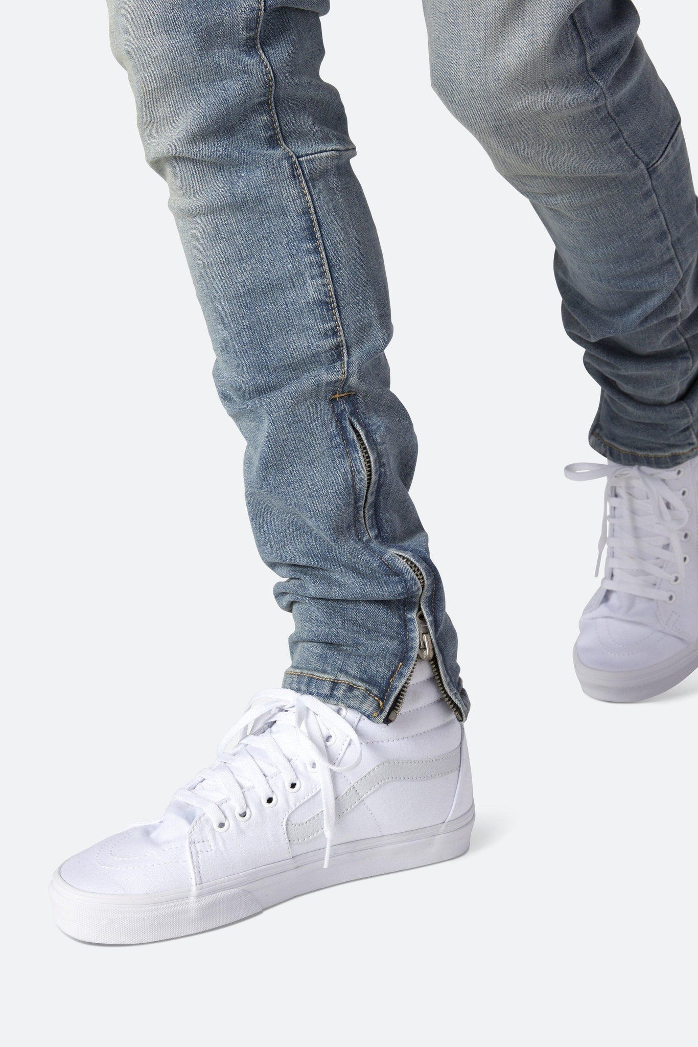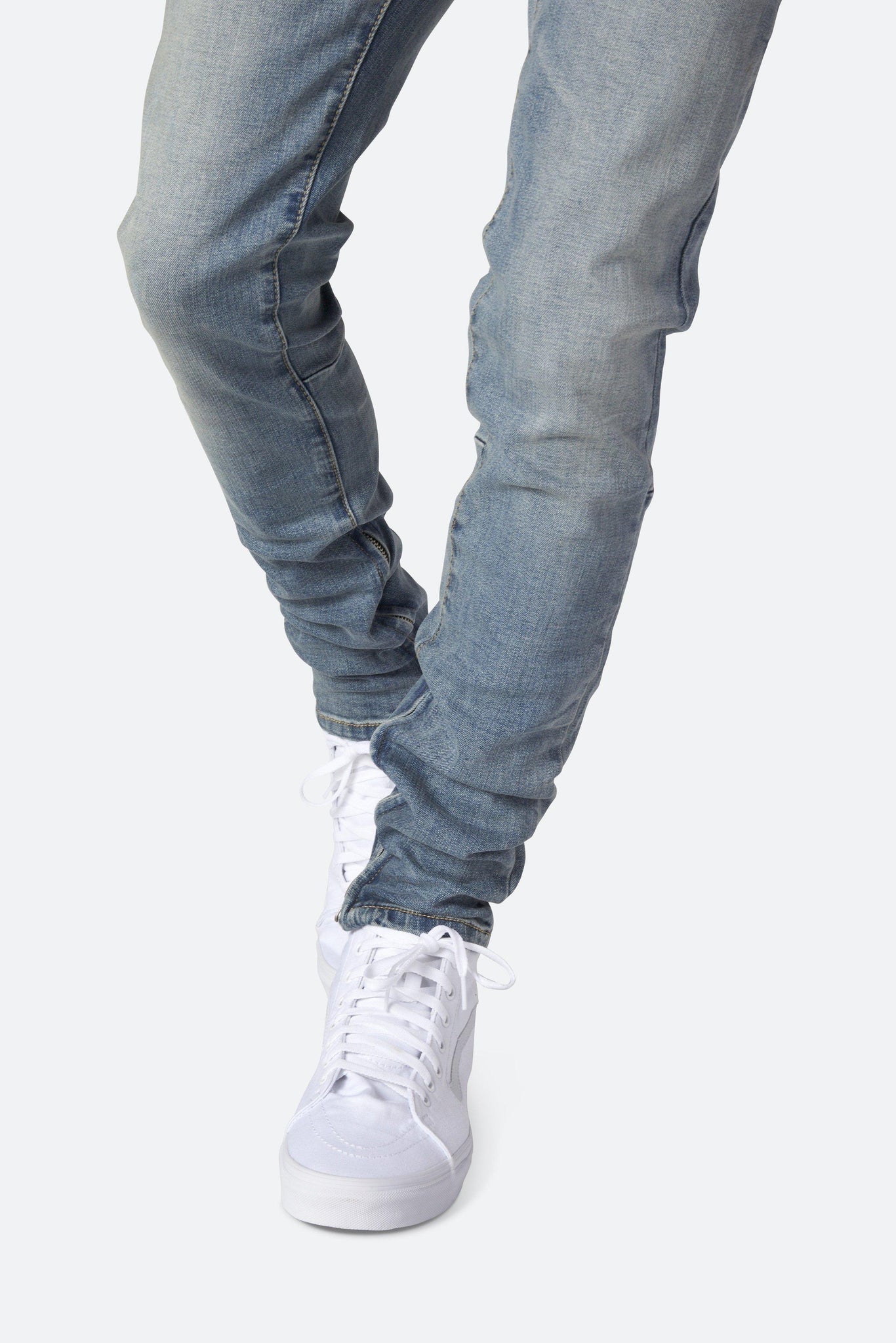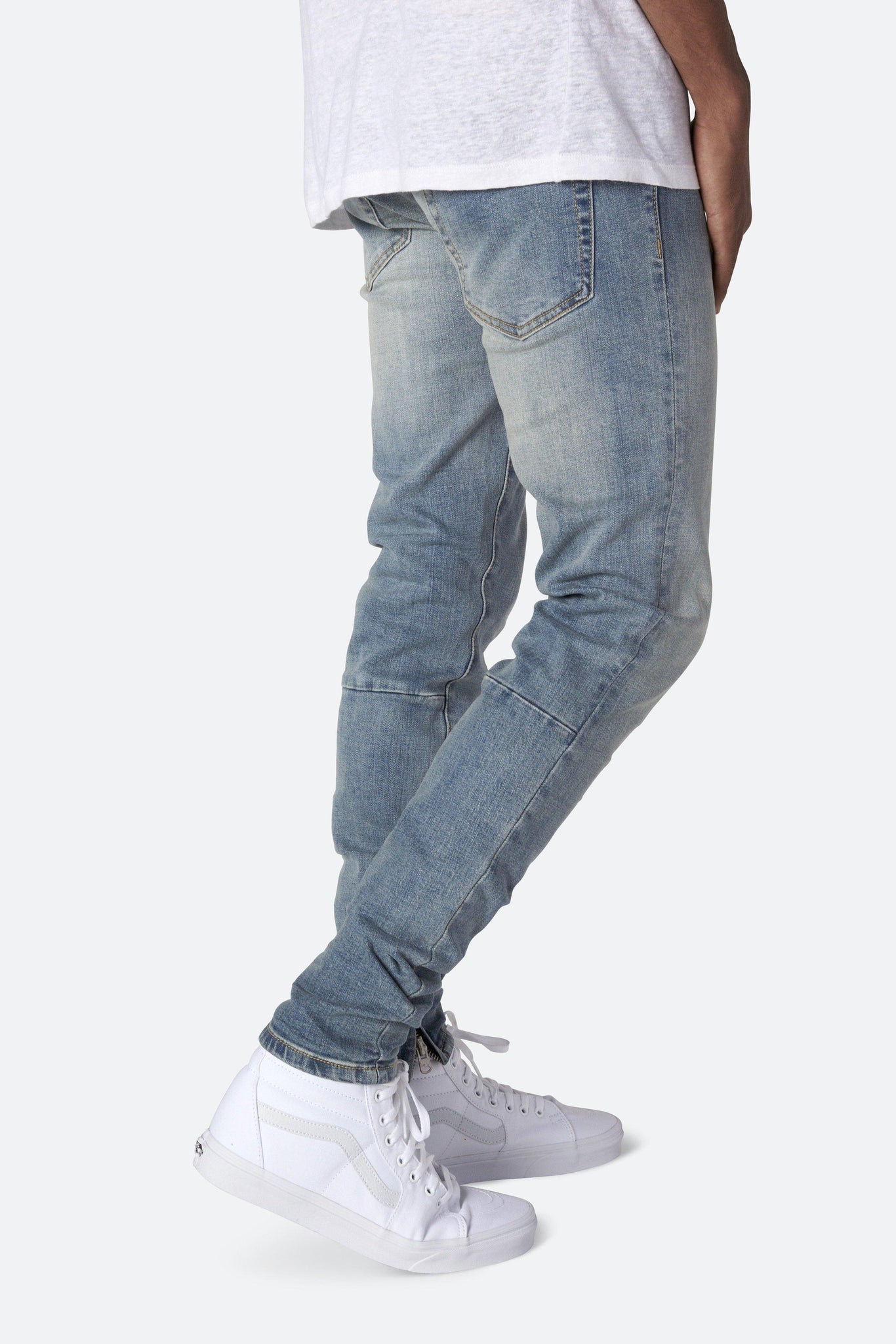 the blue m5 stretch denim is designed with a relaxed fit through the thigh that tapers from the knee to the ankle, with a warm wash throughout, finishing off with a 10" concealed zipper on the inseam and a rear calf panel for a carefully optimized fit.