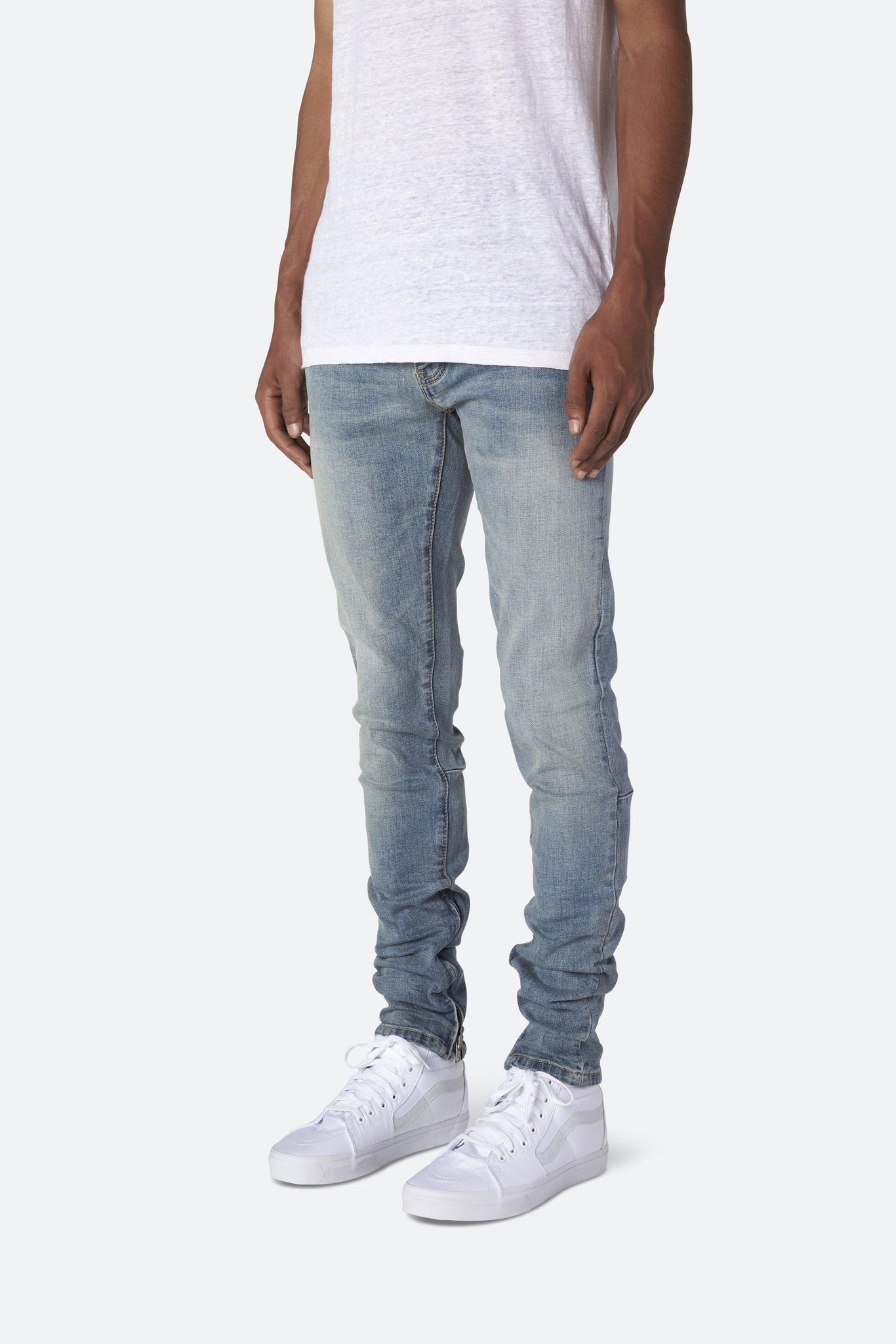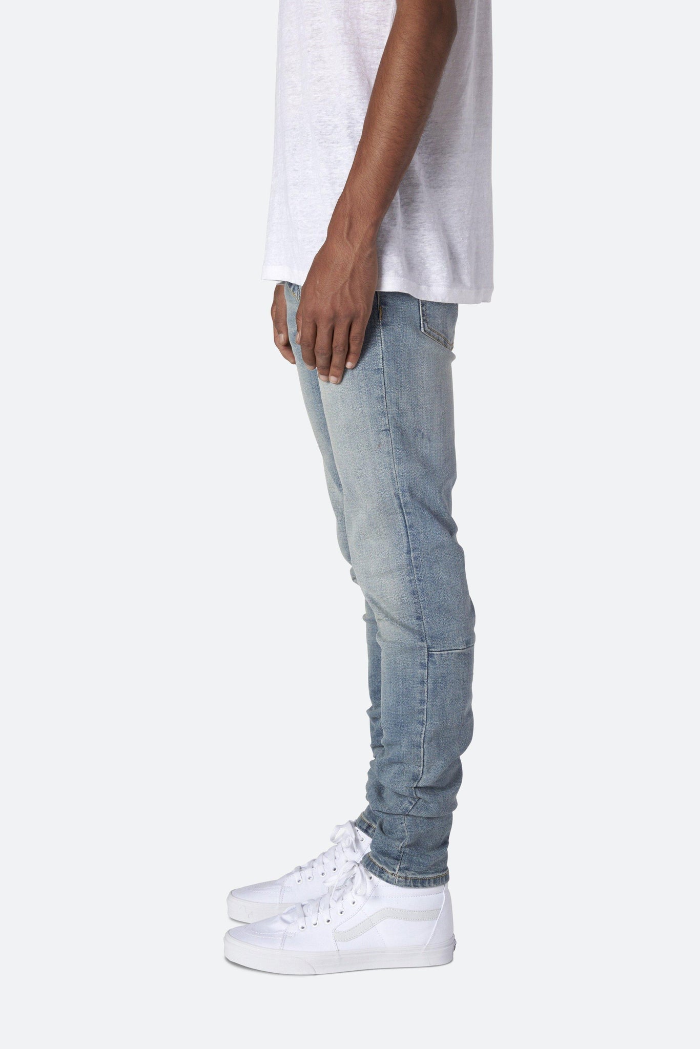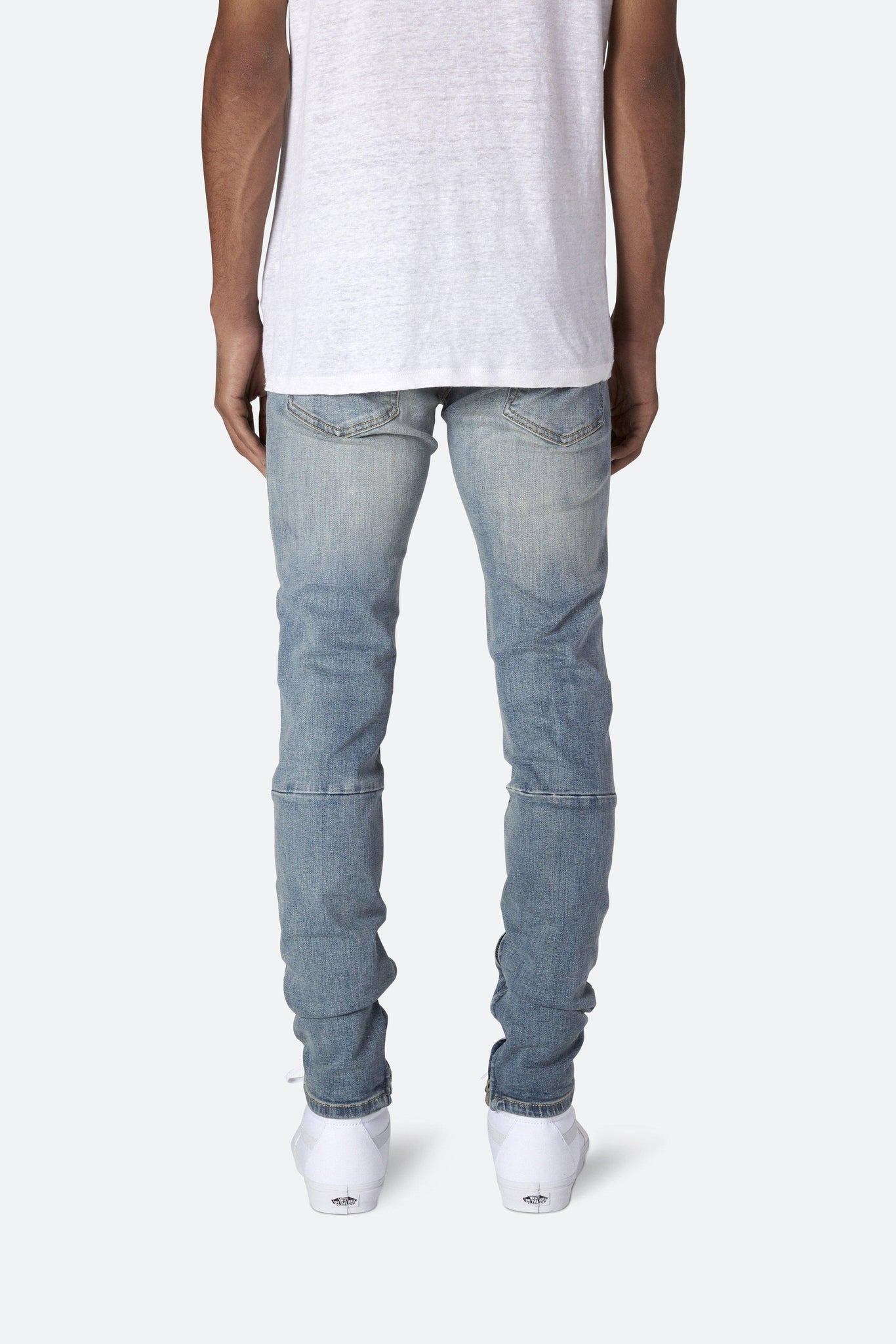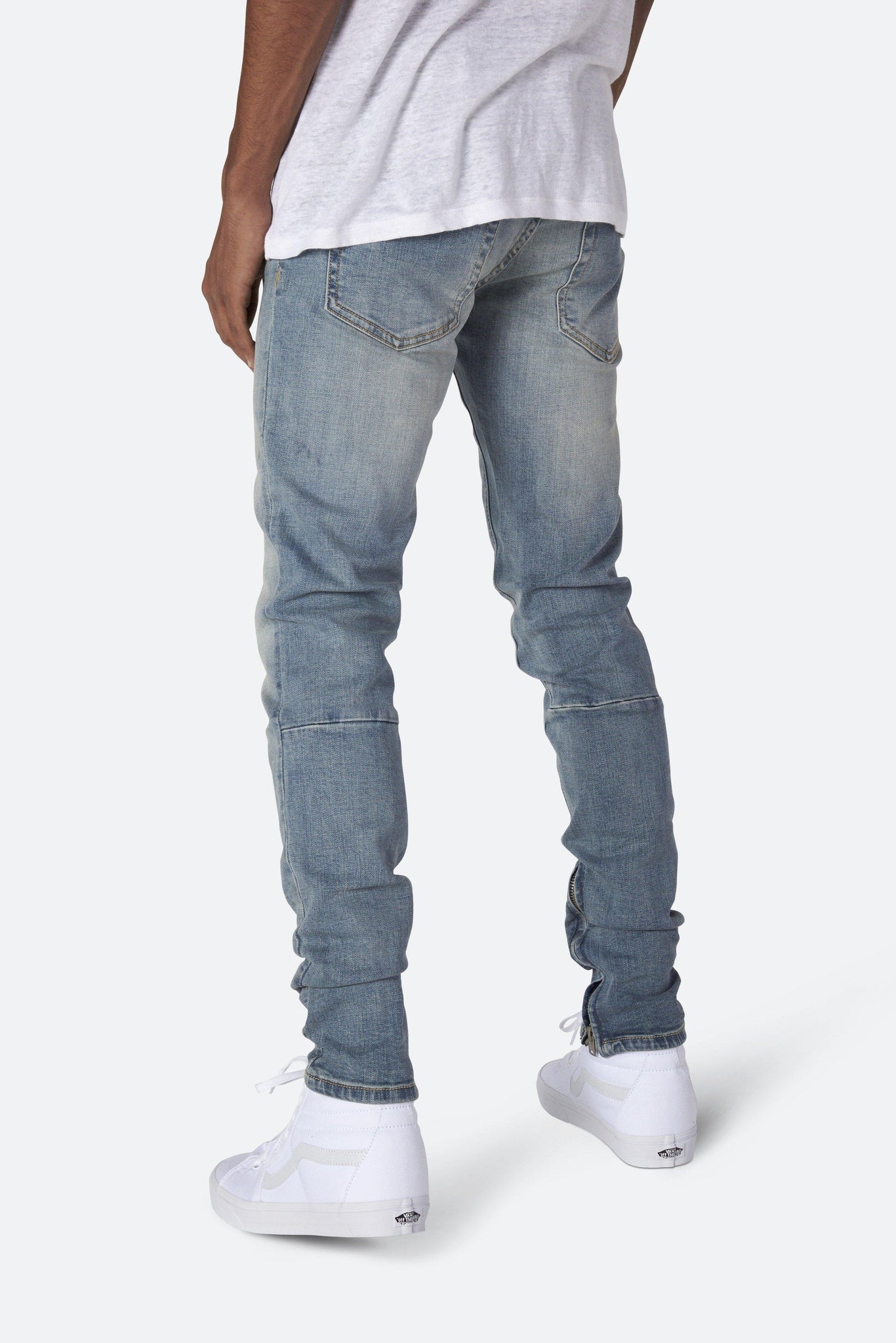 the blue m5 stretch denim is designed with a relaxed fit through the thigh that tapers from the knee to the ankle, with a warm wash throughout, finishing off with a 10" concealed zipper on the inseam and a rear calf panel for a carefully optimized fit.