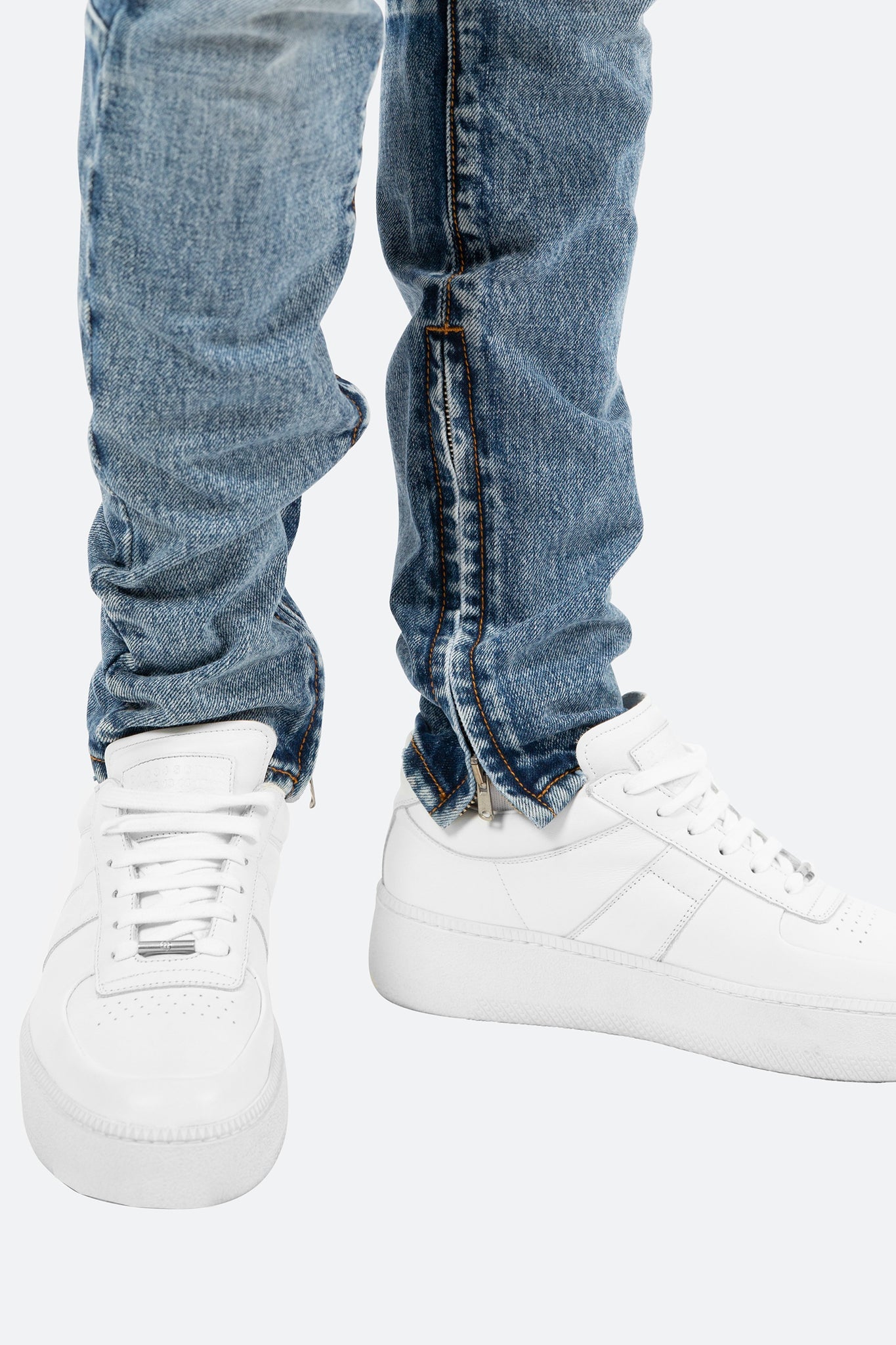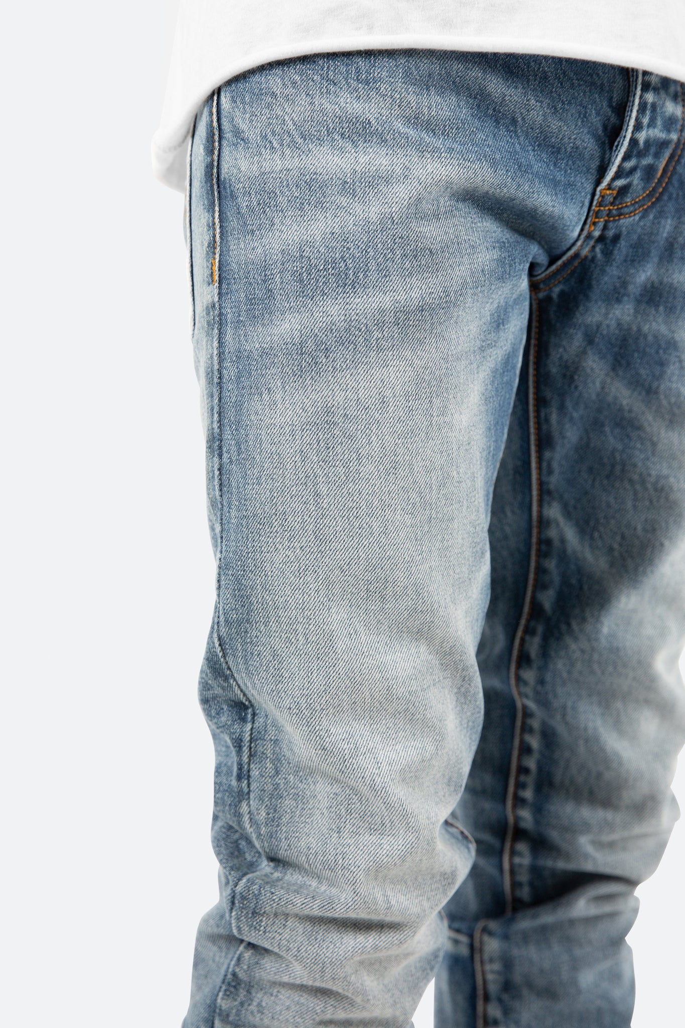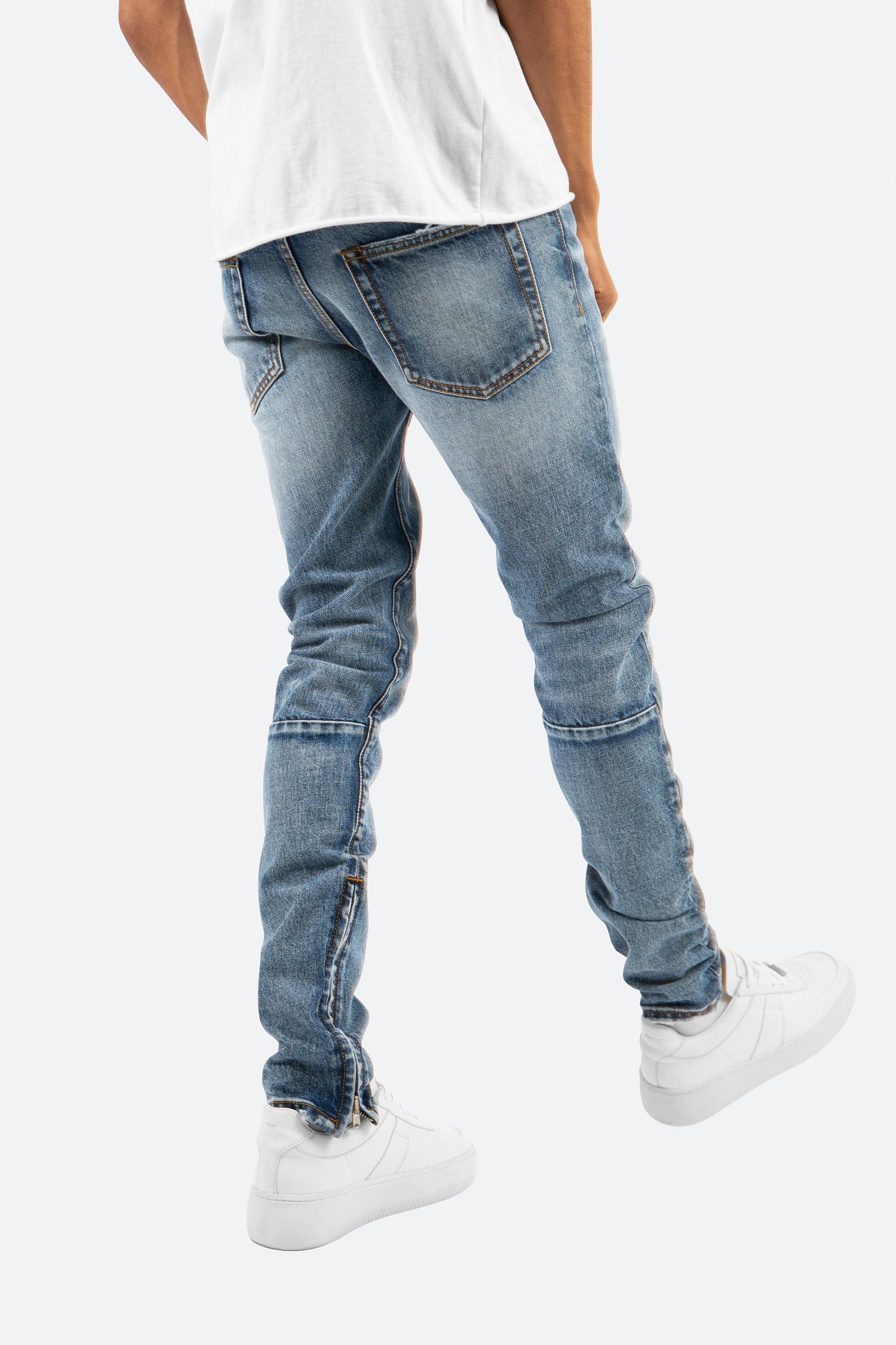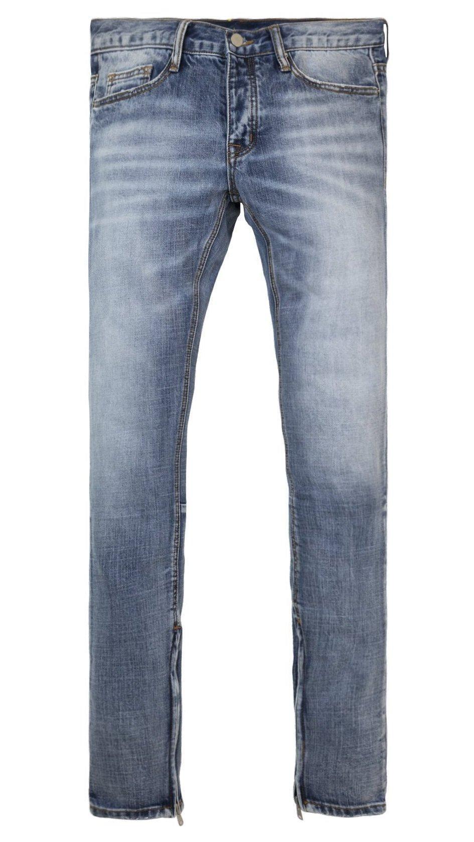 developed in los angeles, the blue m68 denim is designed with a relaxed fit through the thigh that tapers from the knee to the ankle, with a medium wash and whiskering, and finishing off with a 10" concealed zipper on the inseam for a carefully optimized fit.