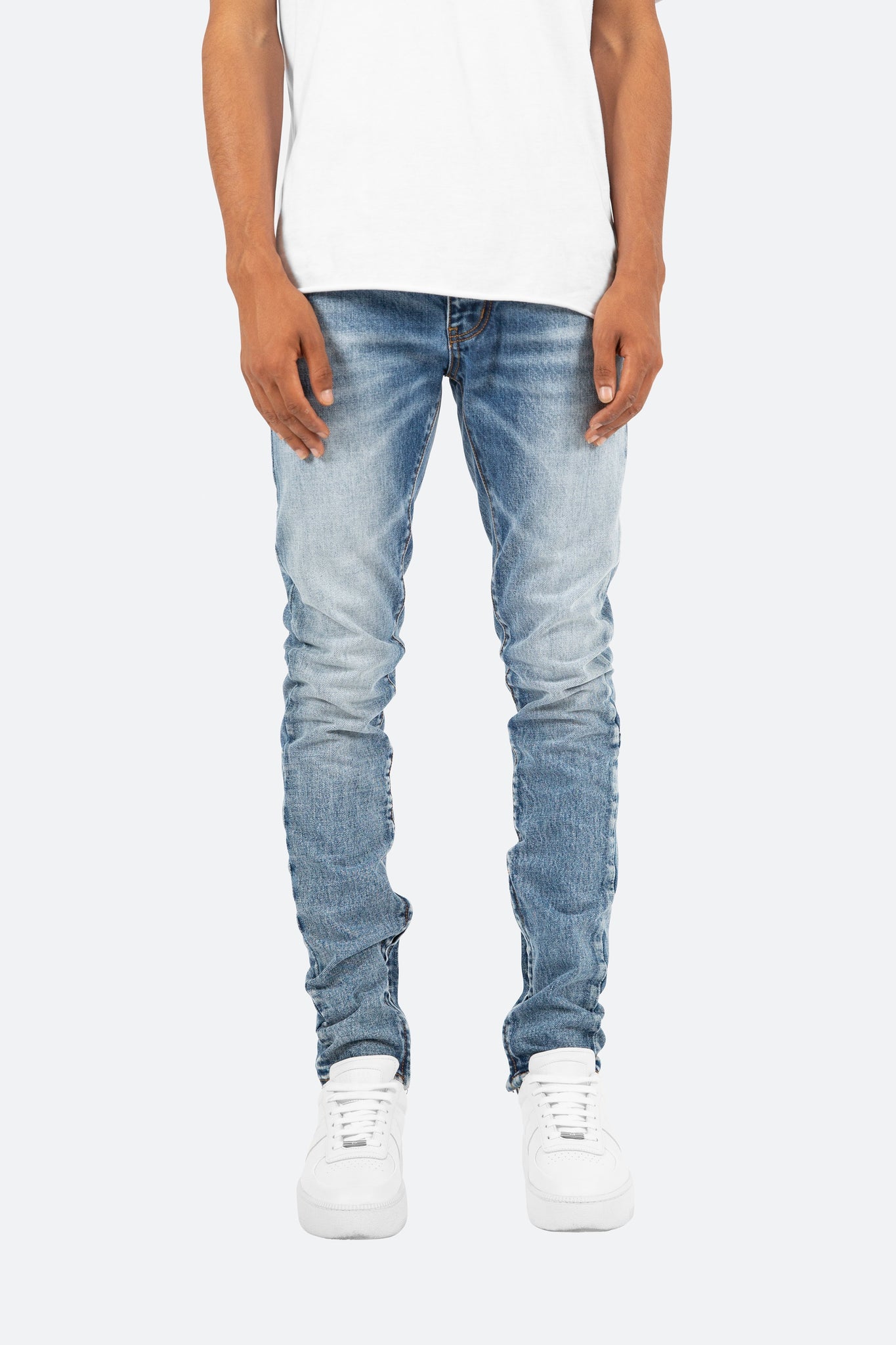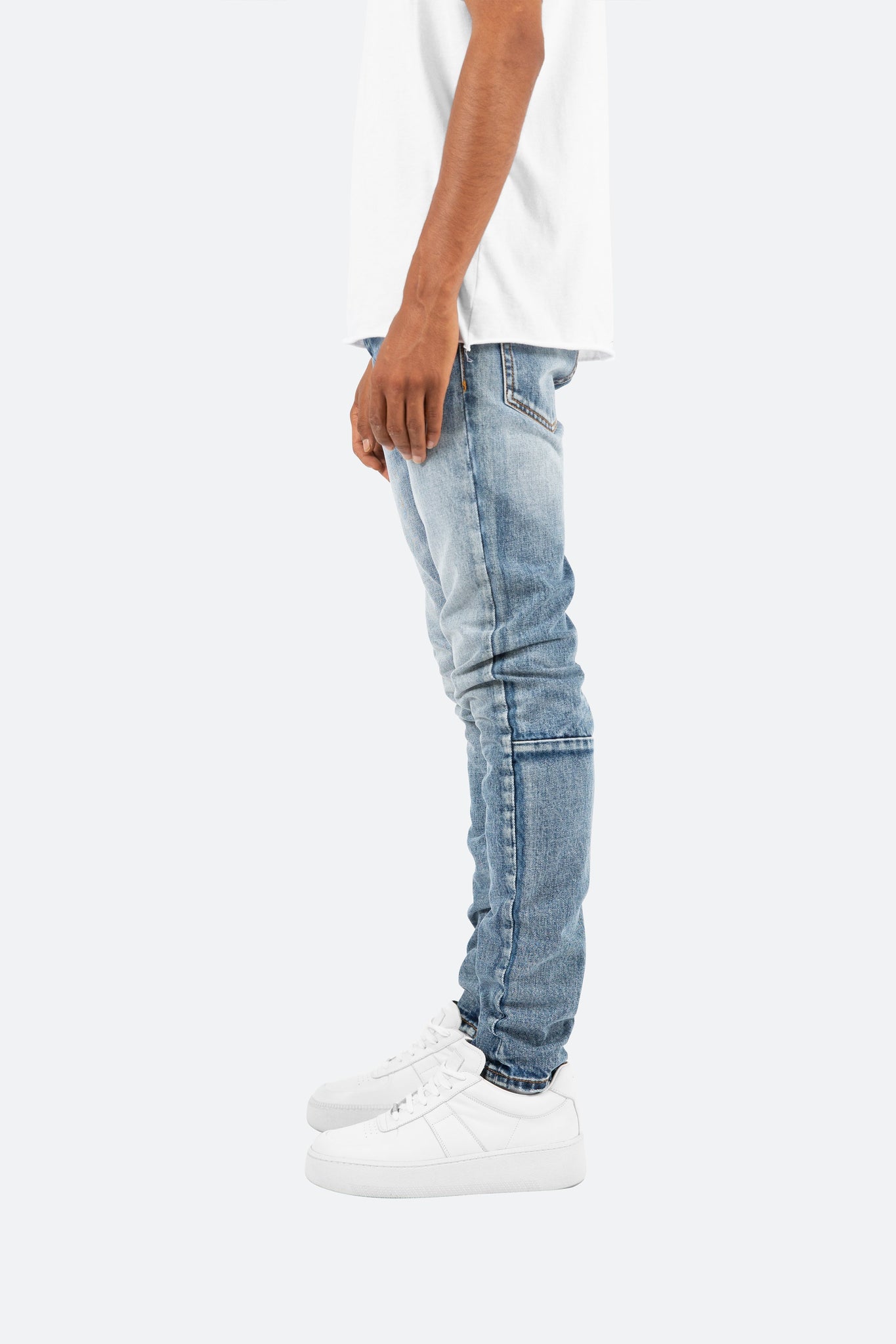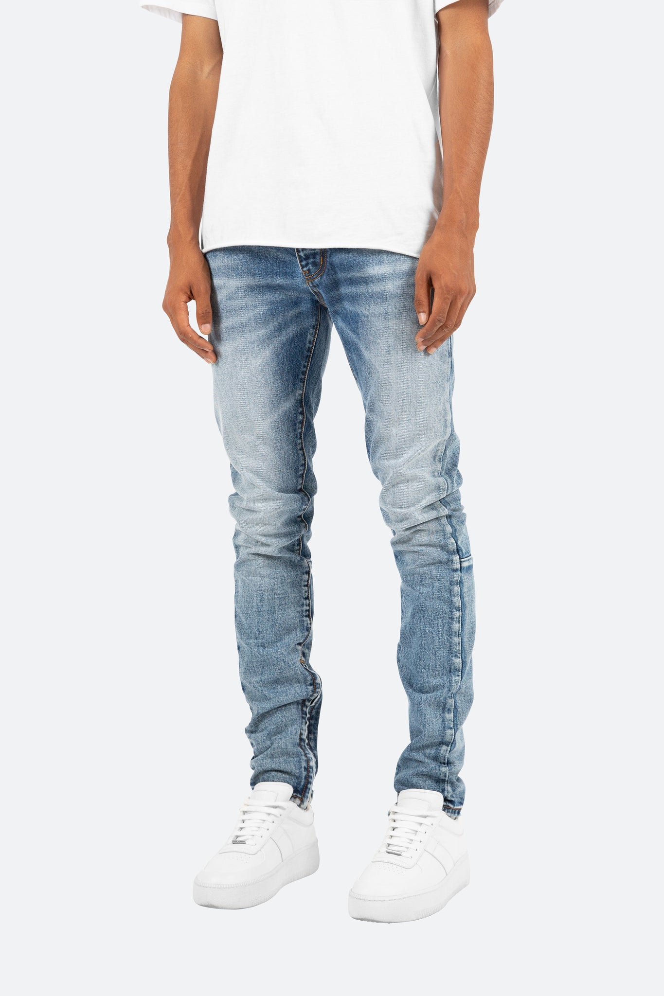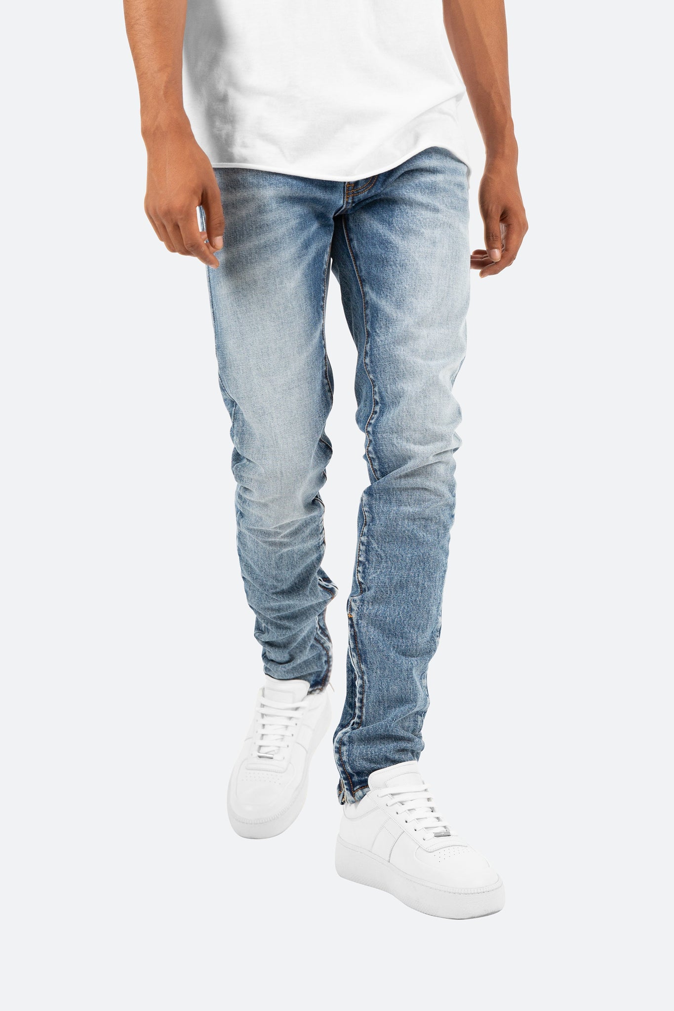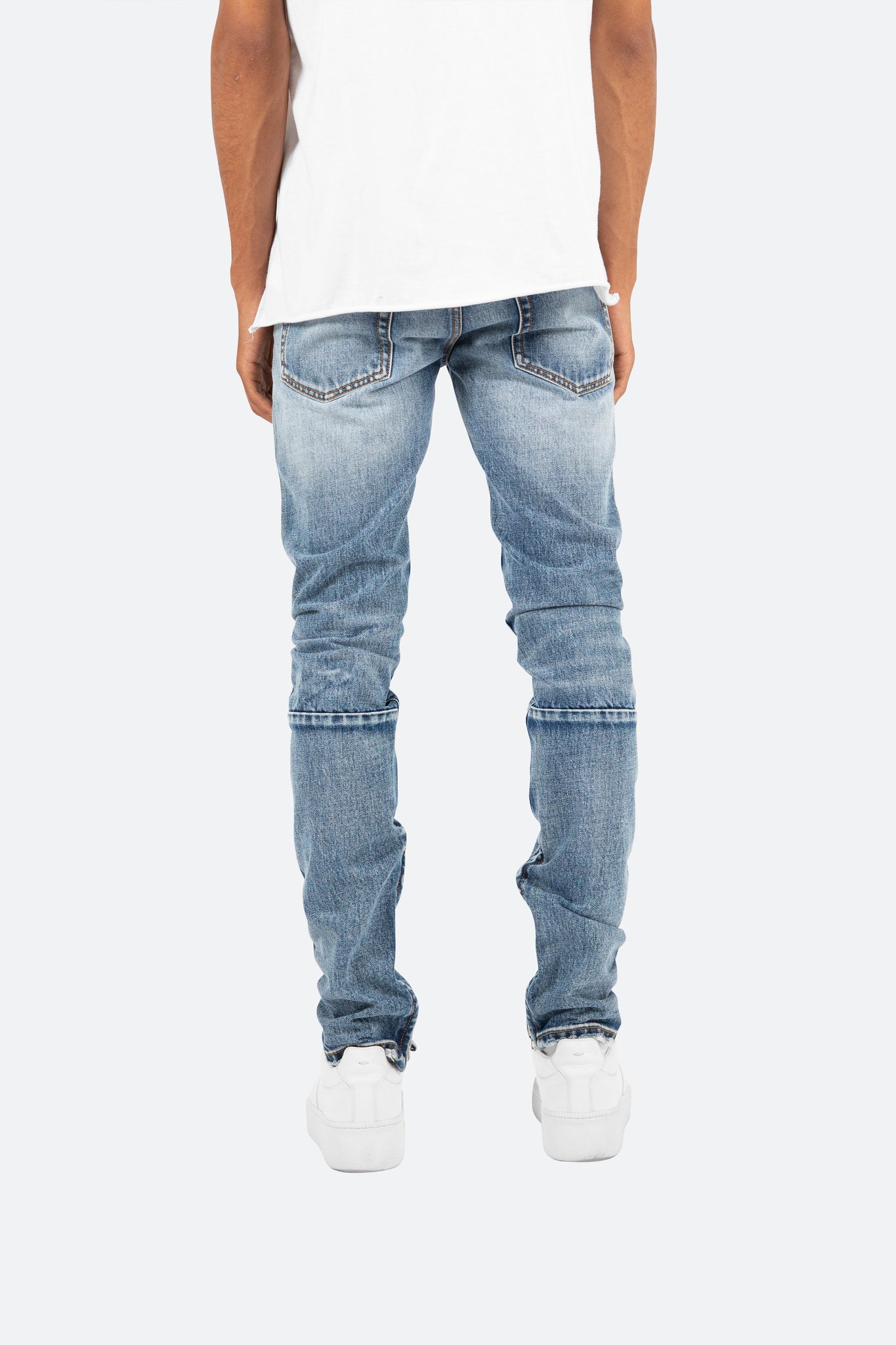 developed in los angeles, the blue m68 denim is designed with a relaxed fit through the thigh that tapers from the knee to the ankle, with a medium wash and whiskering, and finishing off with a 10" concealed zipper on the inseam for a carefully optimized fit.