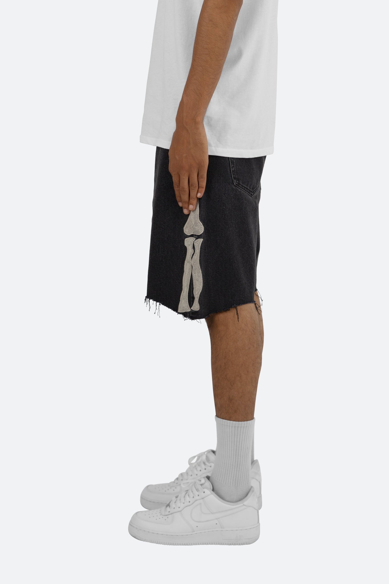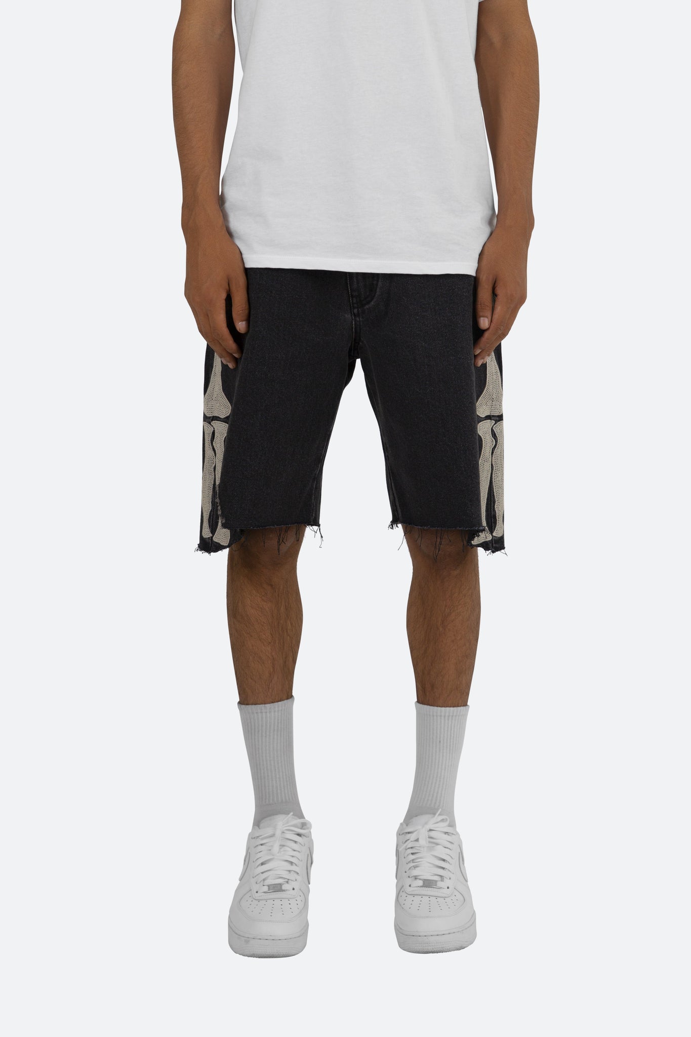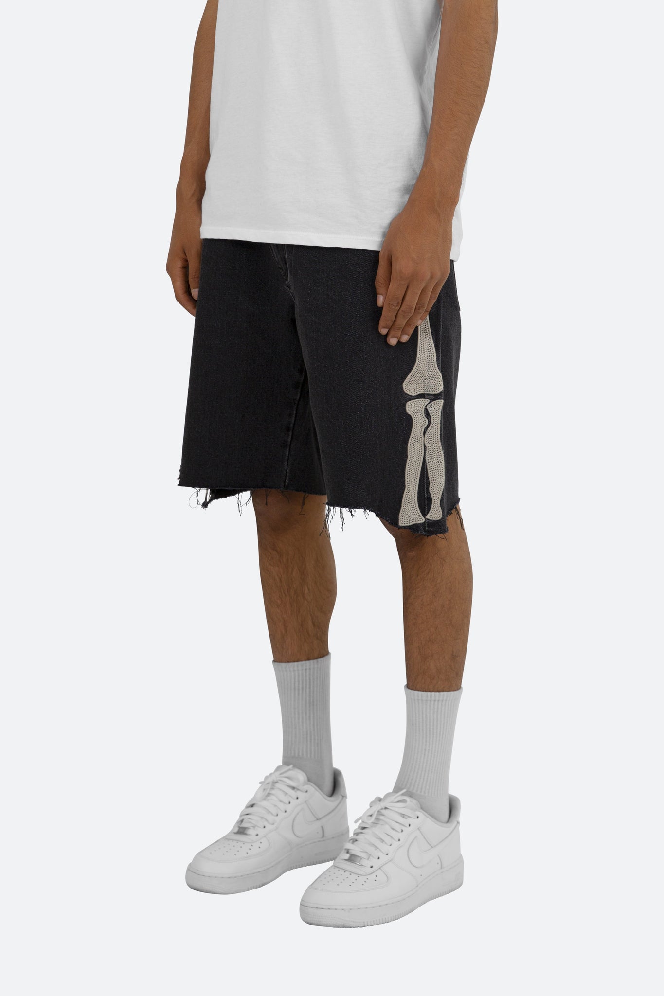 the R195 Denim Shorts are designed with a relaxed fit throughout, featuring chain stitched embroidered bones on the outseam, and finished off with raw hem.