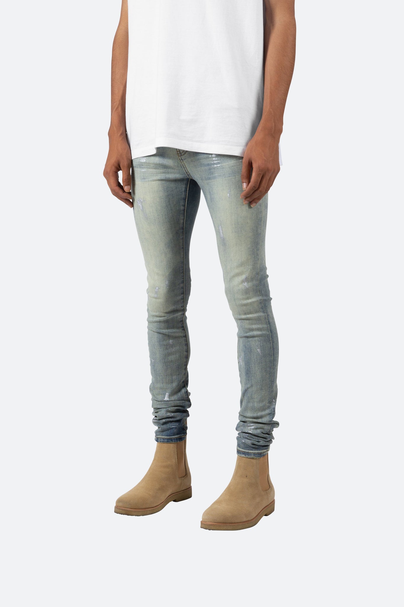 the X143 Stretch Denim is designed with our new X fit which is  skinny throughout with an extended inseam for stacking, and features a medium wash  and paint details throughout.