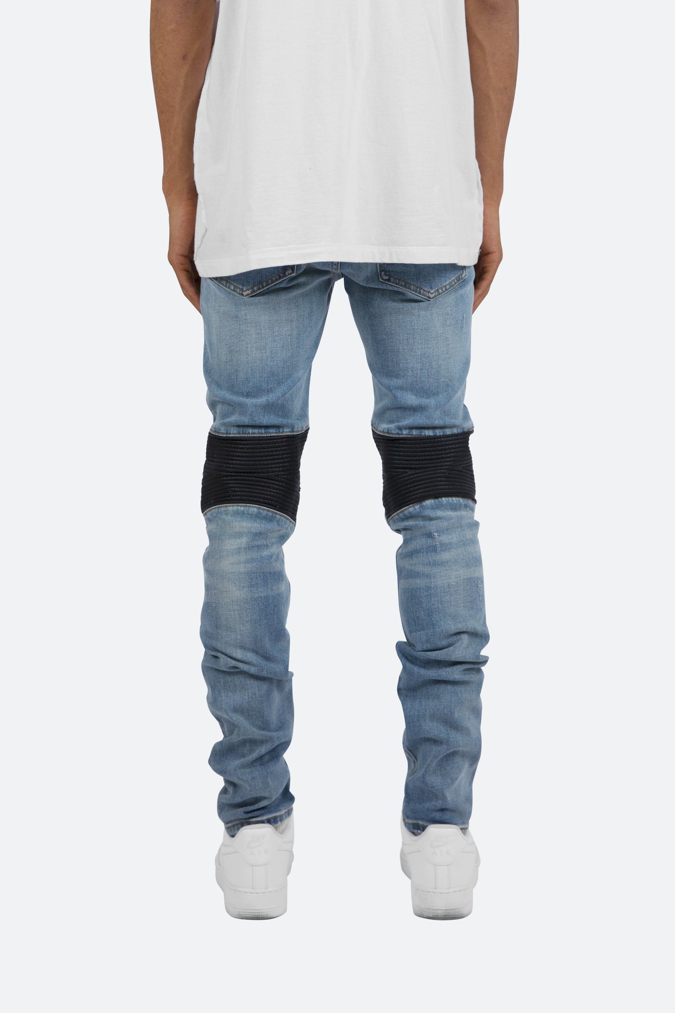 the X186 Stretch Denim is designed with our new X fit which is  skinny throughout with an extended inseam for stacking, and features a medium wash, poly-leather moto details at the knees, and finished with zipper details at the knees.
