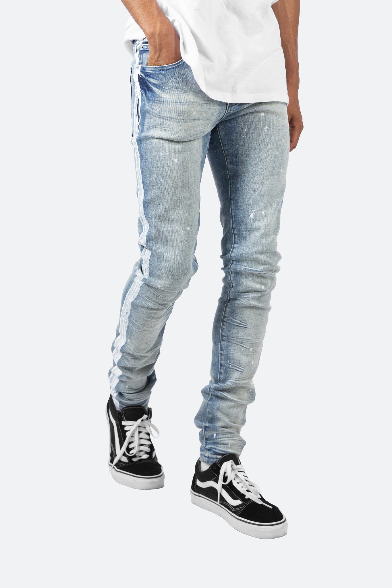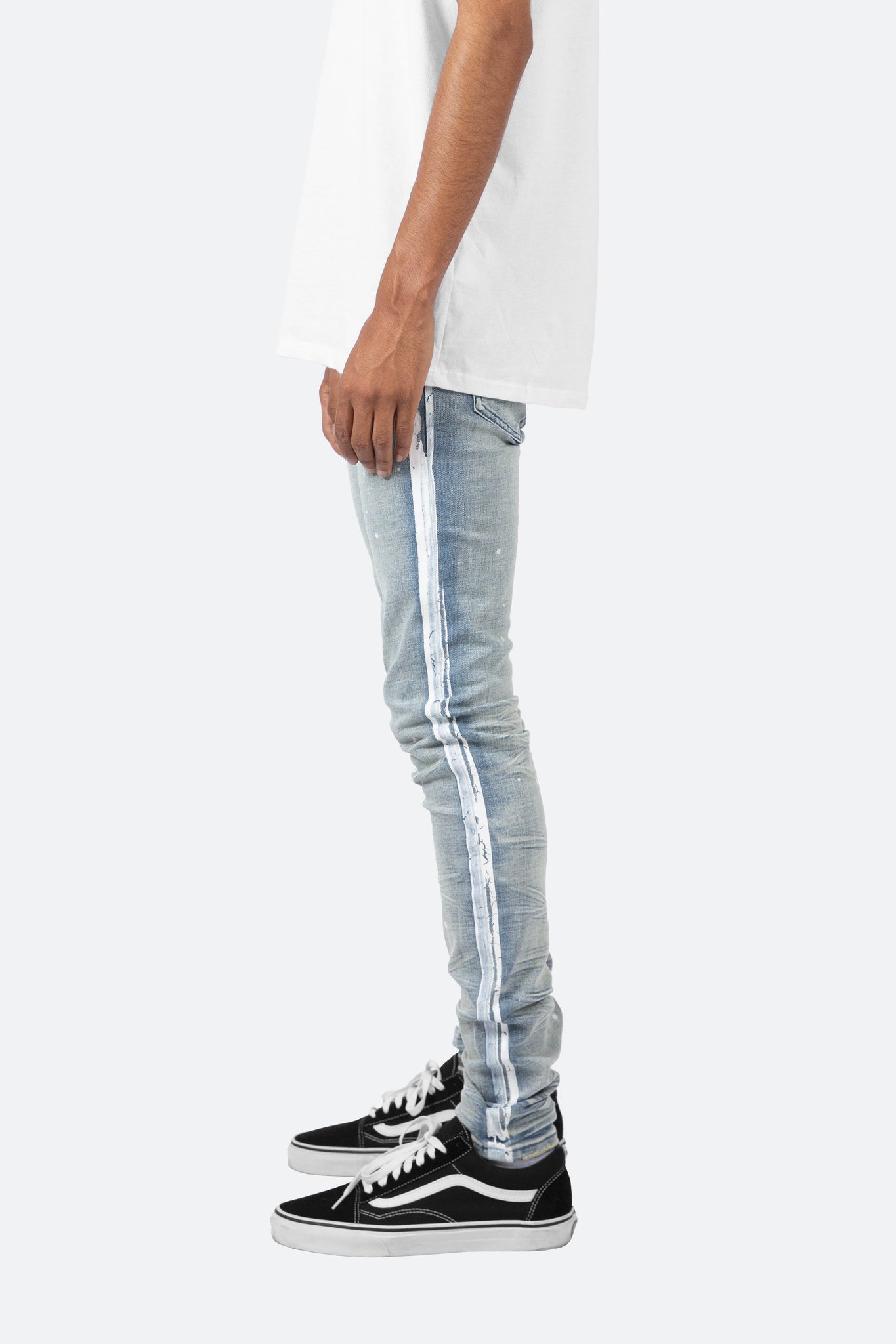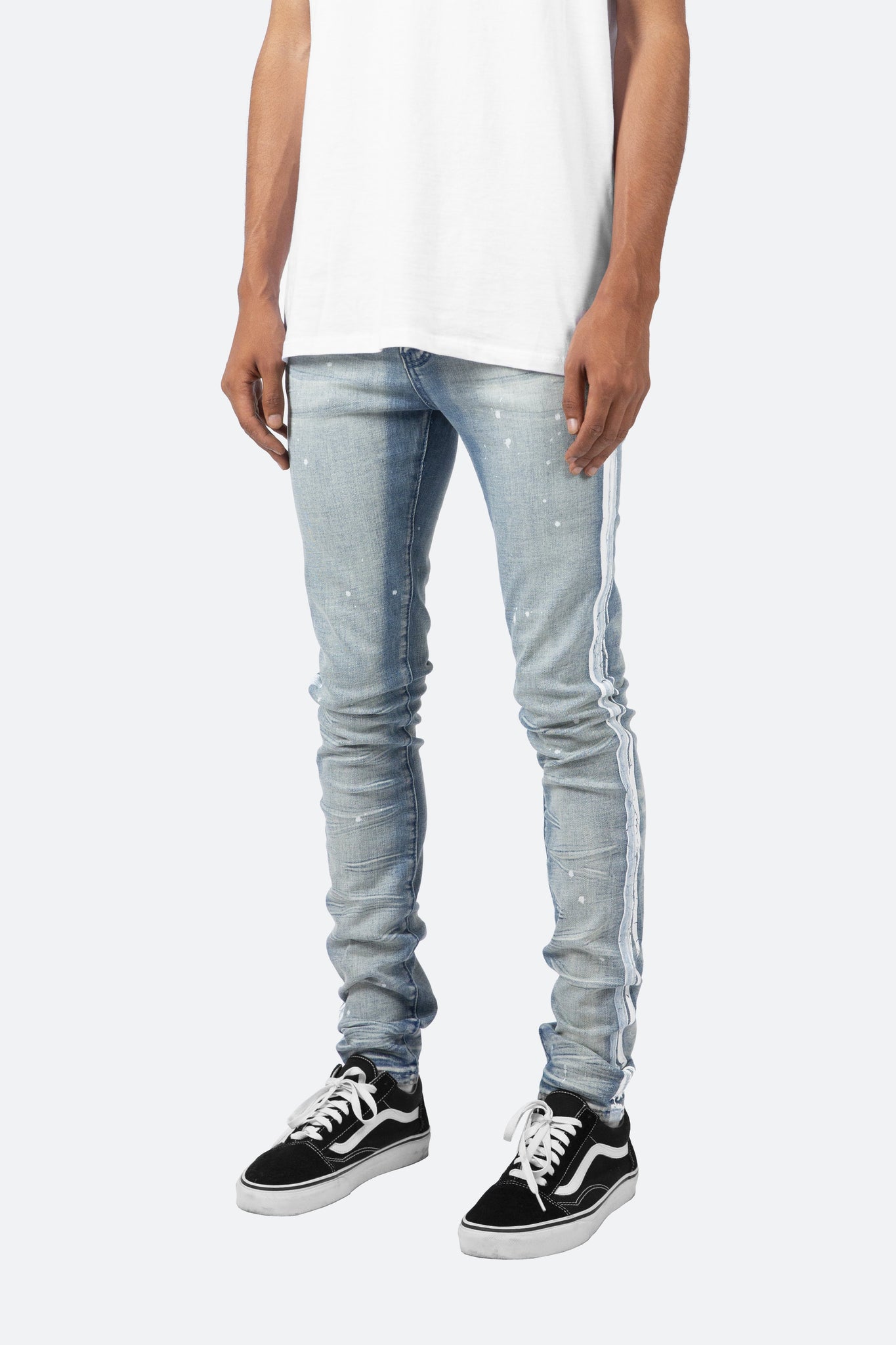 the X86 Stretch Denim is designed with our new X fit which is skinny throughout with an extended inseam for stacking, and features a medium wash and paint details throughout, including stripes down the outseam.