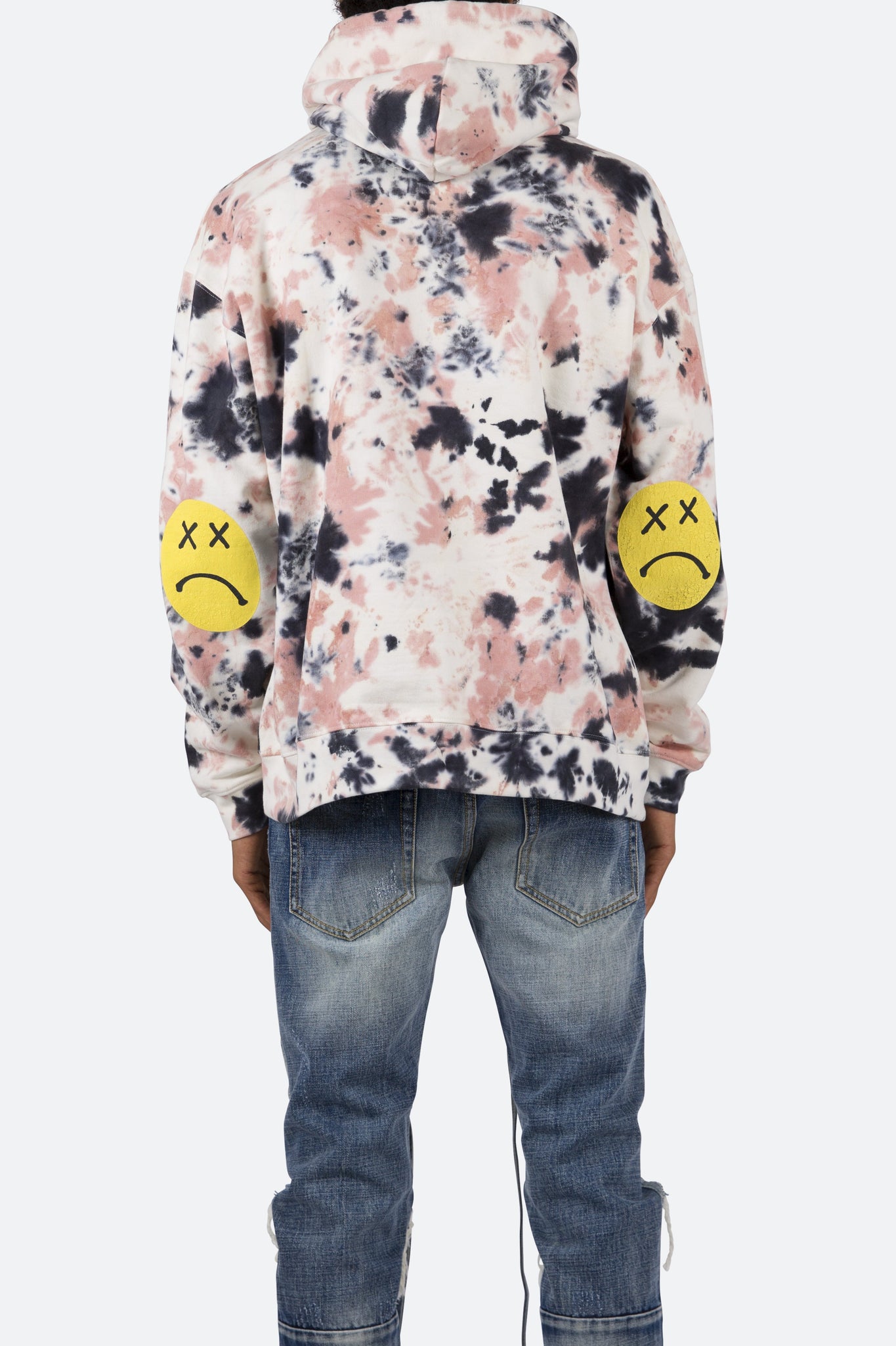 the Tie Dyed Smile Hoodie features a standard fit, a front kangaroo pocket, multi-colored tie-dye treatment and is finished with a vintage smiley face screen print at the elbows.