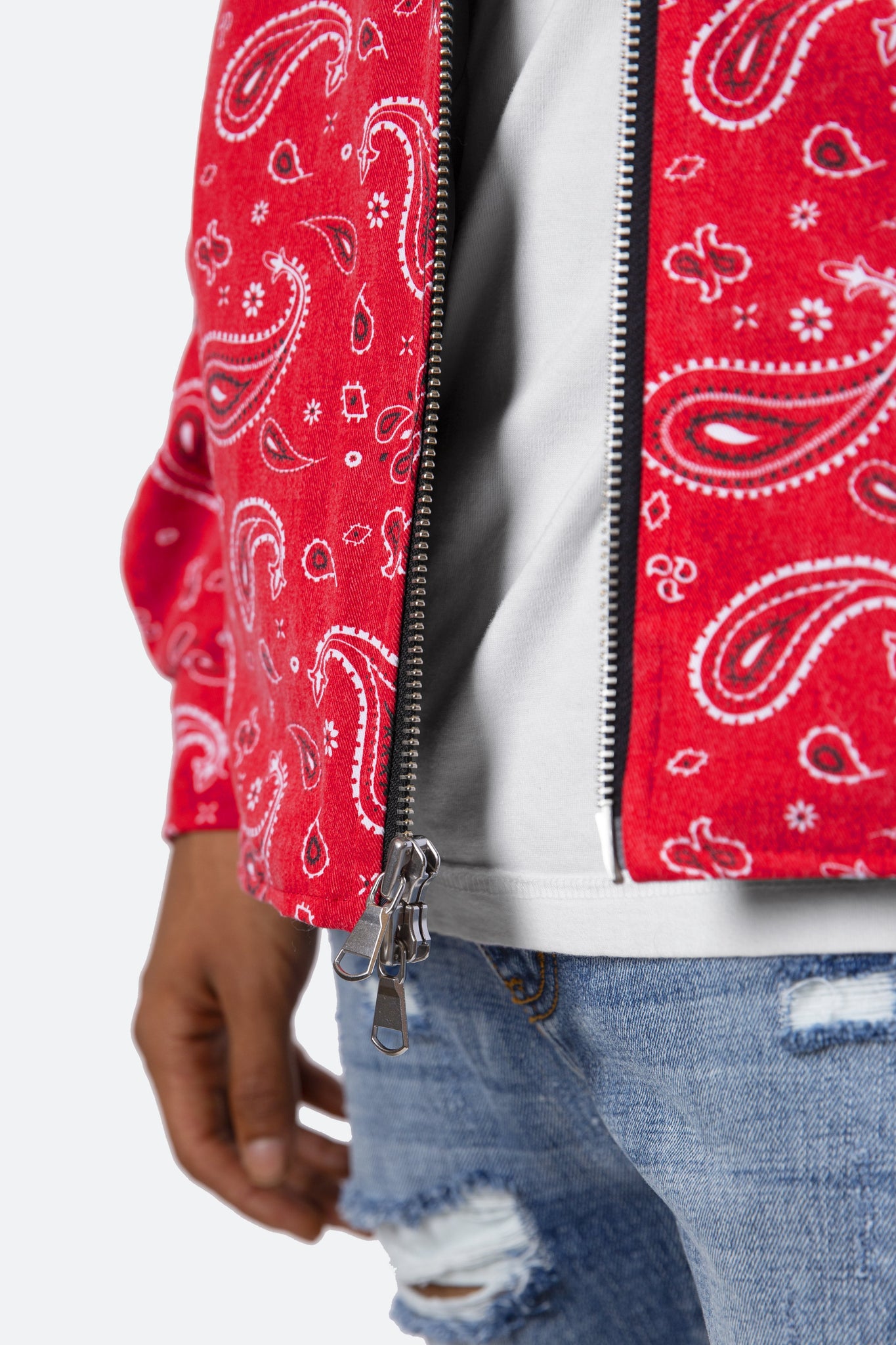 the Paisley Hooded Zip Up is designed with a relaxed fit and features a scoop hemline, a two-way zipper closure, welt pockets, french terry hood, cargo pockets at the chest, constructed from a printed paisley twill shell with a vintage wash and finished with a quilted nylon lining.