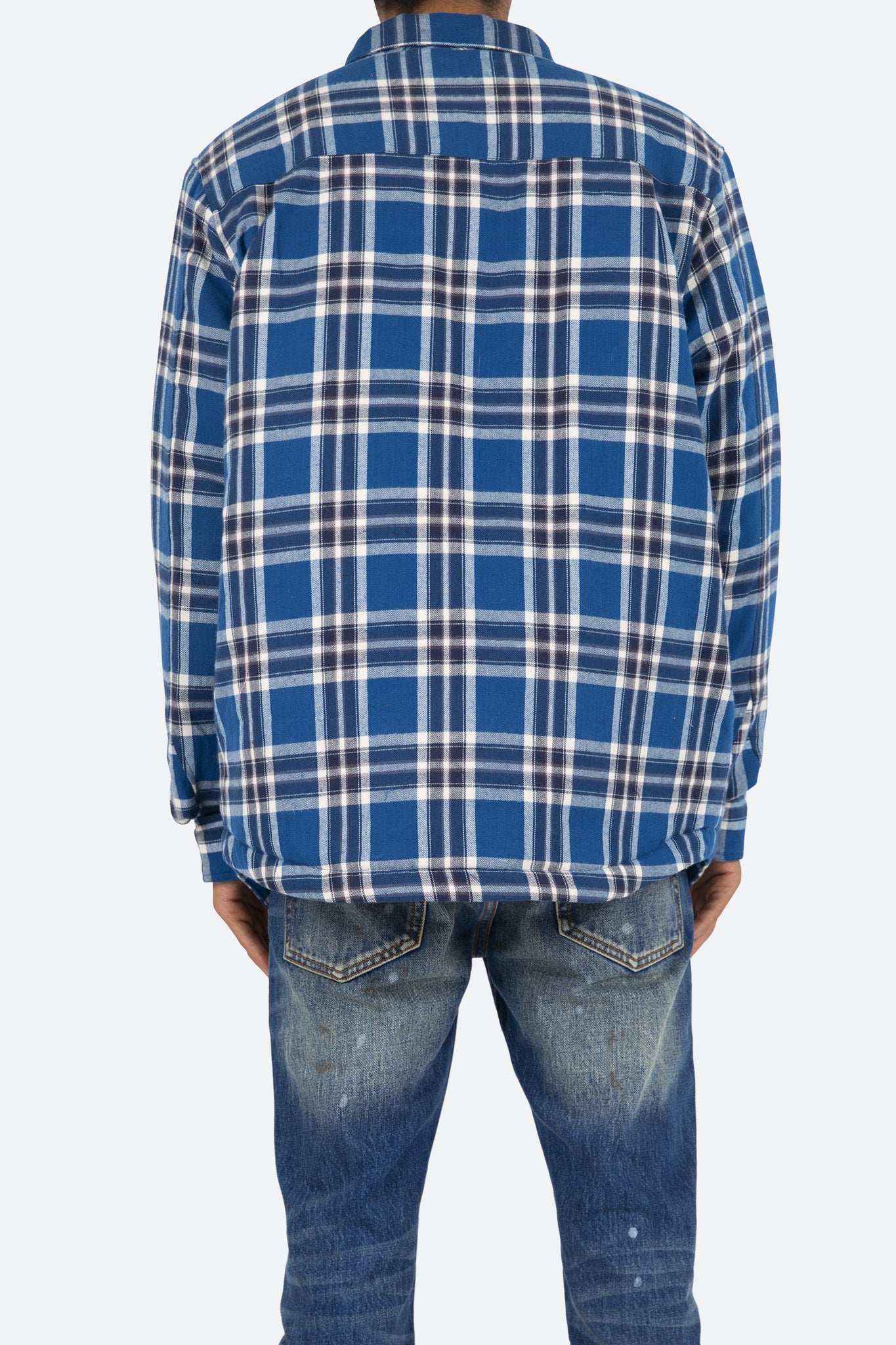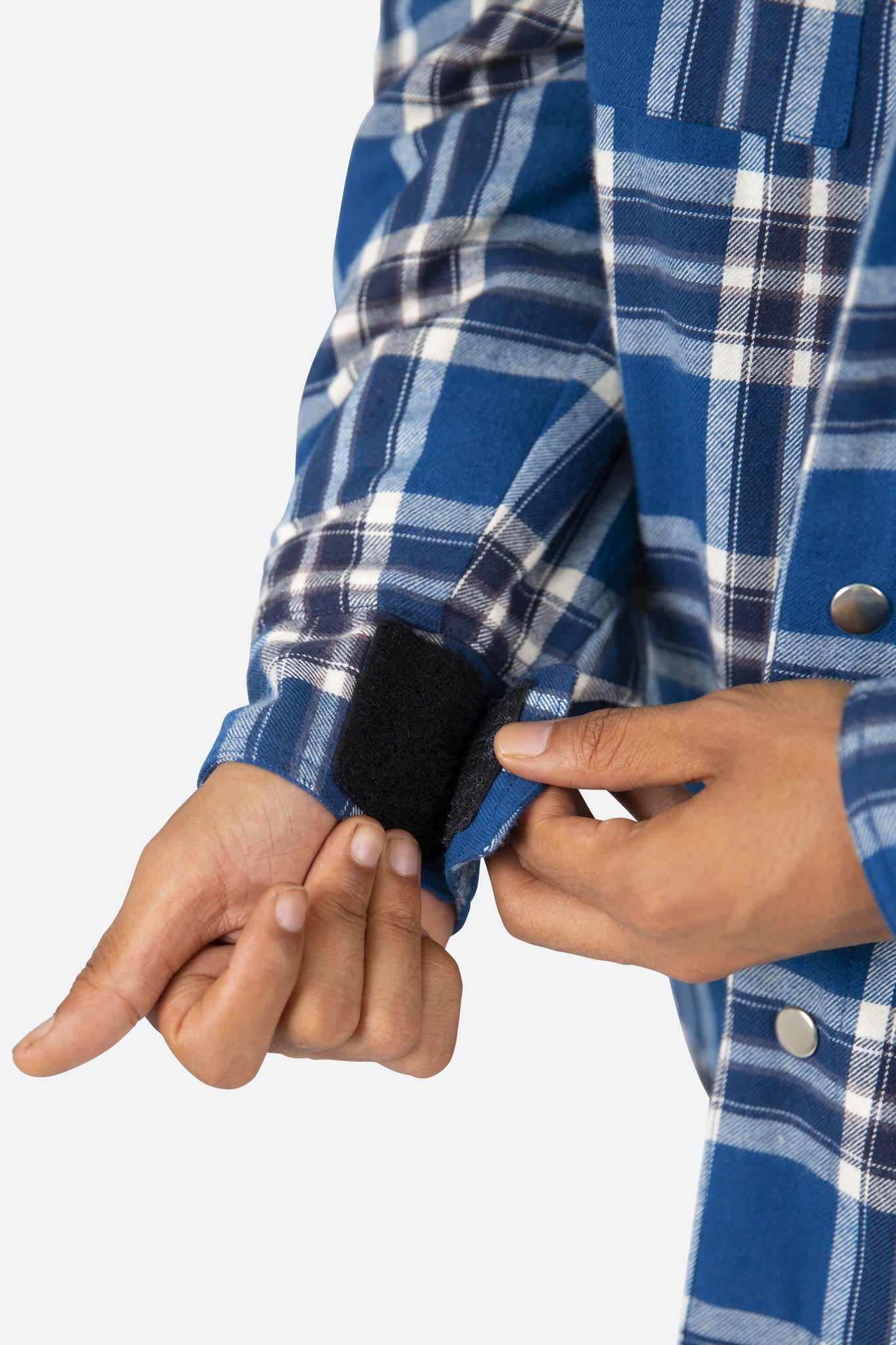 the Plaid Work Jacket is designed with a relaxed fit and features a scoop hemline, pleats at the wrist, an adjustable button closure, and all in a custom plaid shell and quilted poly-filled lining.