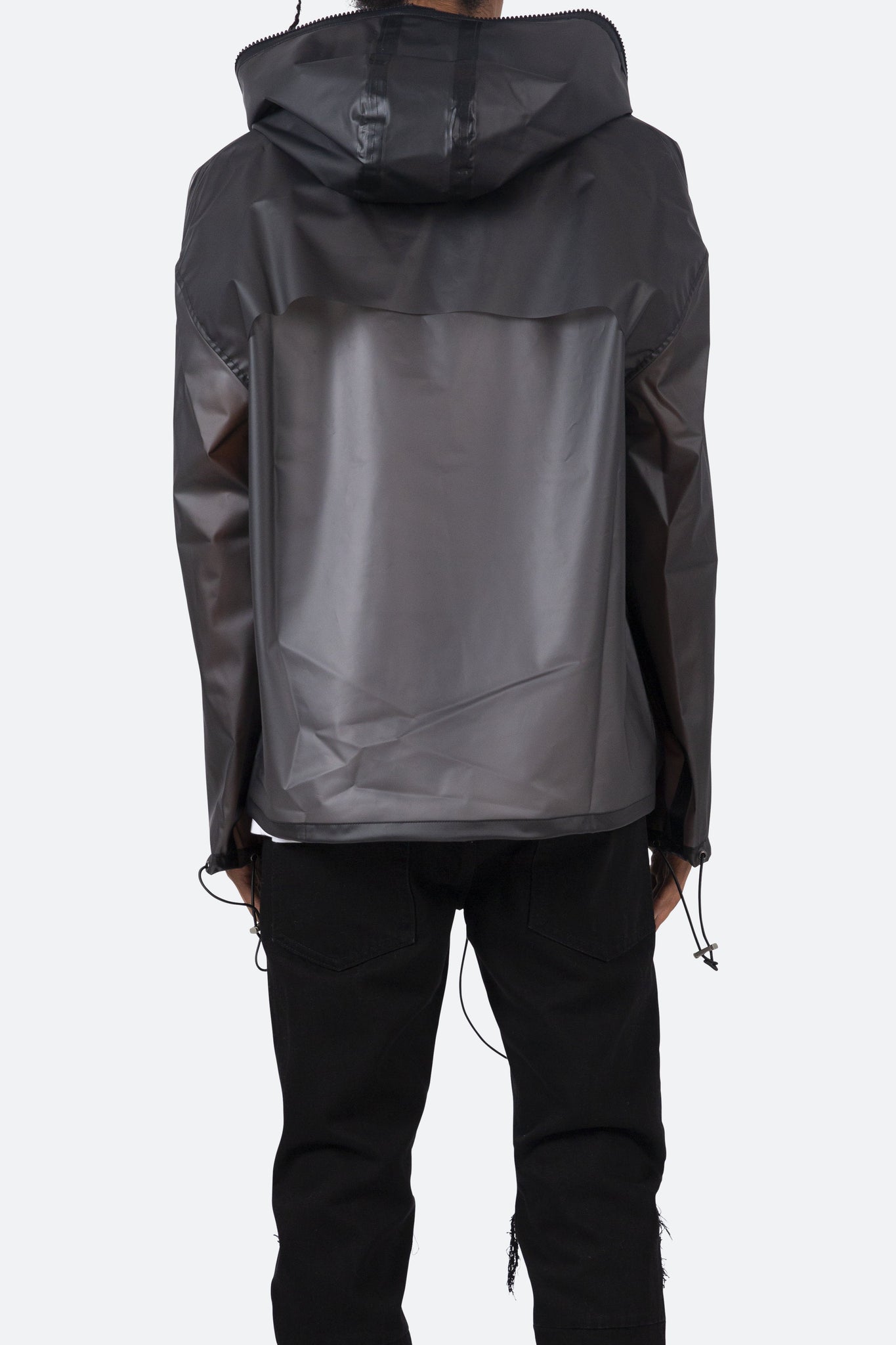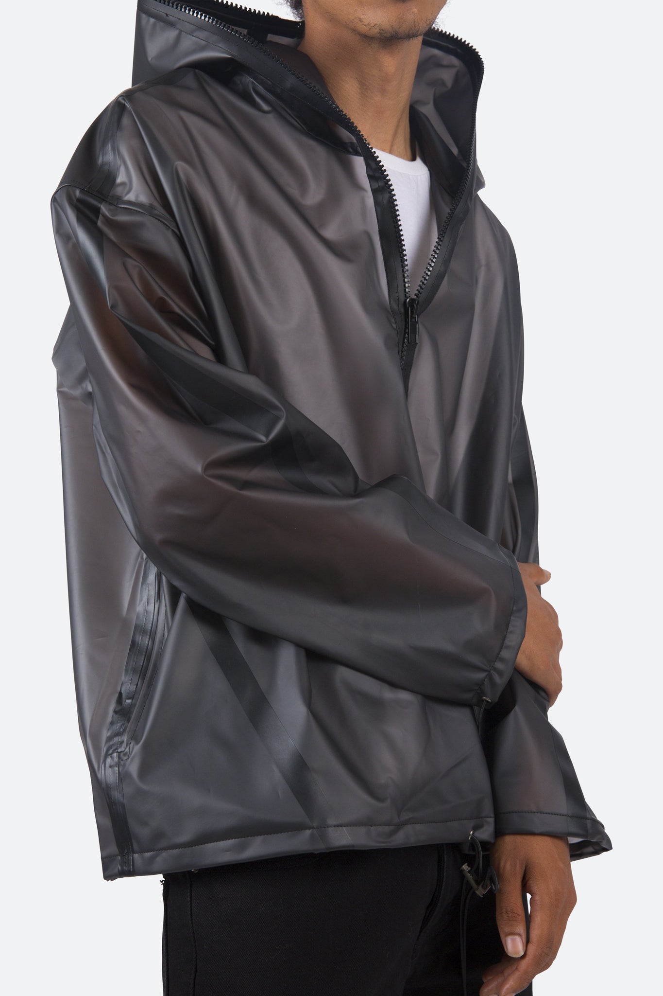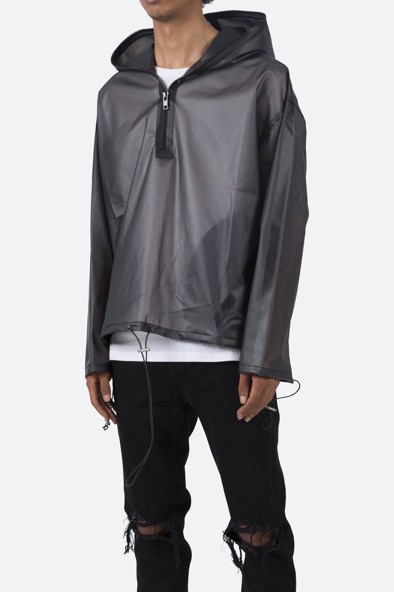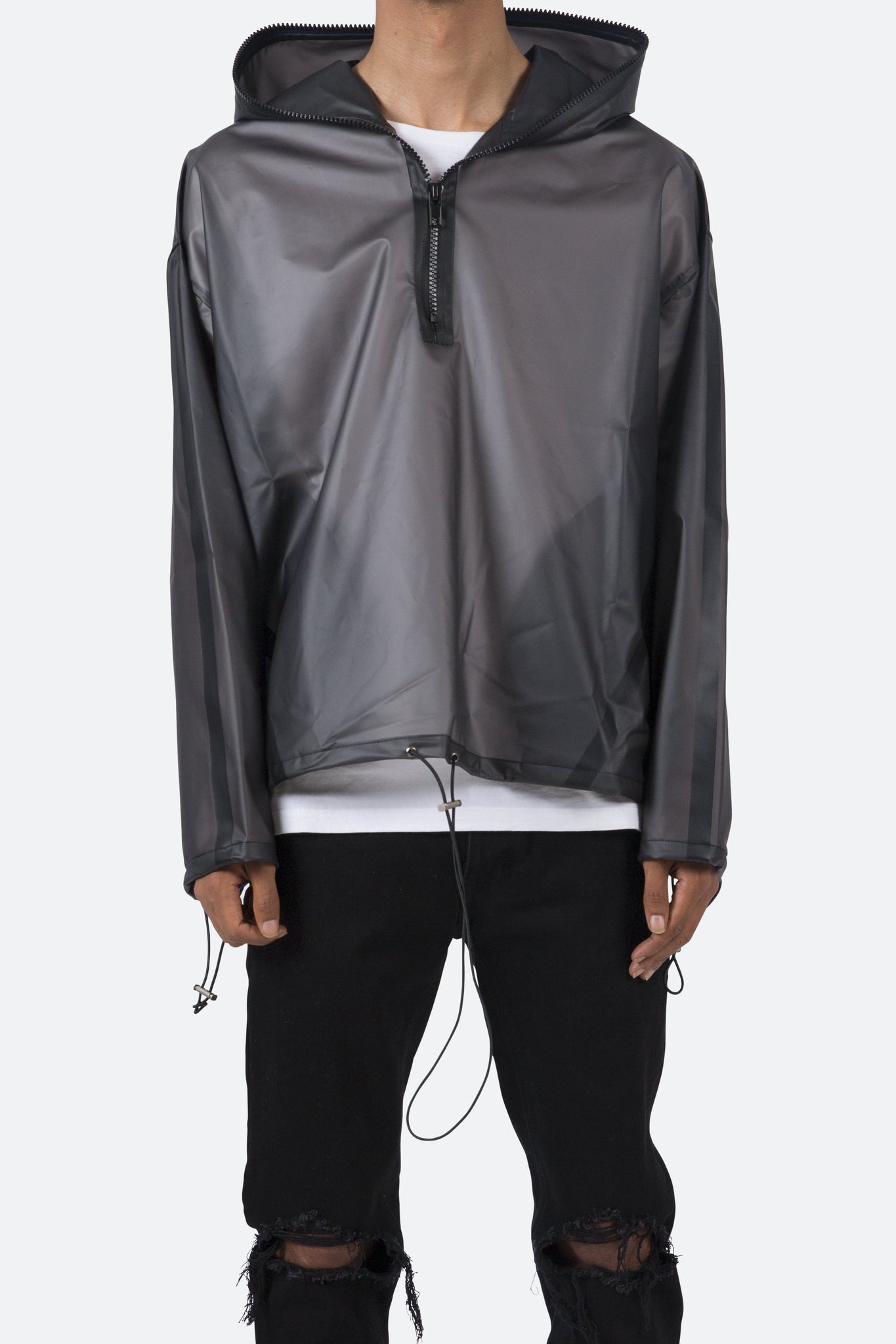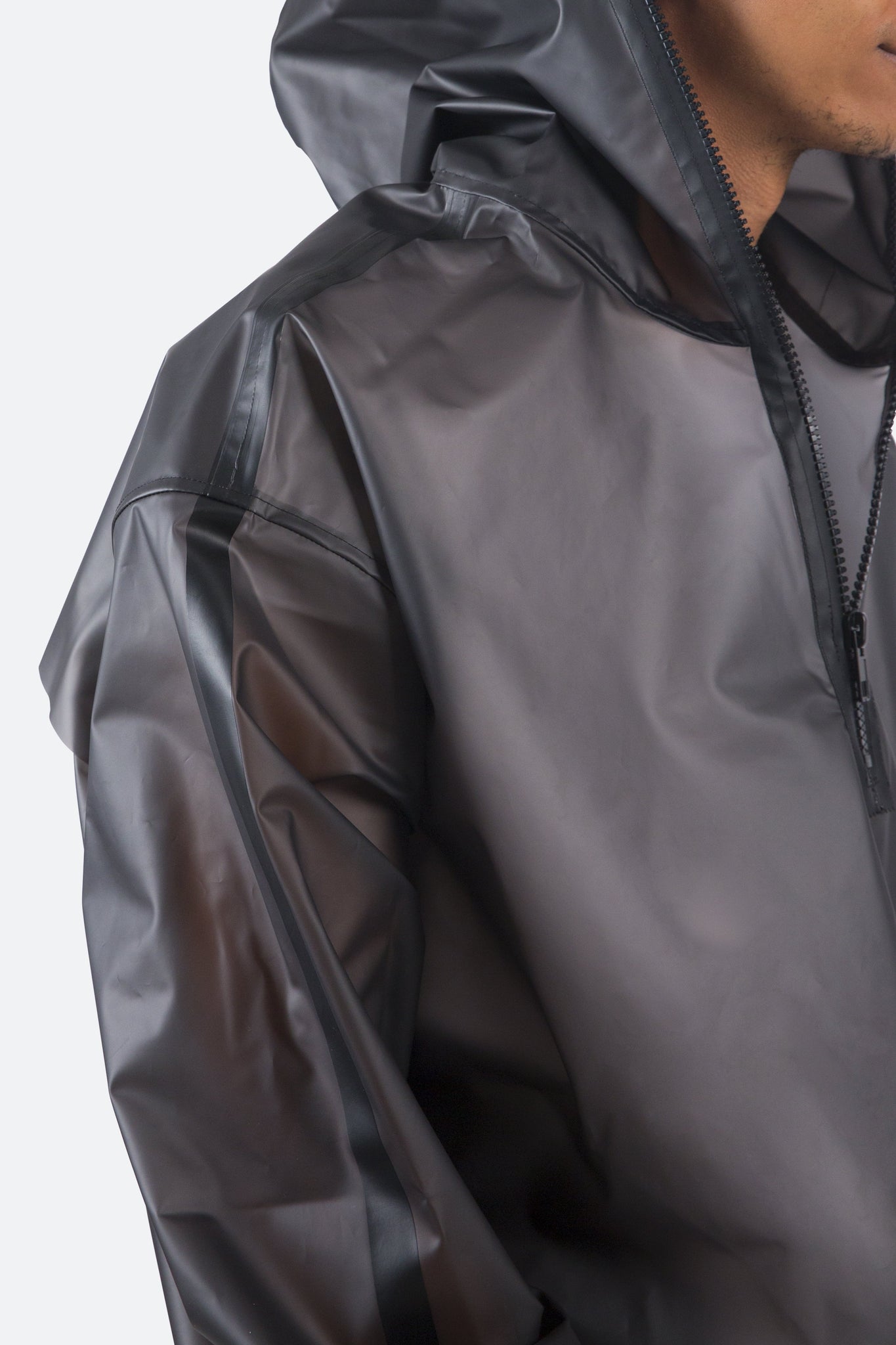the Rubberized Half Zip is constructed in a relaxed fit, featuring half zip at the chest and hood, elastic cinch closures at the waist and wrists, taped seams, and is completed in a rubber-like polyester fabric.