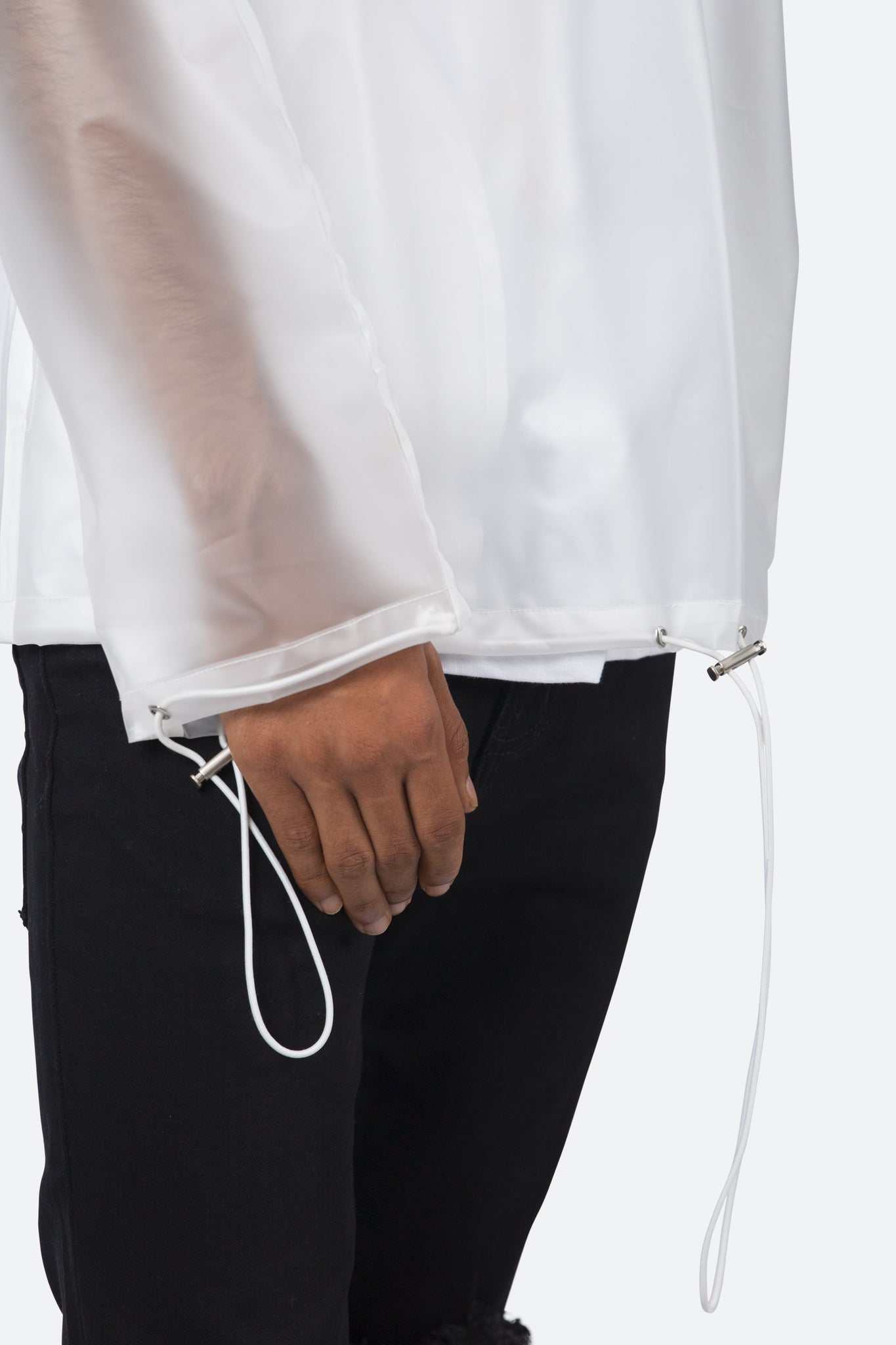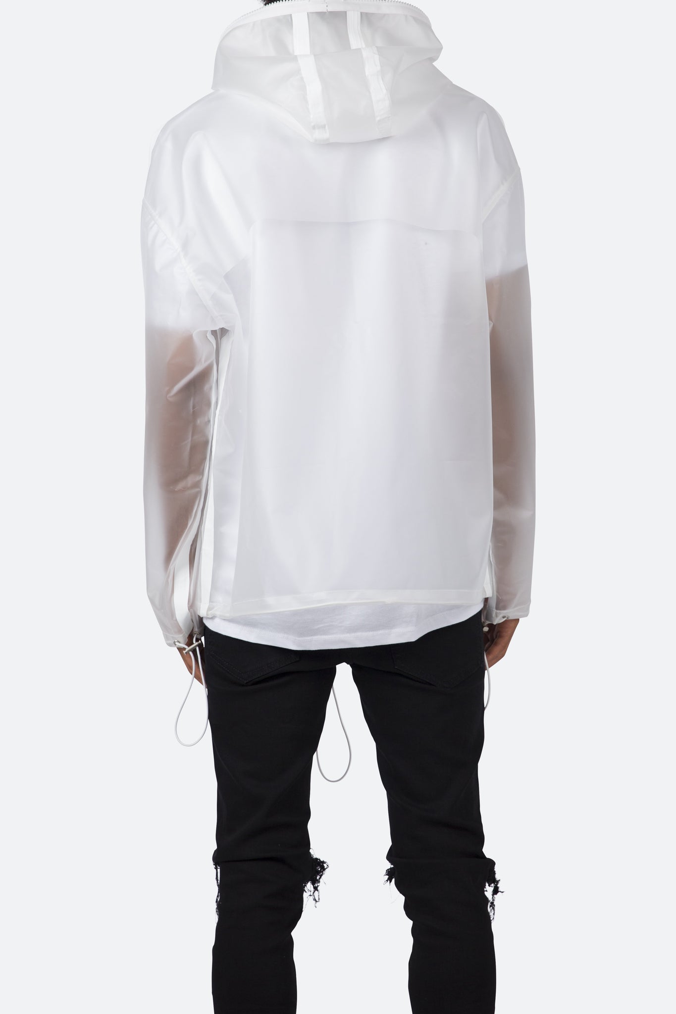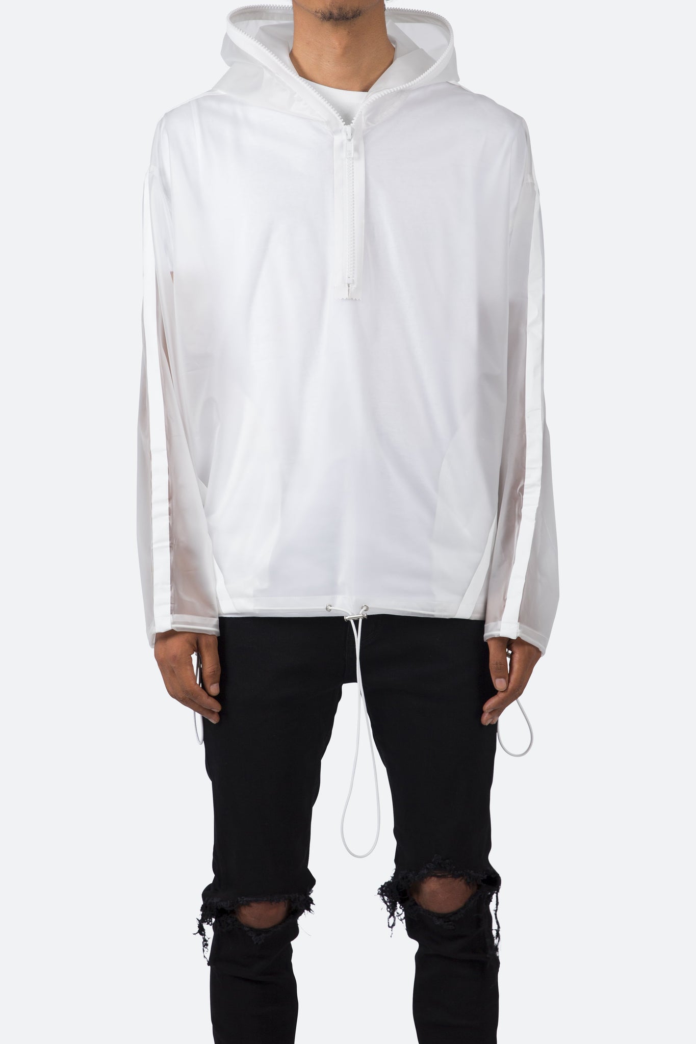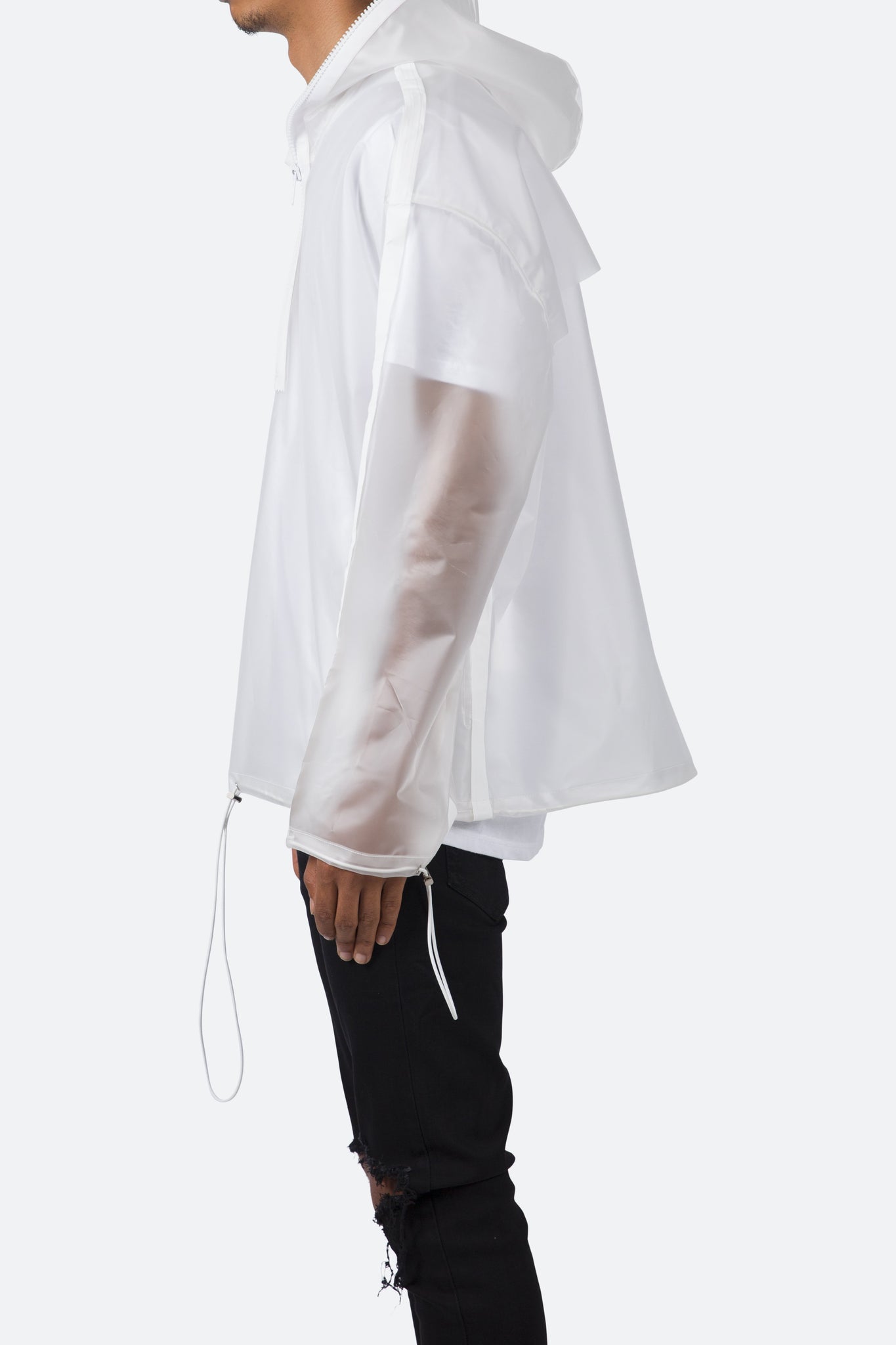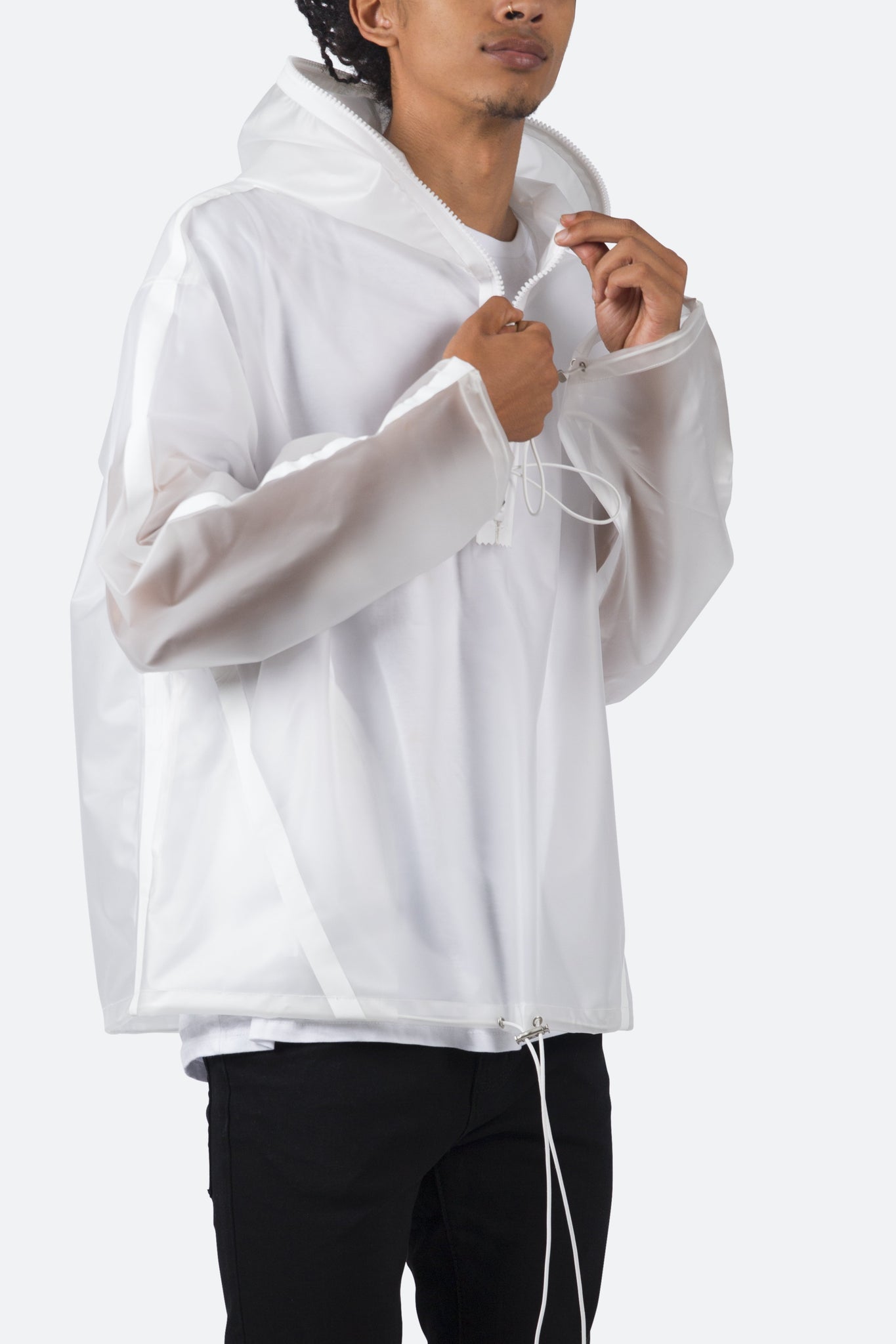 the Rubberized Half Zip is constructed in a relaxed fit, featuring half zip at the chest and hood, elastic cinch closures at the waist and wrists, taped seams, and is completed in a rubber-like polyester fabric.