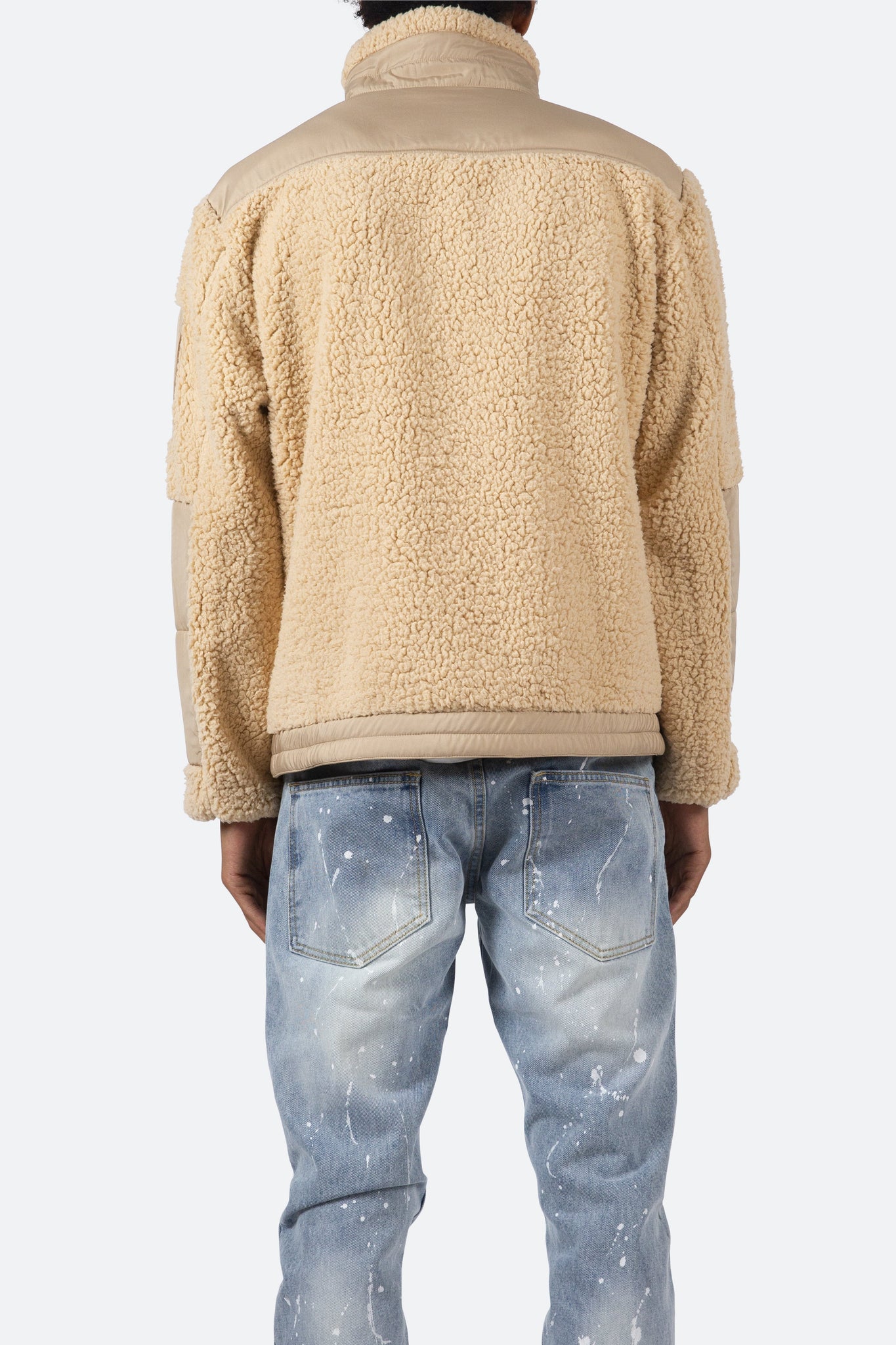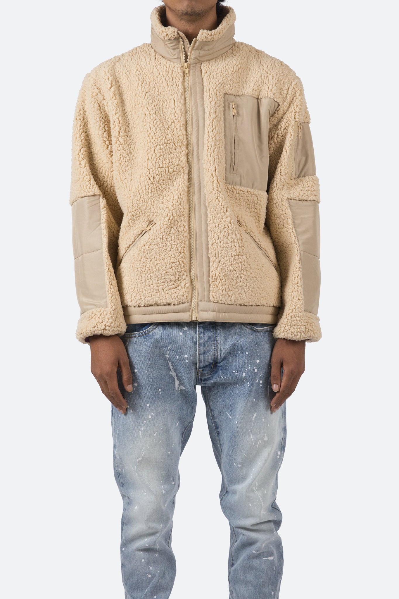the Tech Fleece Jacket is constructed from sherpa fabric and designed with a relaxed fit, a zipper placket, contrasting elastic at the wrists, a patch pocket on the chest from nylon, zipper welt pockets on the front, and finished with nylon paneling throughout.
