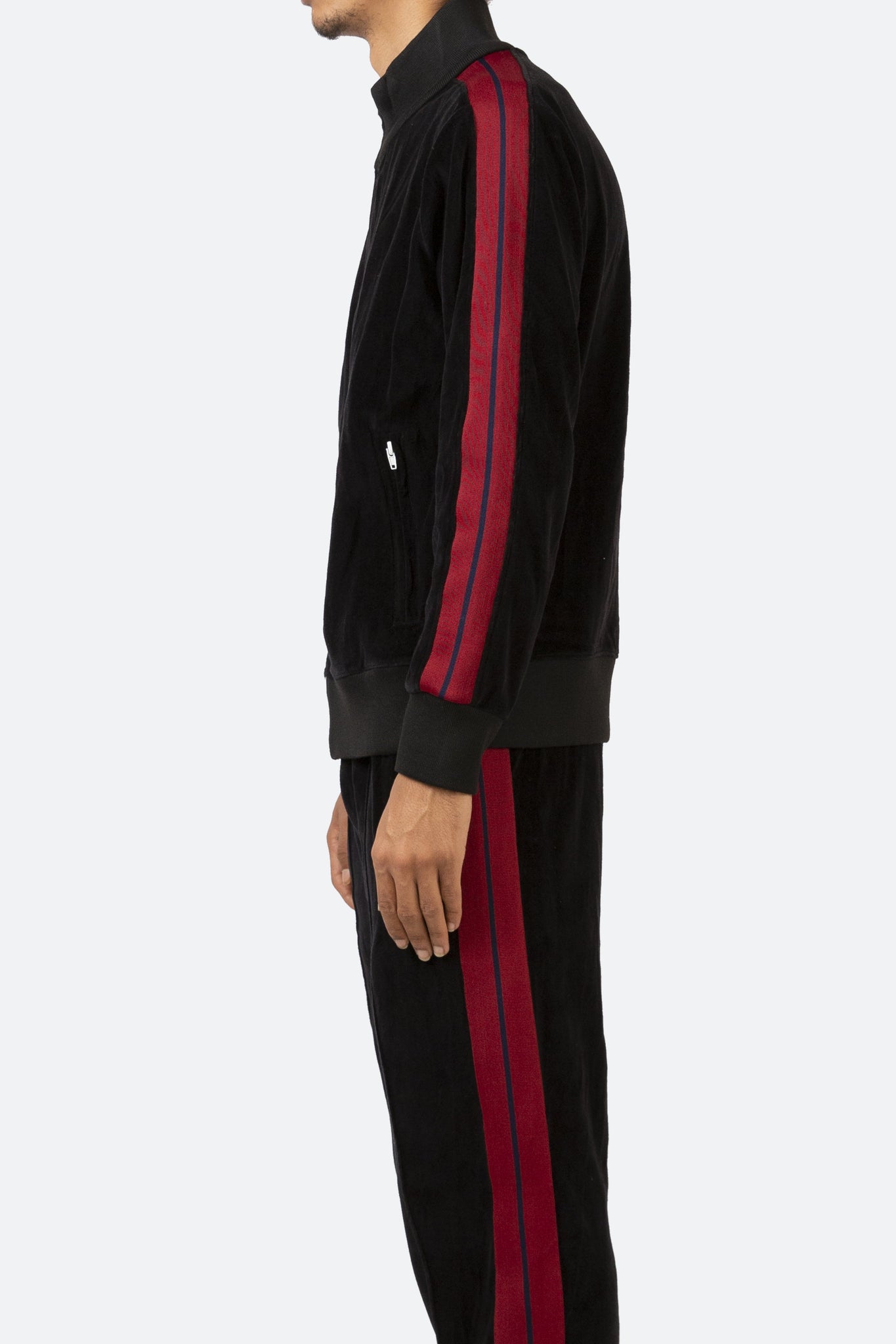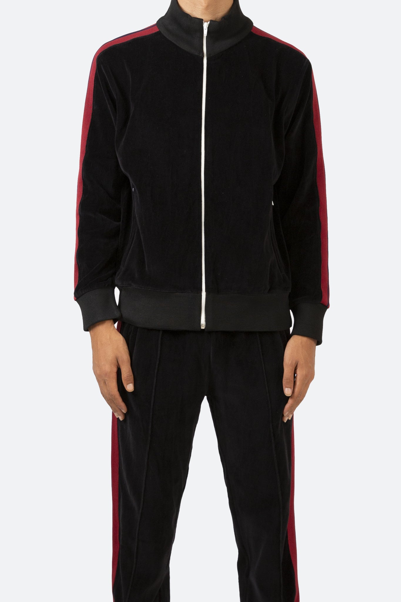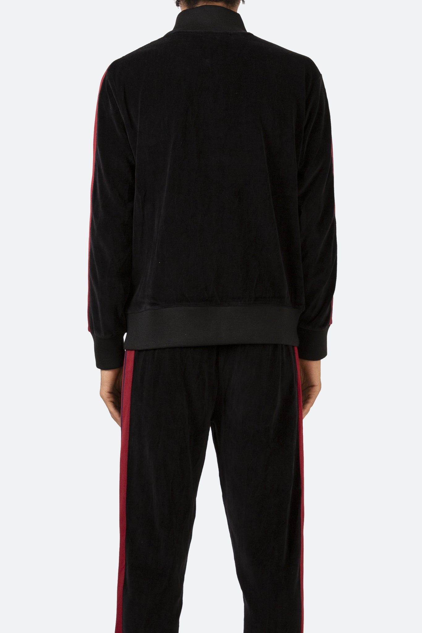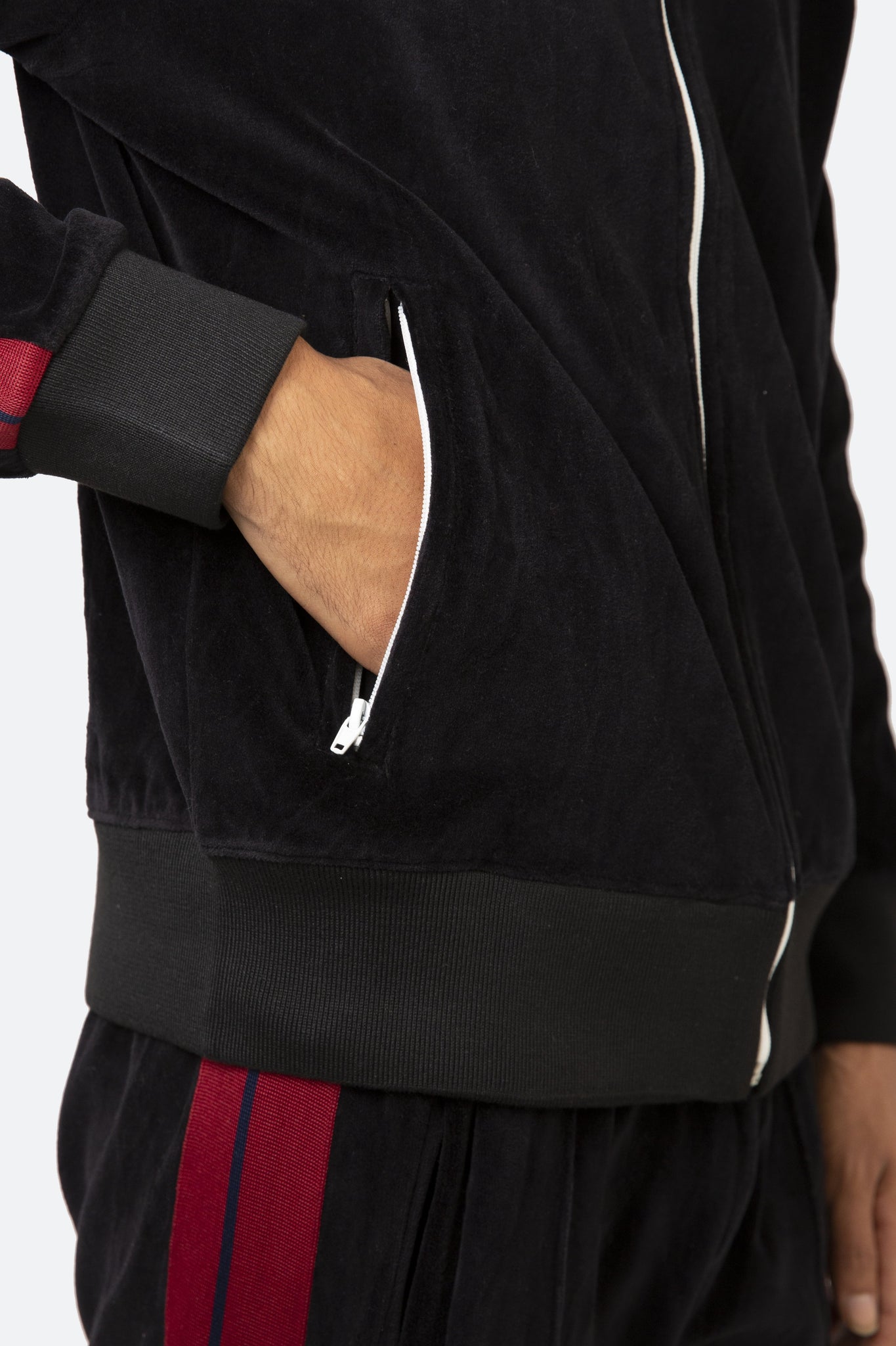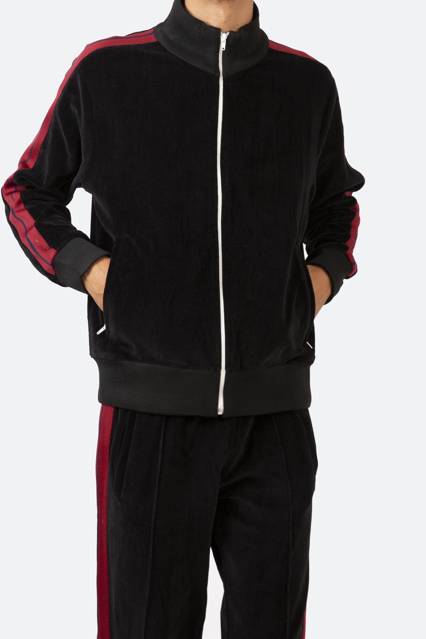 the Velour Track Jacket is constructed from polyester velour fabric and a striped contrast panel down the sleeves, tonal ribbing at the wrist, waist, and collar, plastic zipper down the front and at the pockets, and finished with a standard fit.