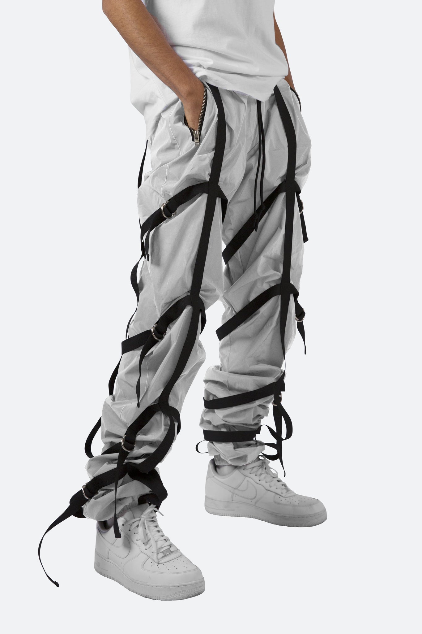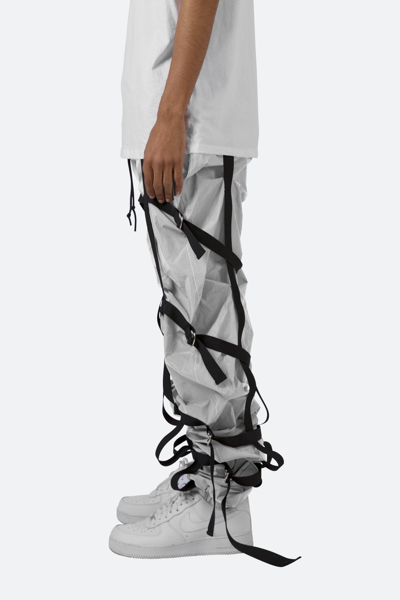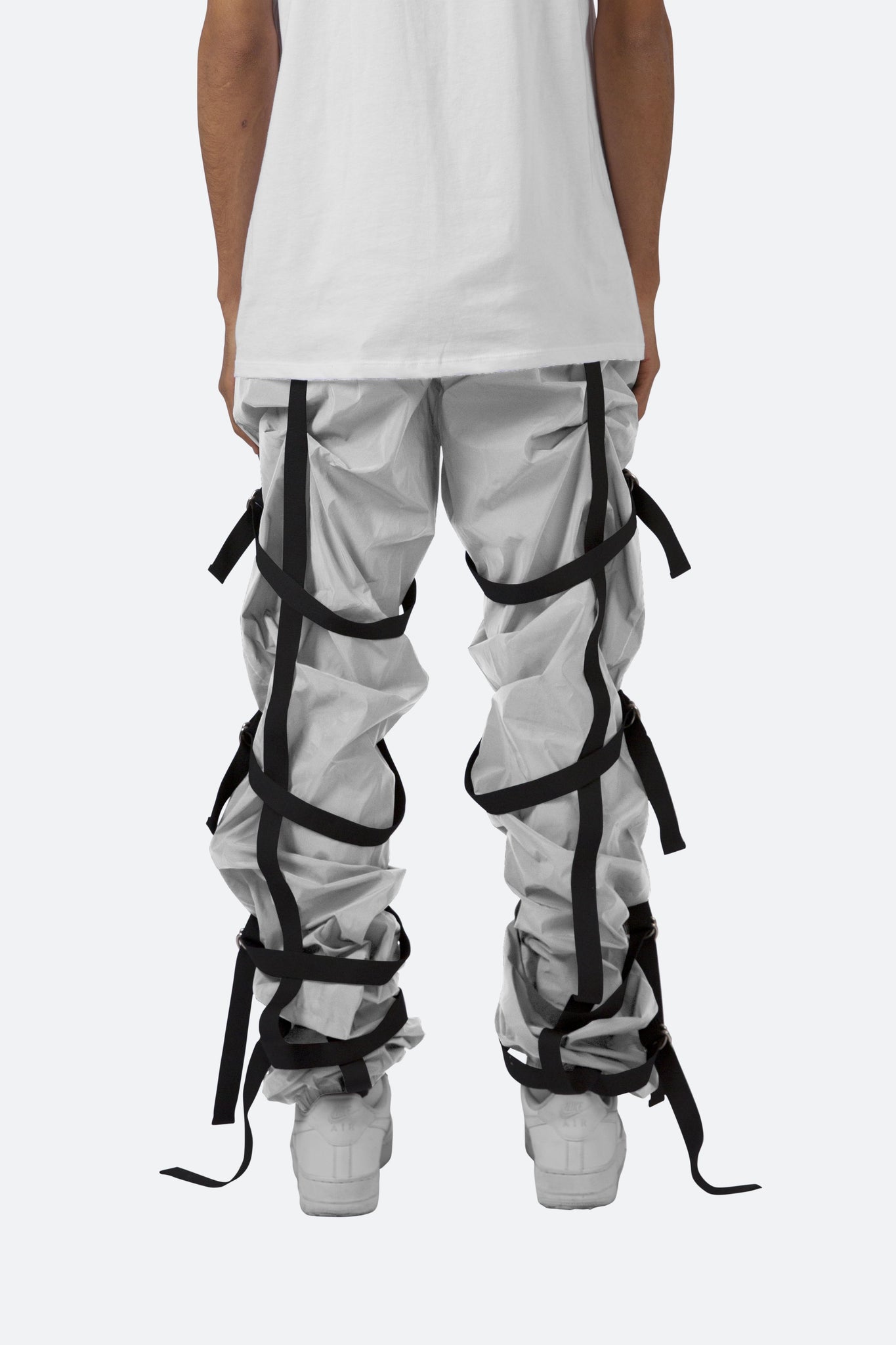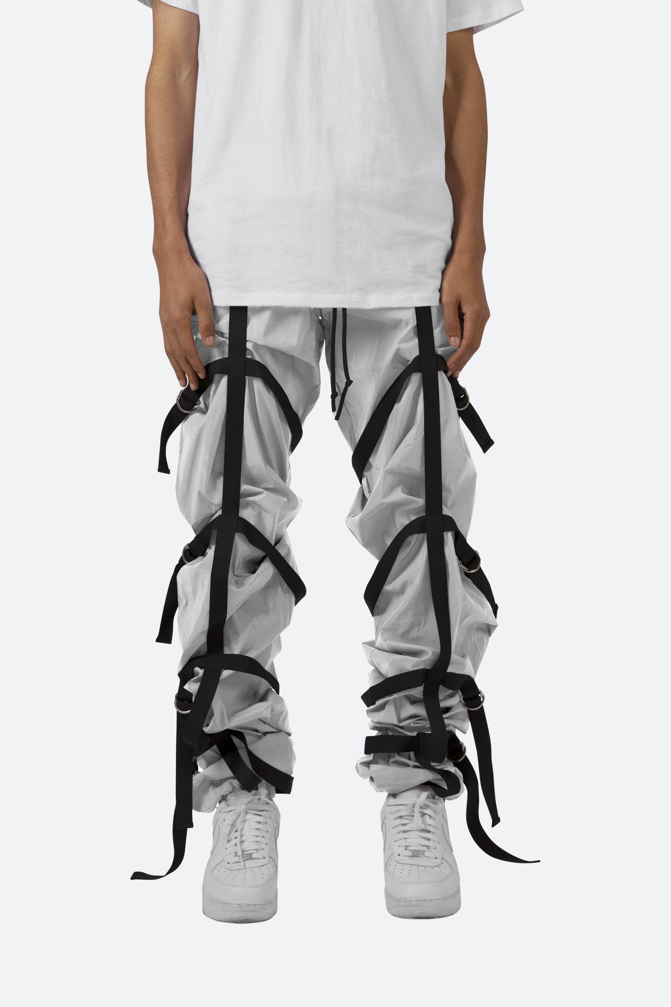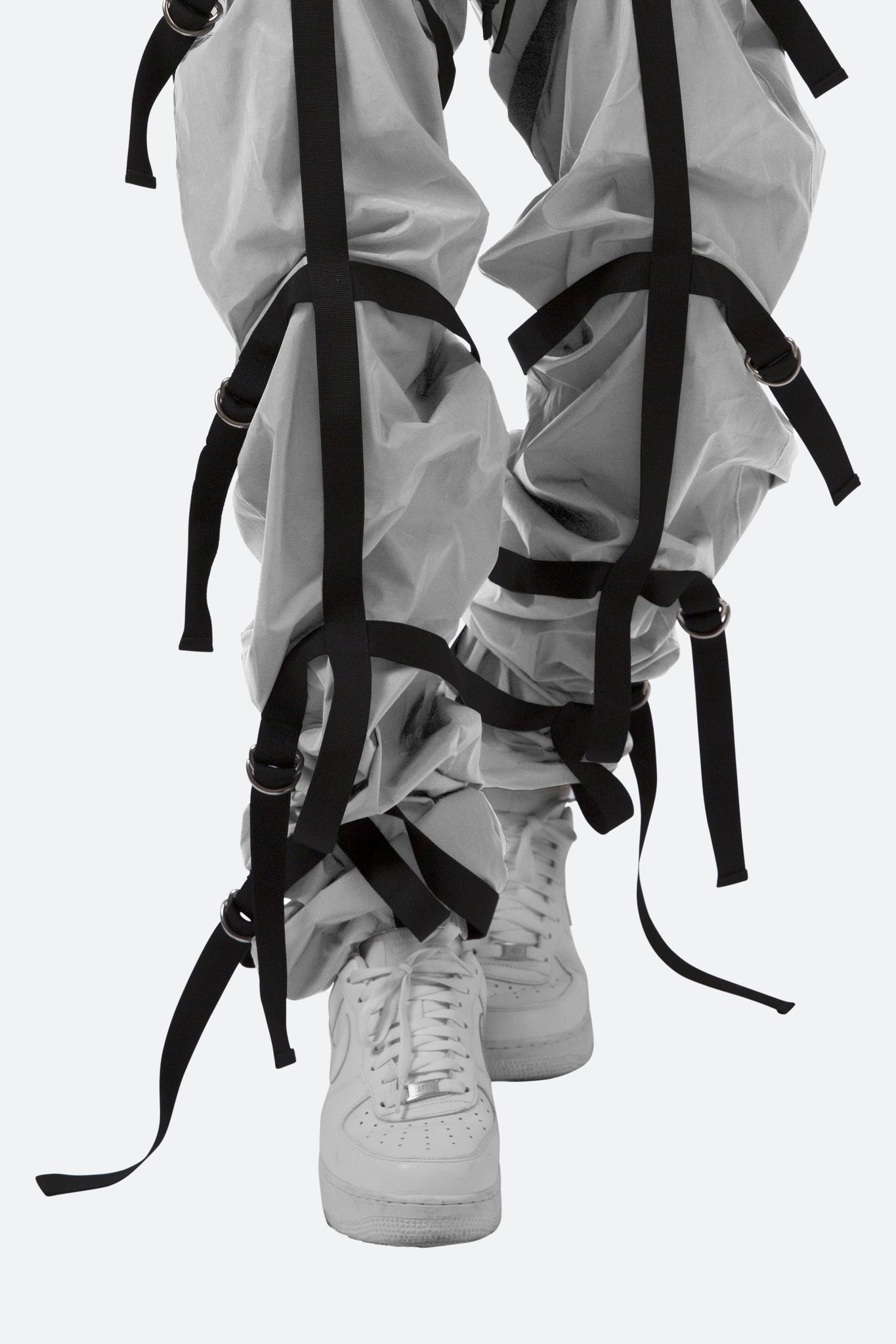 the Reflective Strapped Pants are designed with a custom-developed synthetic light reflective fabric and features zipper pockets at the waist, extended inseam for stacking through-out, and finished with webbed strapping and metal d-rings.
