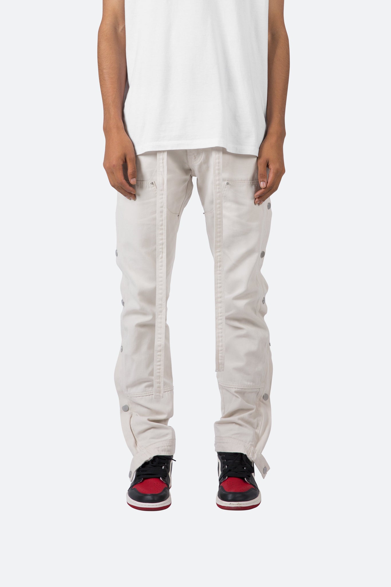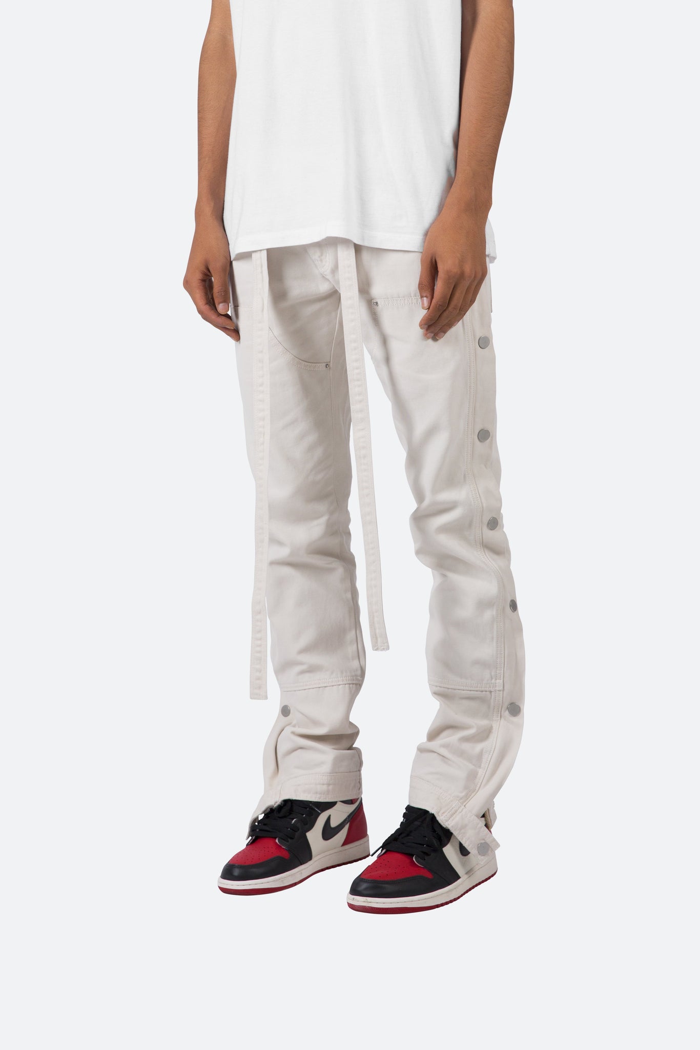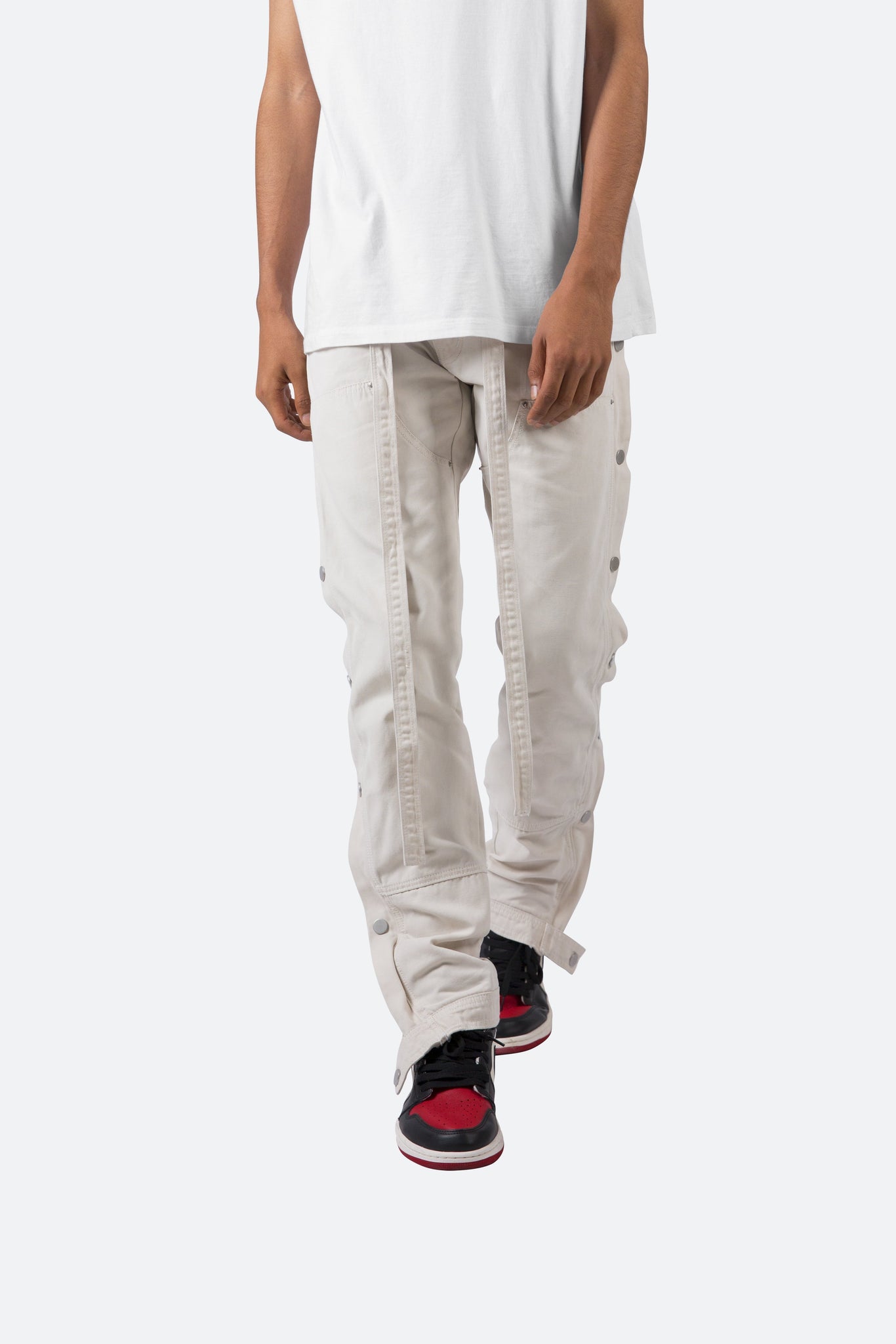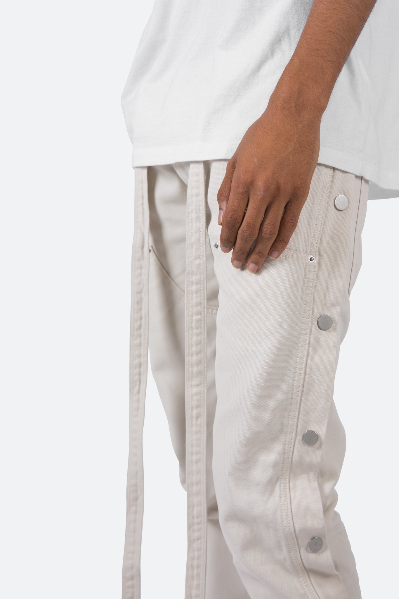 the Snap Western Pants are designed with a relaxed fit throughout, self-fabric paneling on the front with rivets, snap closures on the outseam with a 10" zipper underneath, and finished with a built in belt made of self material.