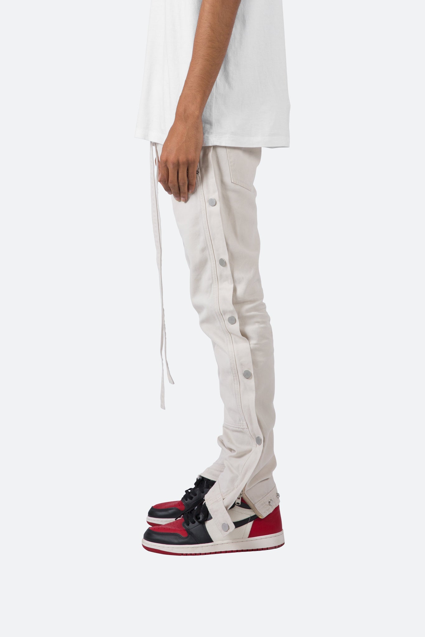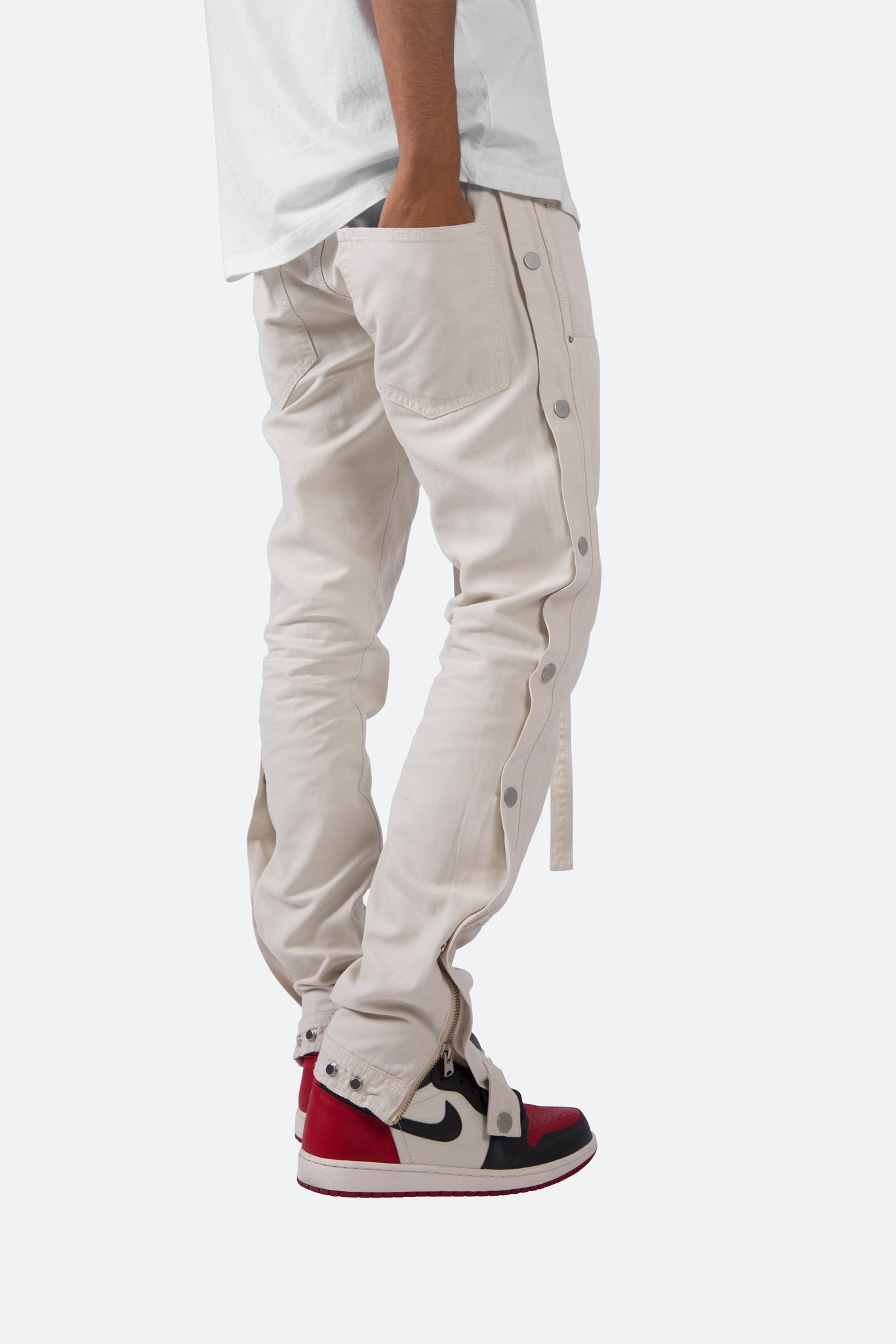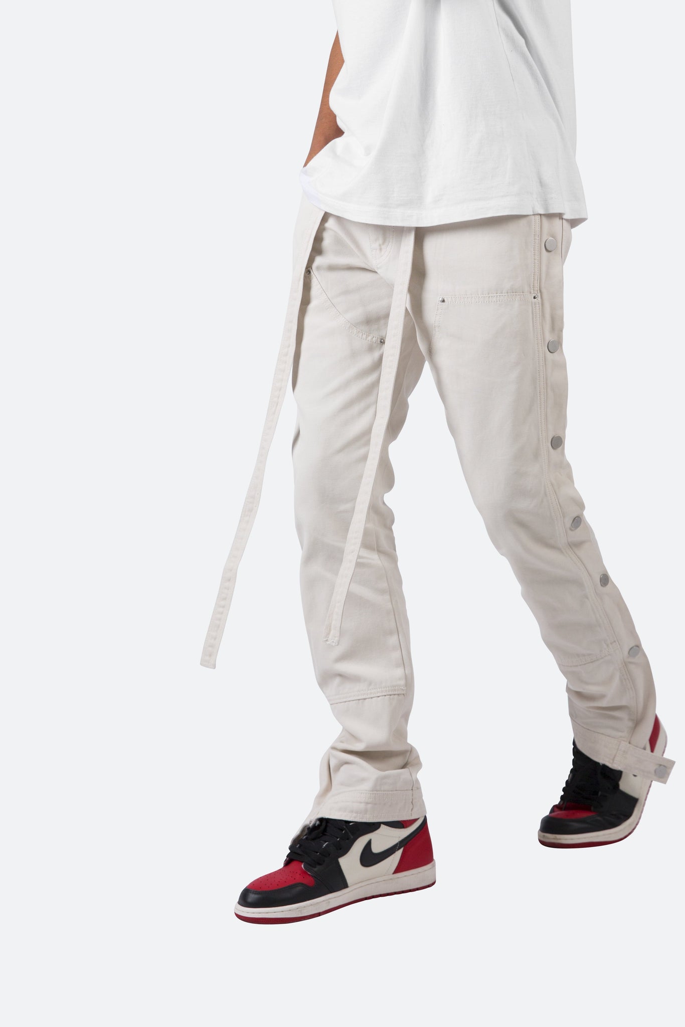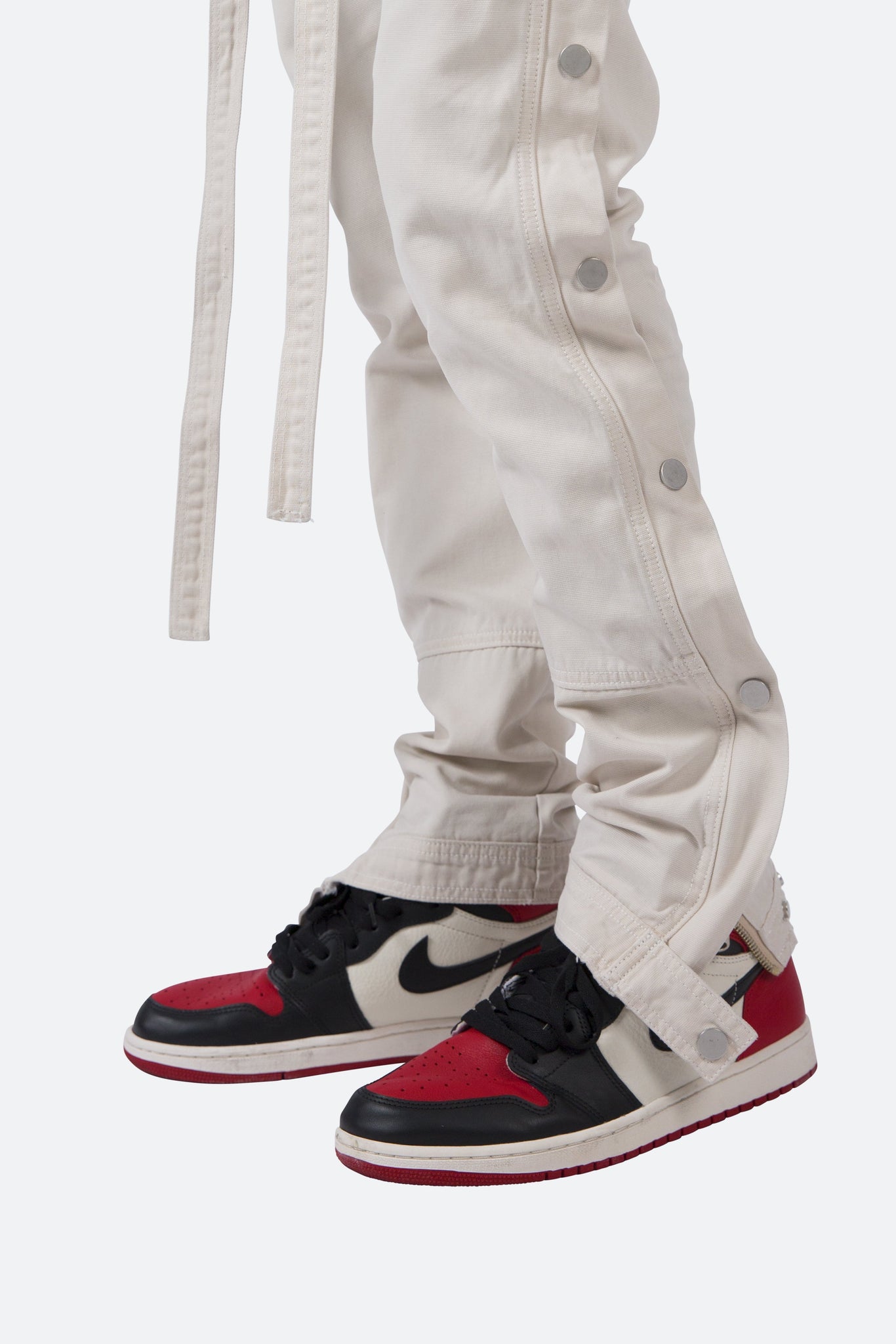 the Snap Western Pants are designed with a relaxed fit throughout, self-fabric paneling on the front with rivets, snap closures on the outseam with a 10" zipper underneath, and finished with a built in belt made of self material.