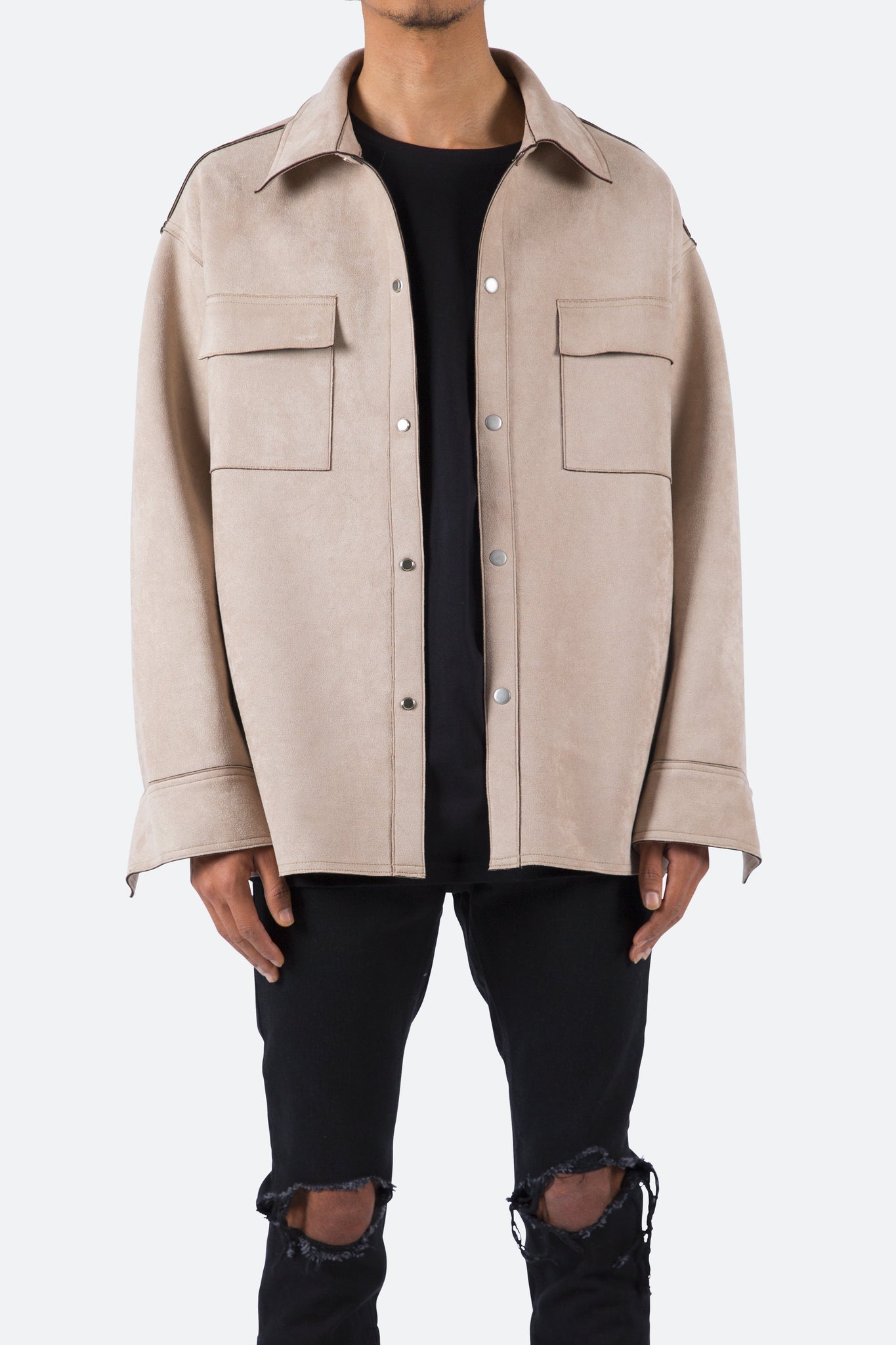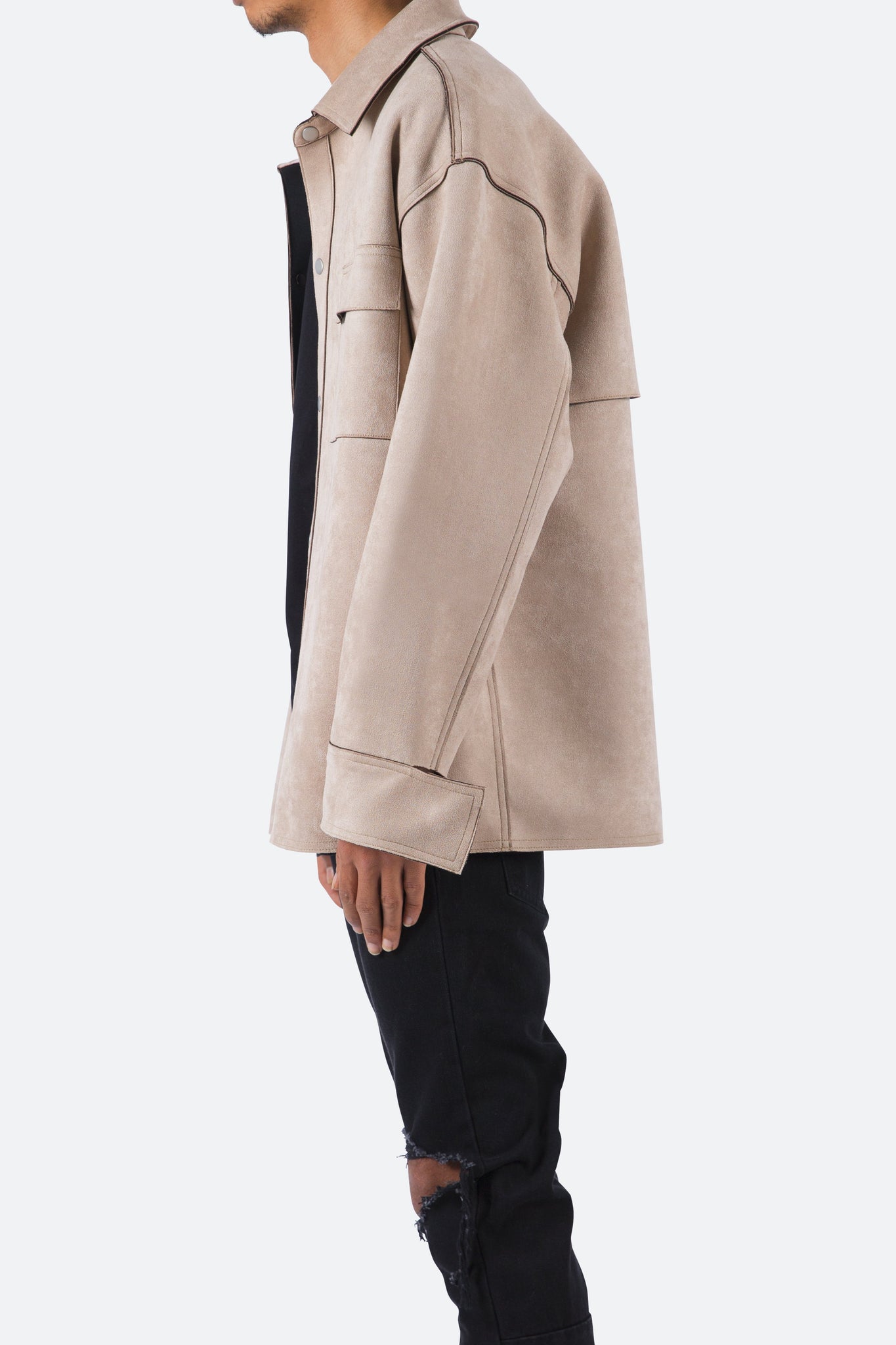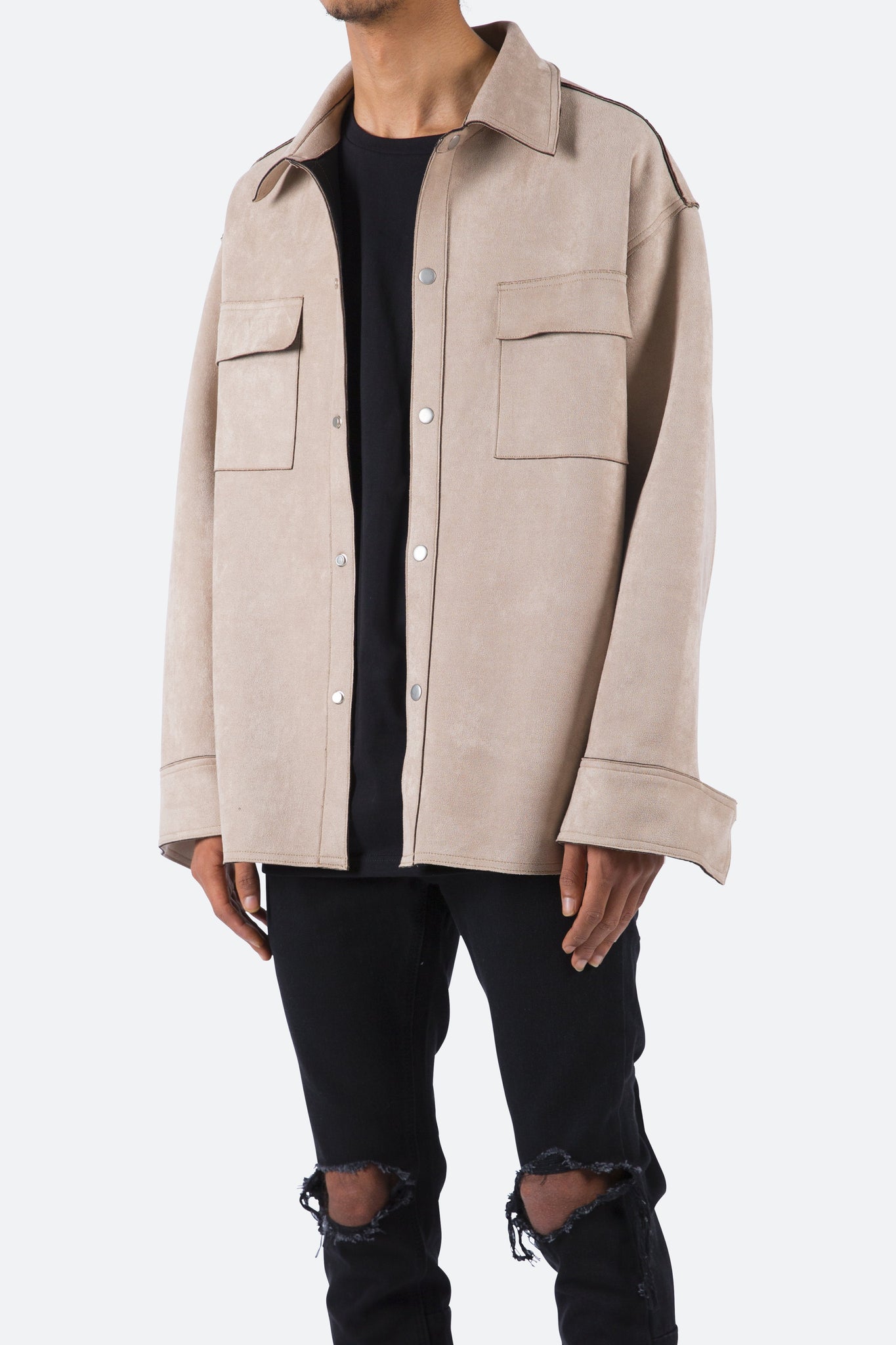 the Suede Work Shirt is designed with an oversized fit and features a drop shoulder sleeve construction, snap buttons at the placket, a flat hemline, extended wrist placket with snap closure, and finished with an open yoke in the back.
