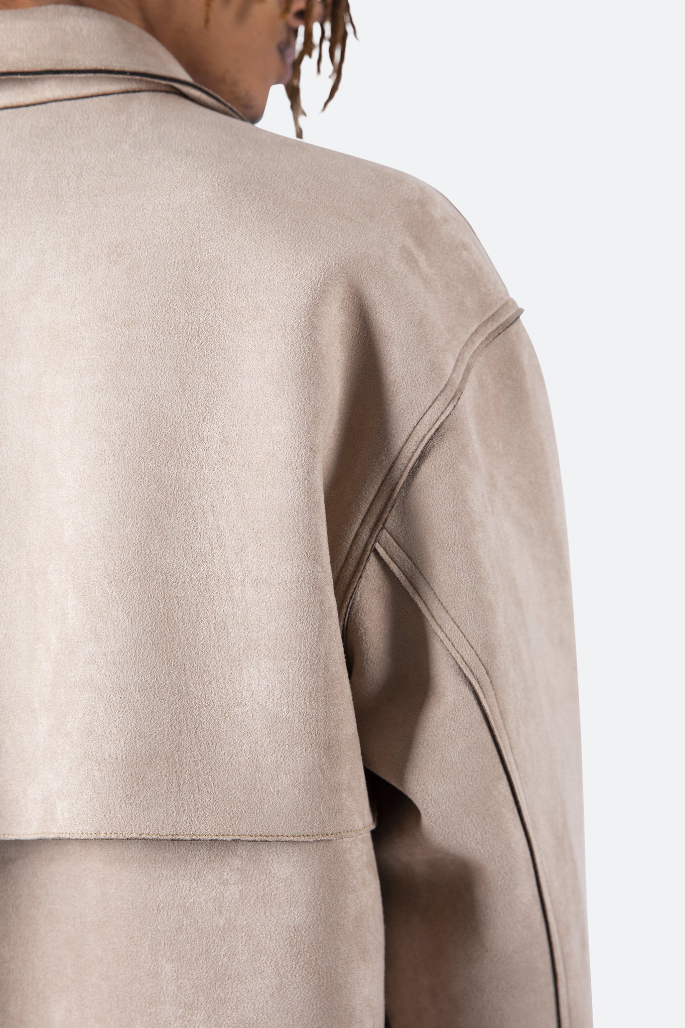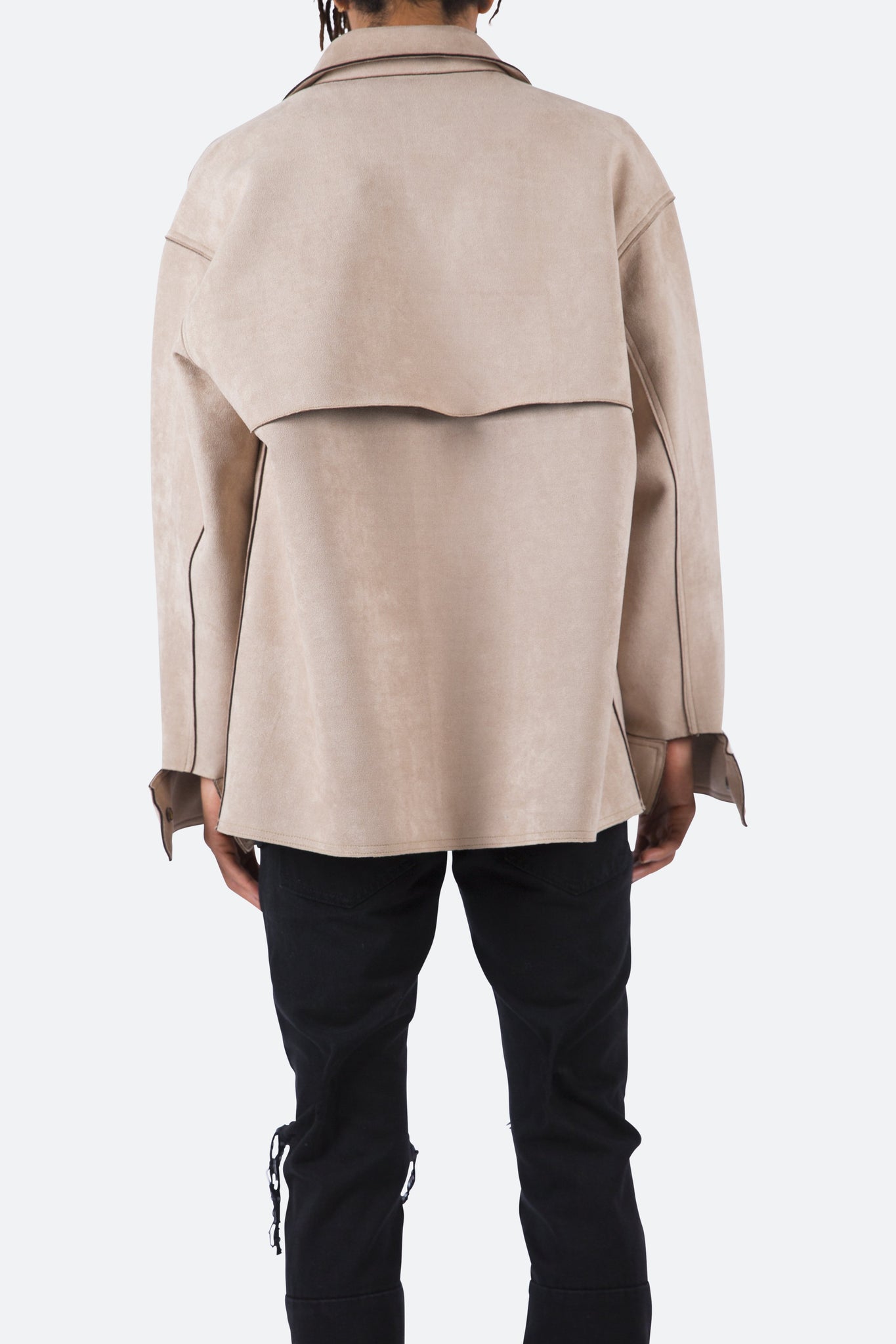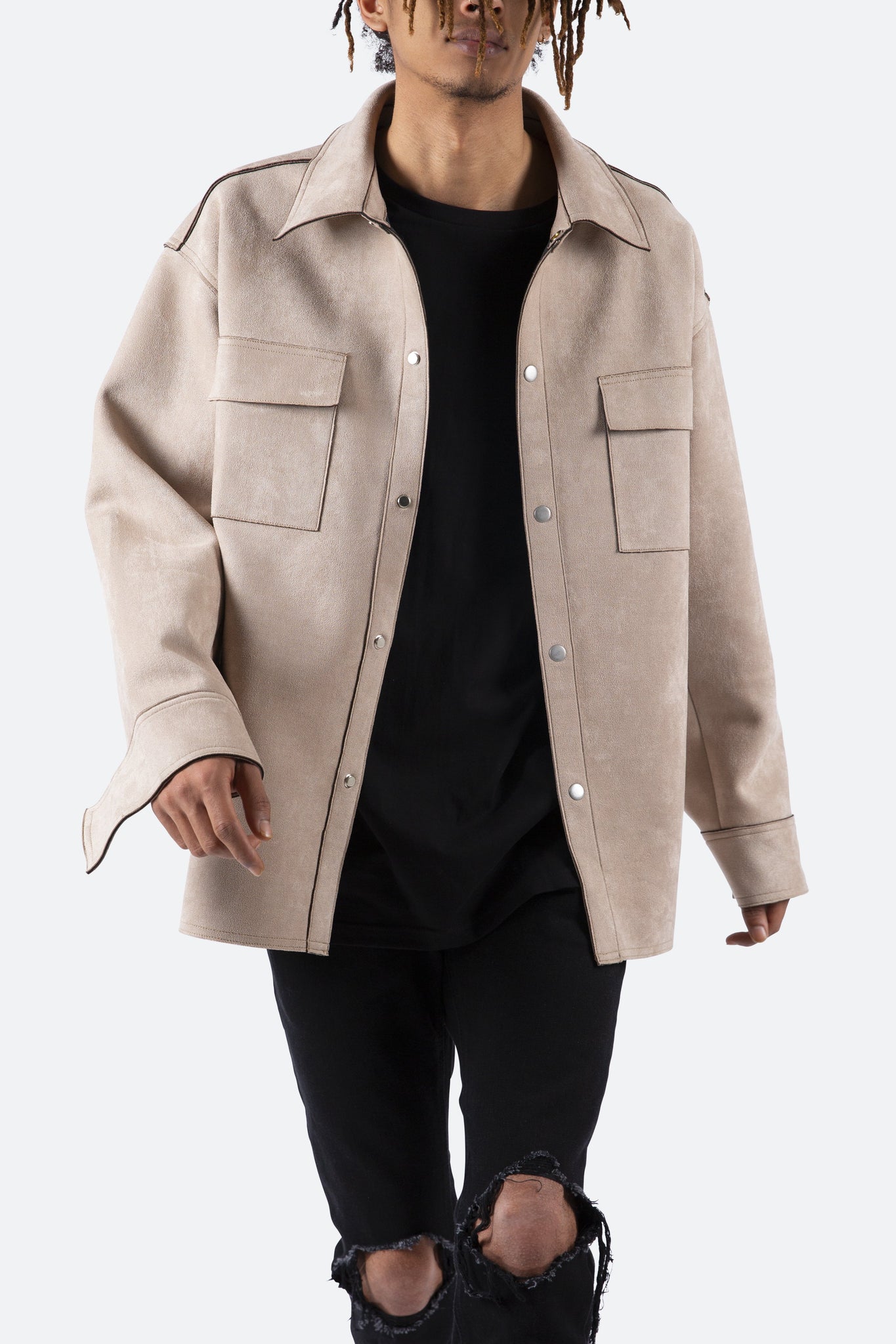 the Suede Work Shirt is designed with an oversized fit and features a drop shoulder sleeve construction, snap buttons at the placket, a flat hemline, extended wrist placket with snap closure, and finished with an open yoke in the back.