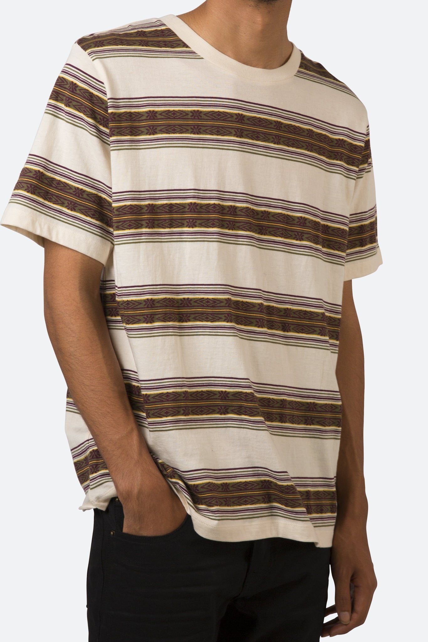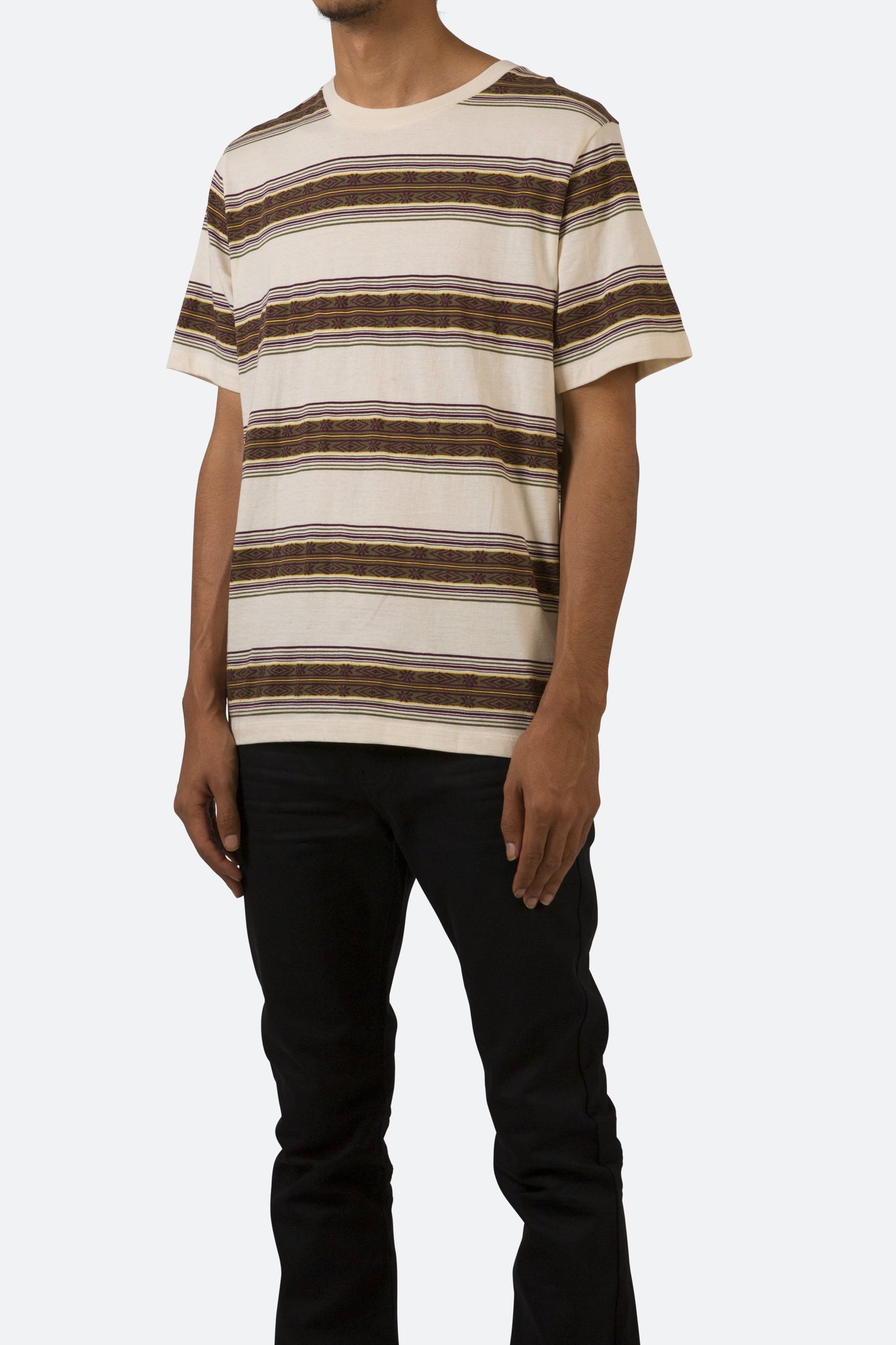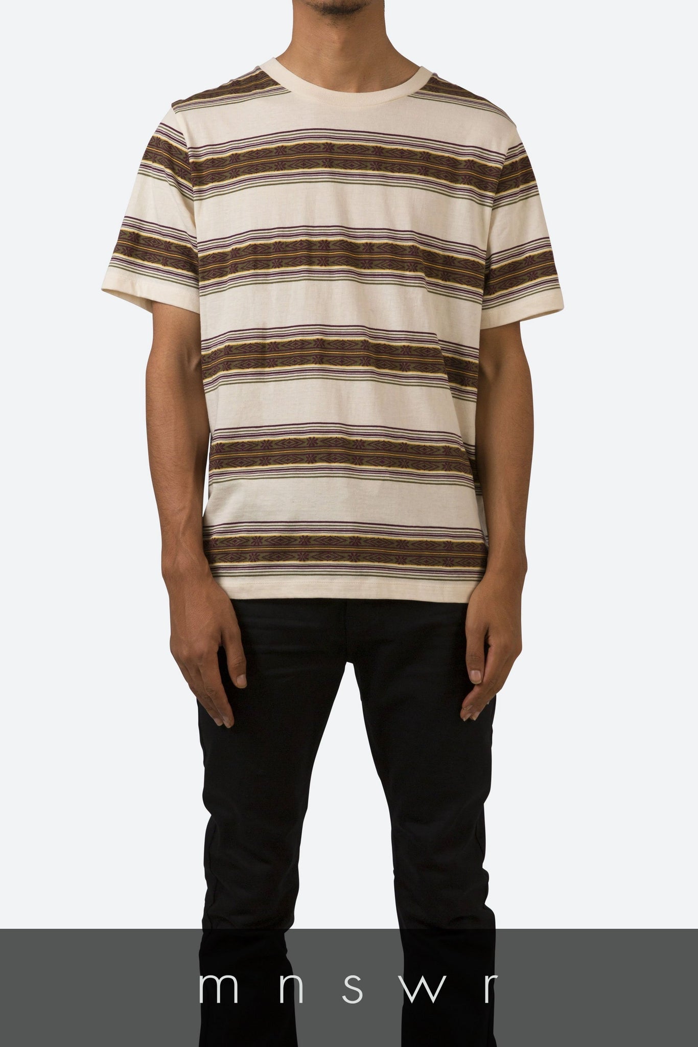 the Pattern Striped Tee features a slim fit, ribbing at the neck, a standard hem, and is constructed from a custom striped fabric.