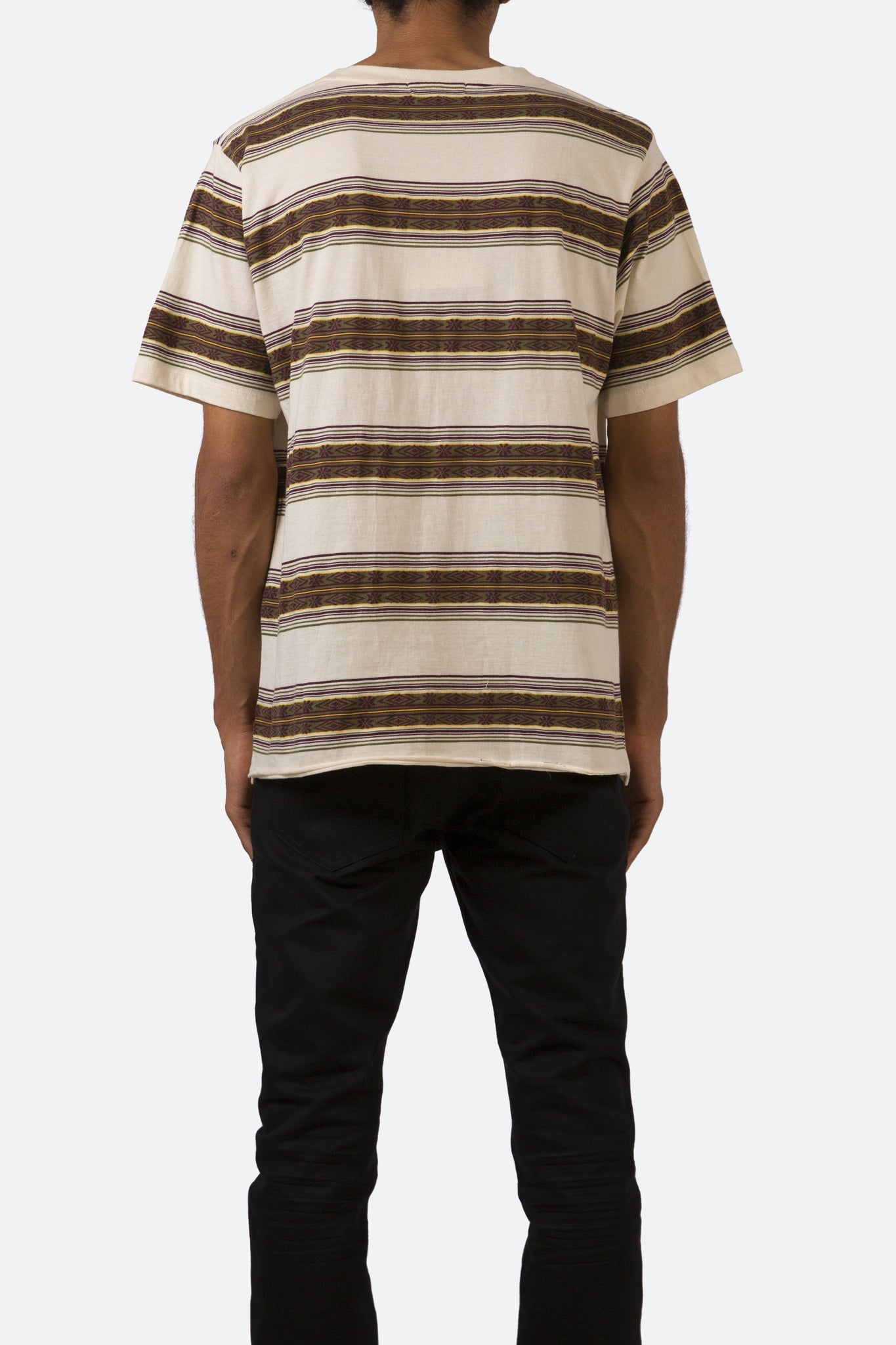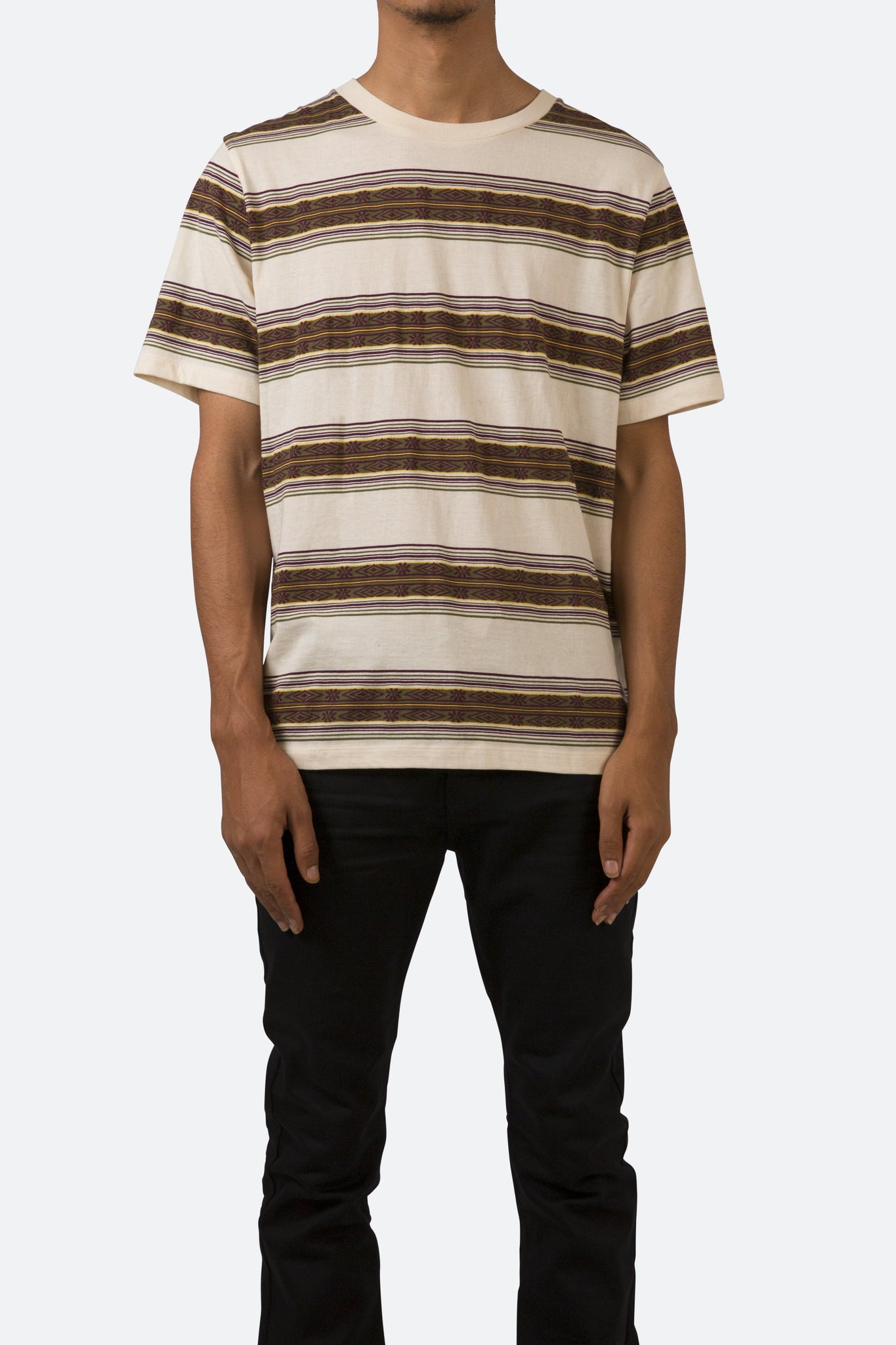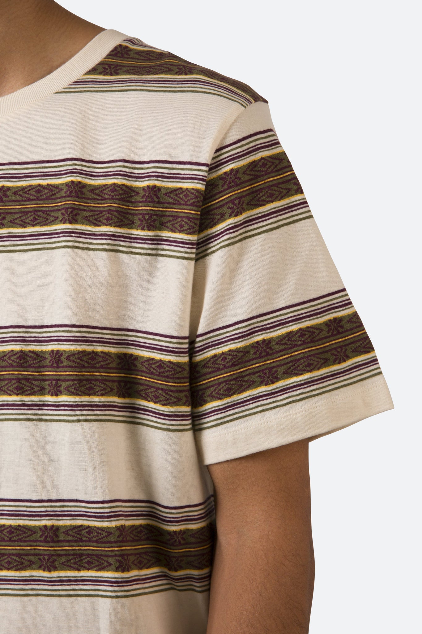 the Pattern Striped Tee features a slim fit, ribbing at the neck, a standard hem, and is constructed from a custom striped fabric.